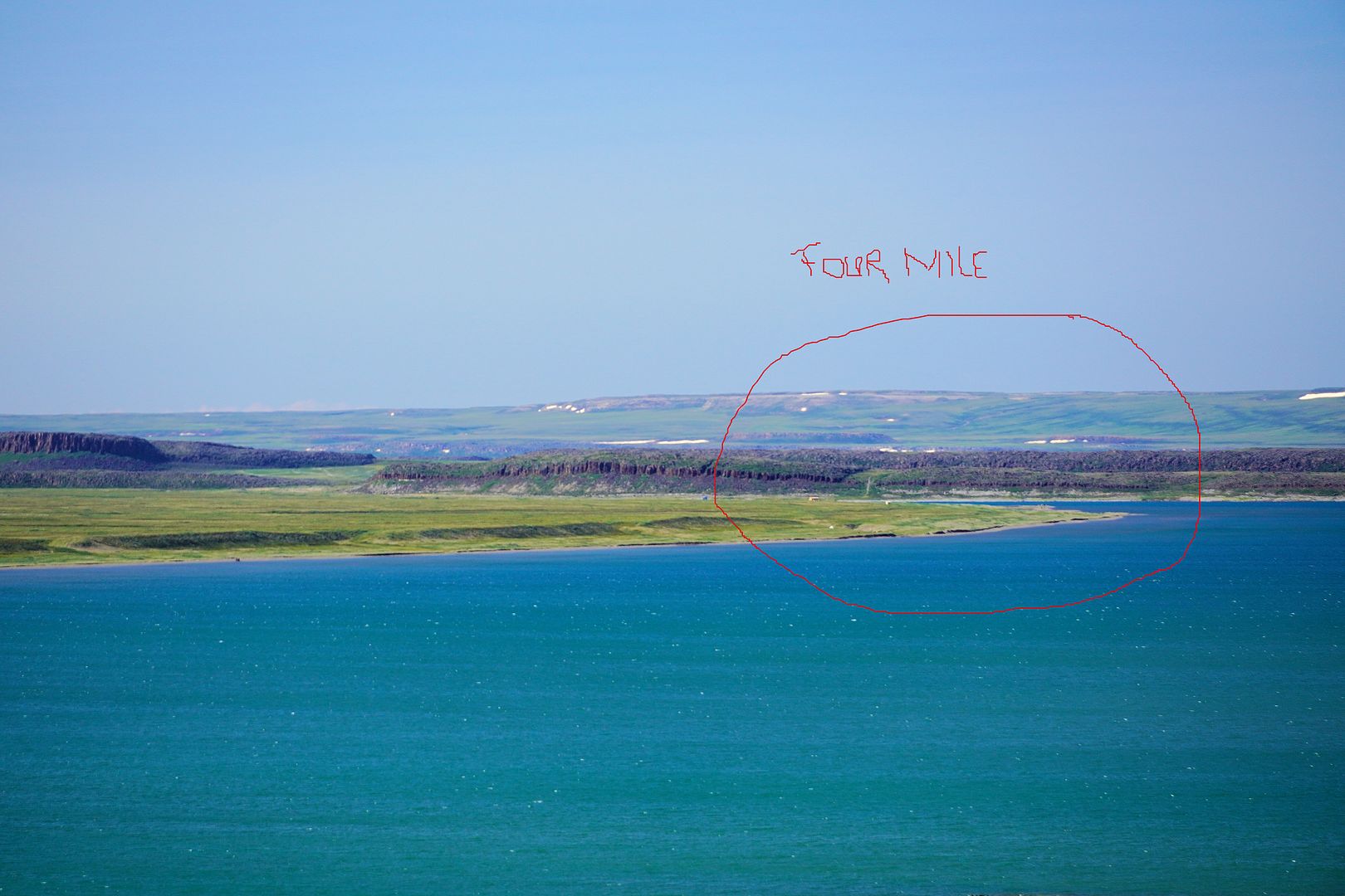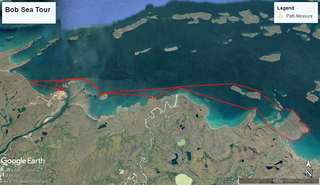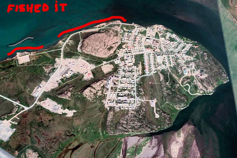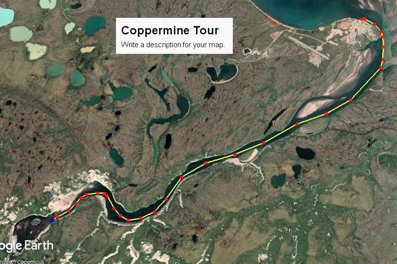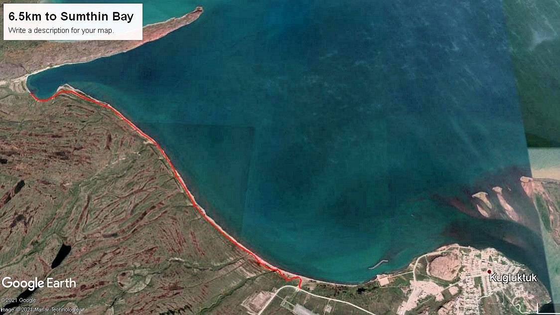 Friday night I sat awhile at the computer to search over Google Earth. There were two places in mind to fish, one and most importantly was Bloody Falls (image 1 below) lying inland up the Coppermine River, the other was out the coastline west (image 2) towards First and Second Points, and Four Mile Bay, With Google I was able to map, plot the courses and measure my distances. At different parking areas on the outskirts of town, the Bloody is 10 to 13km one-way and Four Mile Bay 6.5km. The end of First Point is 10+km.