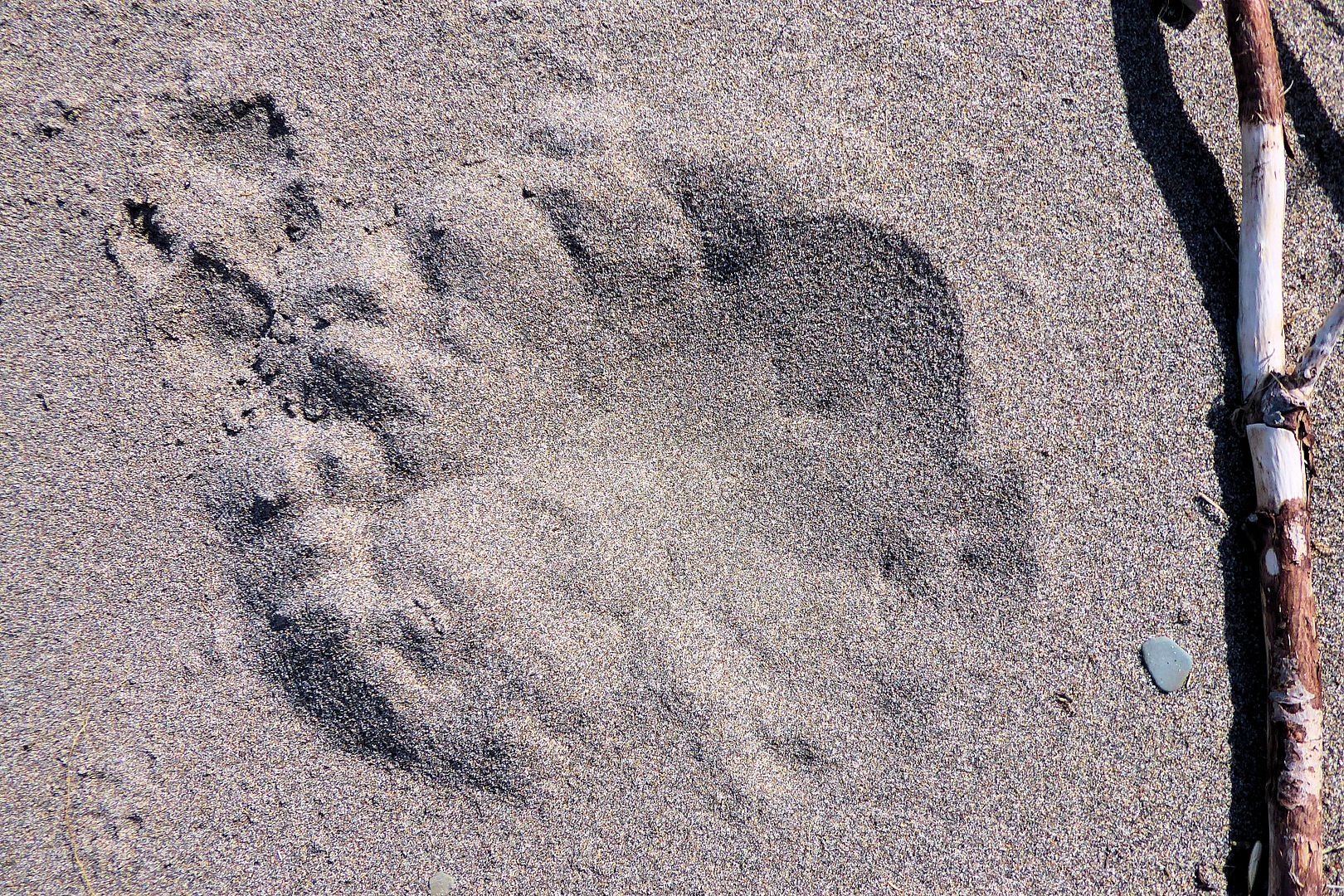 In one happy state of awe I marveled over the encounter, turned my video camera on a minute to bring it up too. A complete stranger looking out for my safety, it means something in the big cosmos of things. Not a few minutes further on up the beach did I notice some prints in the sand. The small marking there off the toes of the bigger one were made by a dog… the other a grizzly.