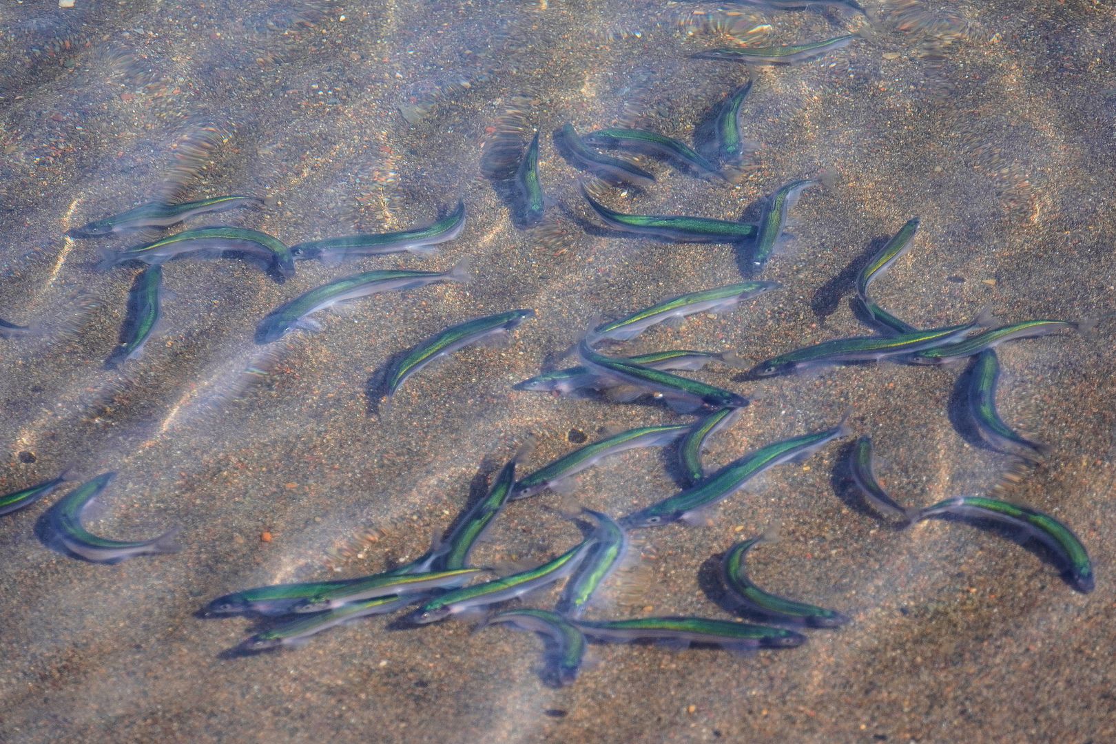 Before spotting the seal during my meal I had already noticed what it was after in the water. Once entering the bay, crossing the creek, there in the flattest, calmest, shallowest of sandy shoreline water were schools and schools of minnow. Capelin!