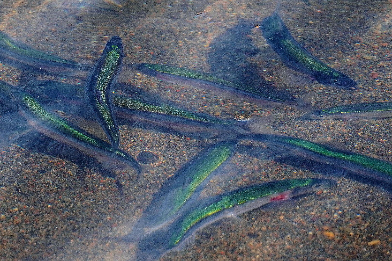 Knowledge of this baitfish had been foreign to me until Allan at the Wildlife Office had brought it up. These absolutely stunning little fish have incredible green backs, yellowish top sides and silver under bellies. Most I viewed in the shallows were anywhere from 3 or 4 inches long, averaging about 5 or 6 but with some pushing 8 or maybe even 9. They were just on top of one another as like Allan had said, it’s their time to spawn… and when they’re in shallow any single or schools of char that get hungry will move in on them to feed, sometimes attacking them right at the shore. That’s what I kept an eye out for, the moving “V” wakes of shallow cruising, silvery char on the feed. But I didn’t see any.