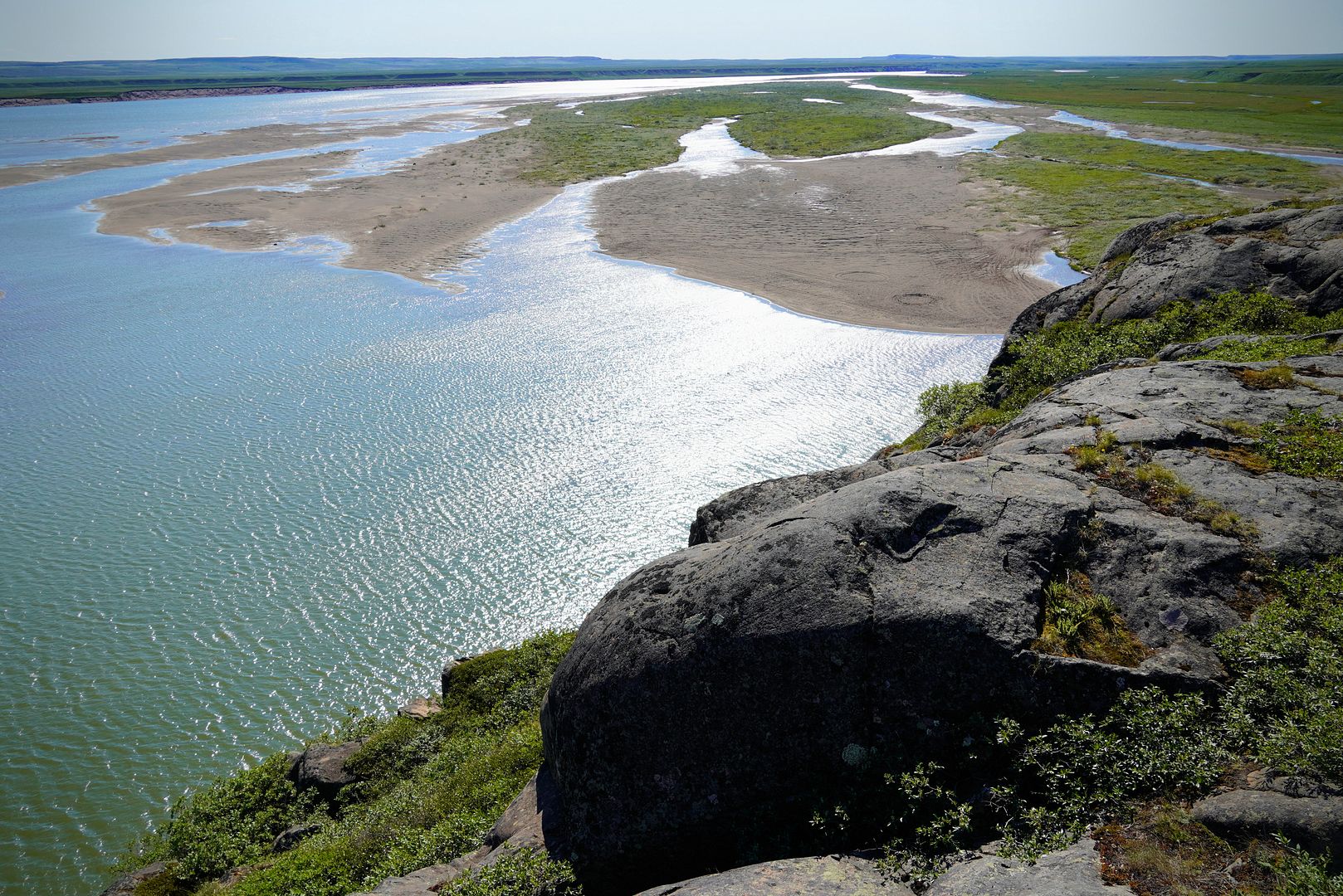 His whole family was coming out, almost the whole family. Bob had changed plans from Bloody Falls to a ride east along the coastline, apparently char were moving out that way and being caught. Before going too far from town, an island at the mouth of the Coppermine was to be the drop off point for his wife Carol and the kids. We would see them again later in the evening.