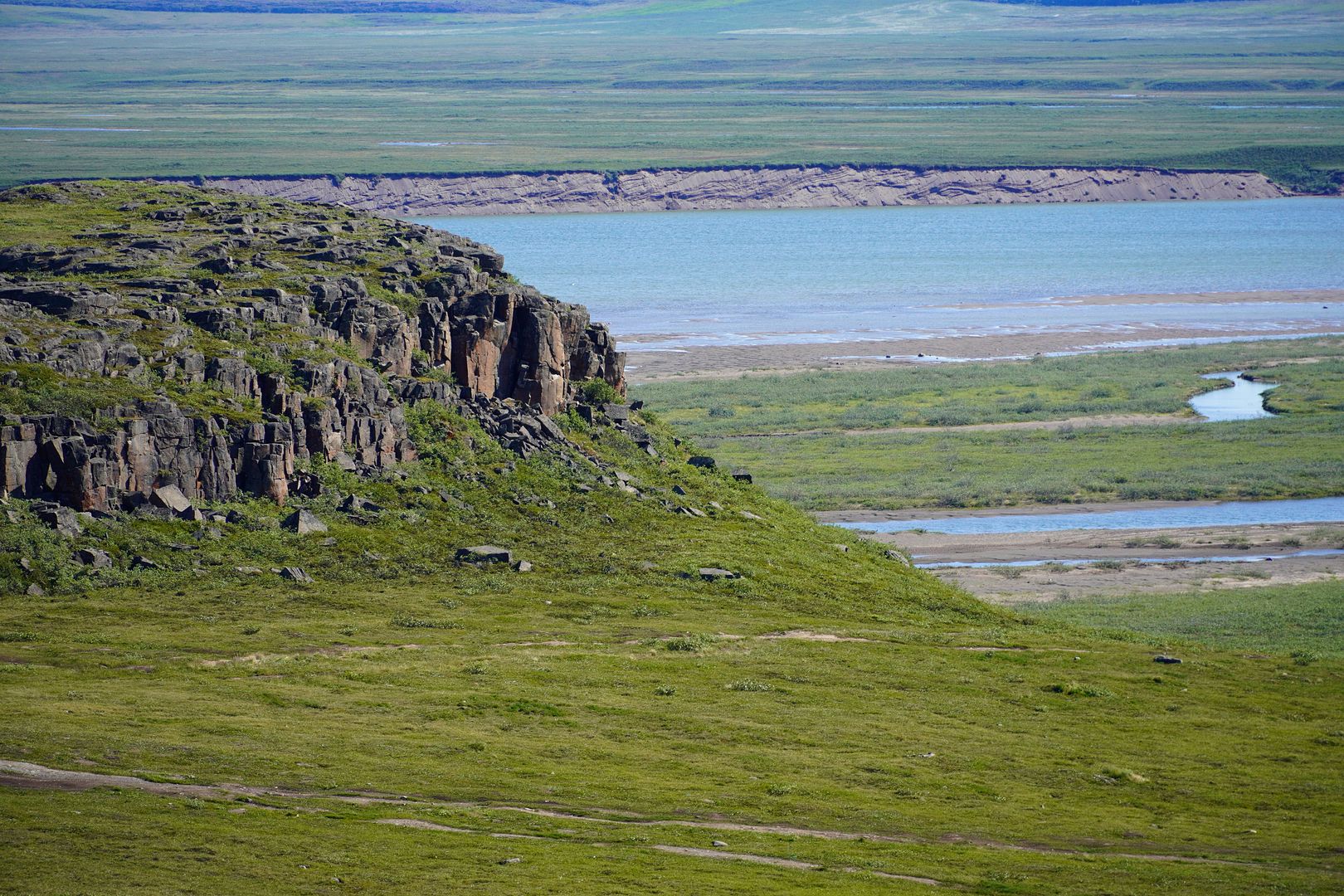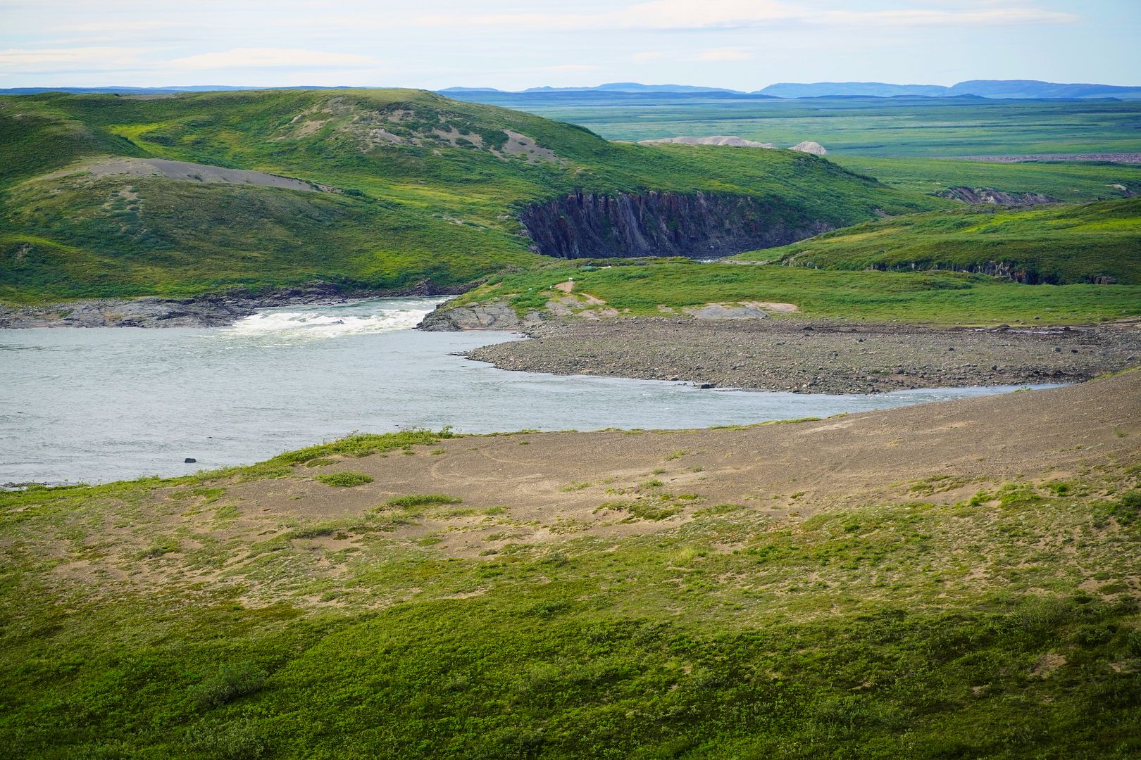 The truck road ends between Heart Lake and “S” Lake, both easily identifiable on the map. After this, a marked ATV/hiking trail indicating how many kilometers have been traveled takes over. It’s bumpy in spots with plenty of little creek bridge crossings and, even some long boardwalks that pass over really hard riding shitty tundra turf. Although only a 13km distance, with stops for photographs and a few areas requiring slow navigation, the first trip there only took over an hour. As Bloody Falls was approached, still three kilometers away, panoramic views along the route became frequent. In these pics below, Heart Lake comes first, then several stops above the Coppermine River as it peers down at Bloody Falls.