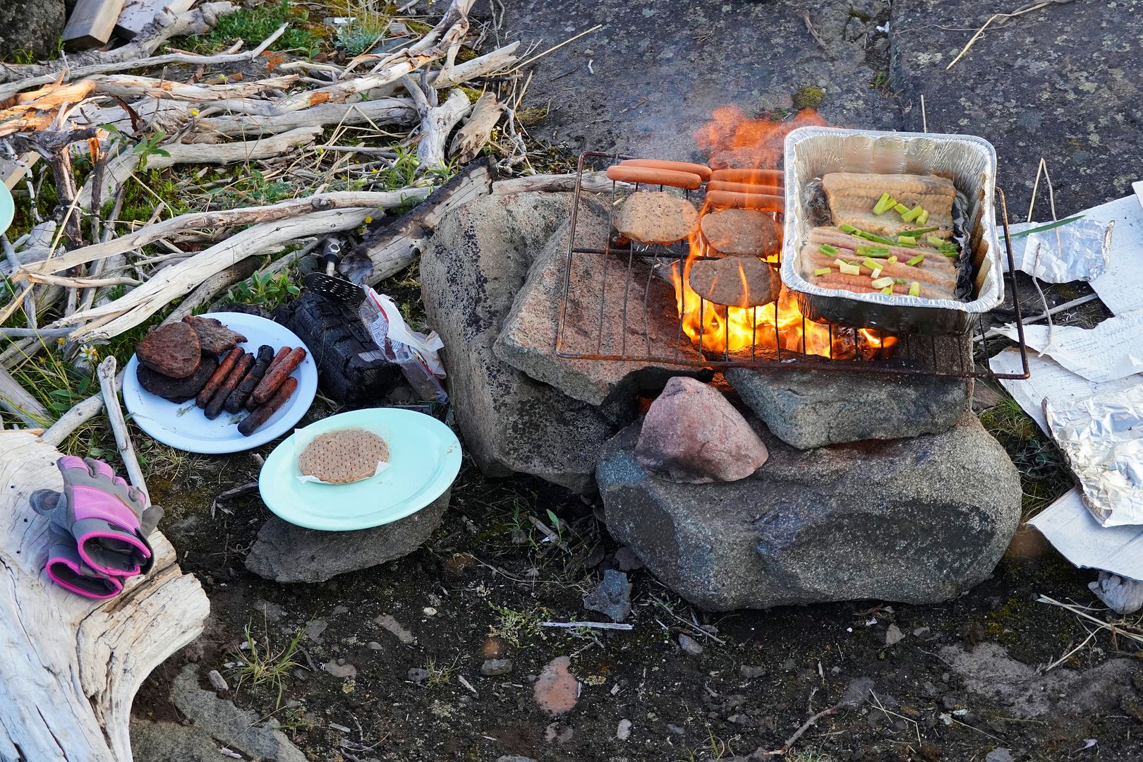 Carol had been preparing the dinner and starting a fire before we arrived. Wood is not something easy to come by in Nunavut but, Kugluktuk and Bob seem to have a good supply. Carol cooked away, the hordes of mosquitoes on land likely unimaginable to most southerners. Char, dogs, burgs and salad away from the bugs inside the cabin, all on the menu. The family, Bob, Carol, the kids, Bob and his daughter and myself, it was a wonderful evening.