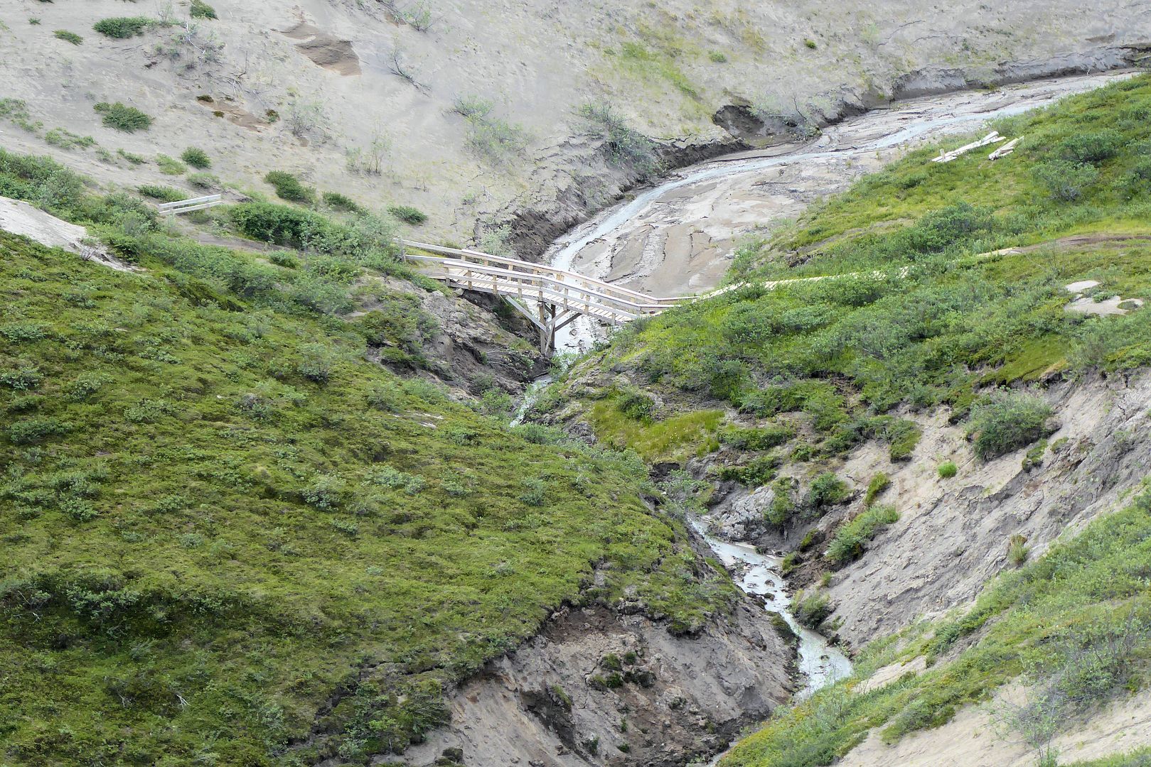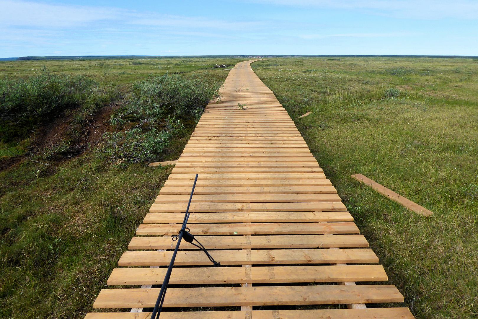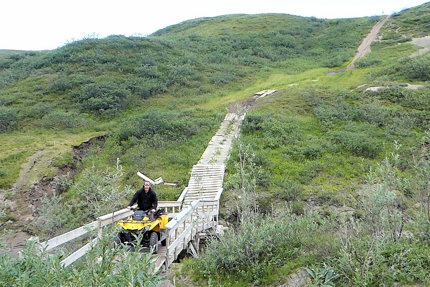 I arrived at the park boundary to the signs posted there. The trail beyond is a “use at your own risk” kinda deal. The Hamlet of Kugluktuk is working at building more long boardwalks to stretch from the signs onward a couple more kilometers to the falls, but it’s not near complete. On route there would be one sandy esker, a hill that dives downward to a sketchy looking bridge. Some ATV’ers do choose not to go down the hill and over that bridge. But, a little nervously I locked up both brakes and just skidded down that sandy slope, there was no stopping forward momentum after beginning, it was steep. At the bridge I parked a moment, took a good look at it and just didn’t feel like today was my day to die. It’s in pretty good shape actually, so over I went.