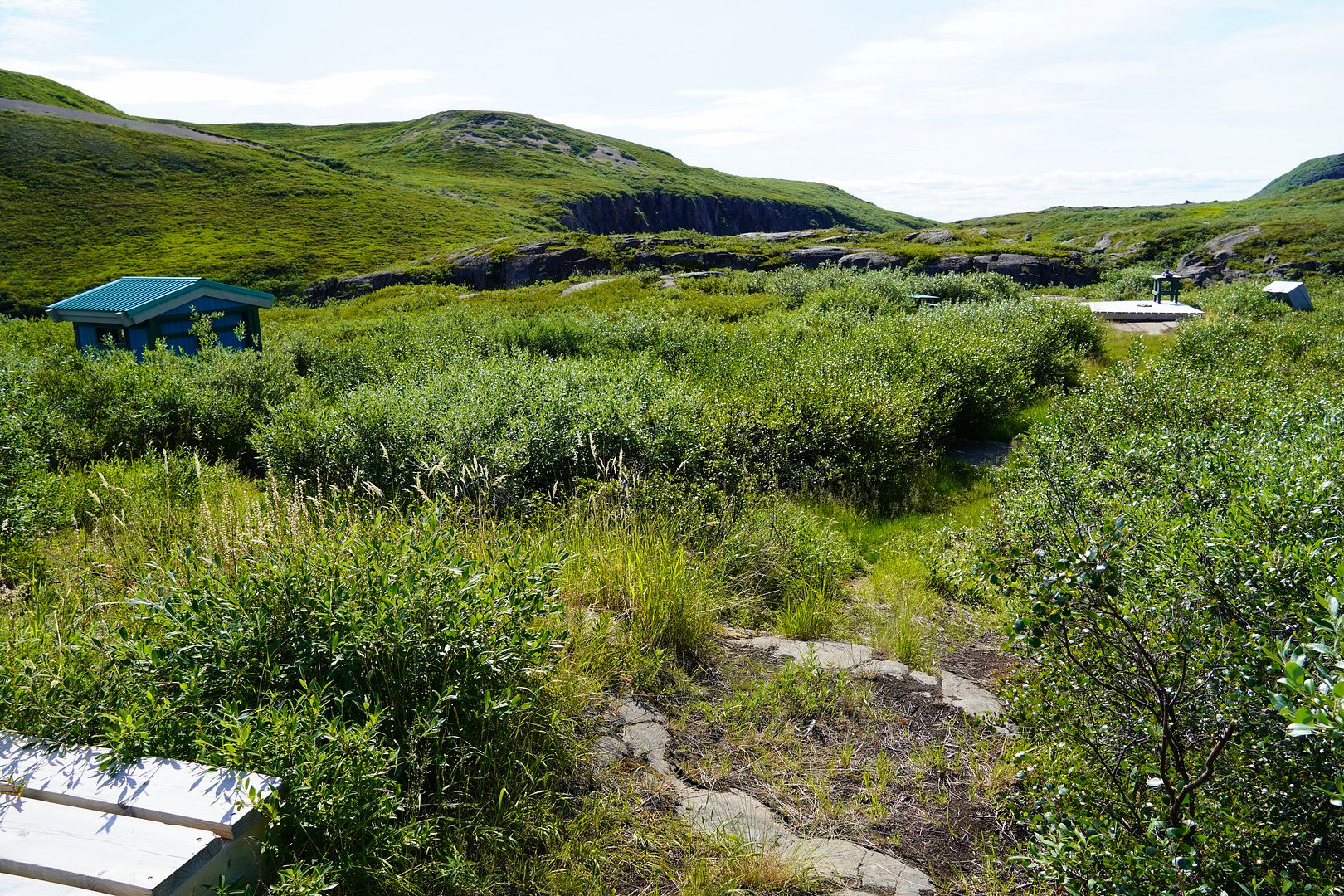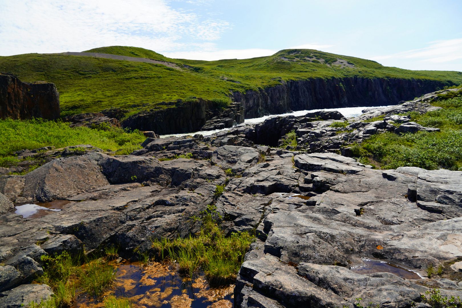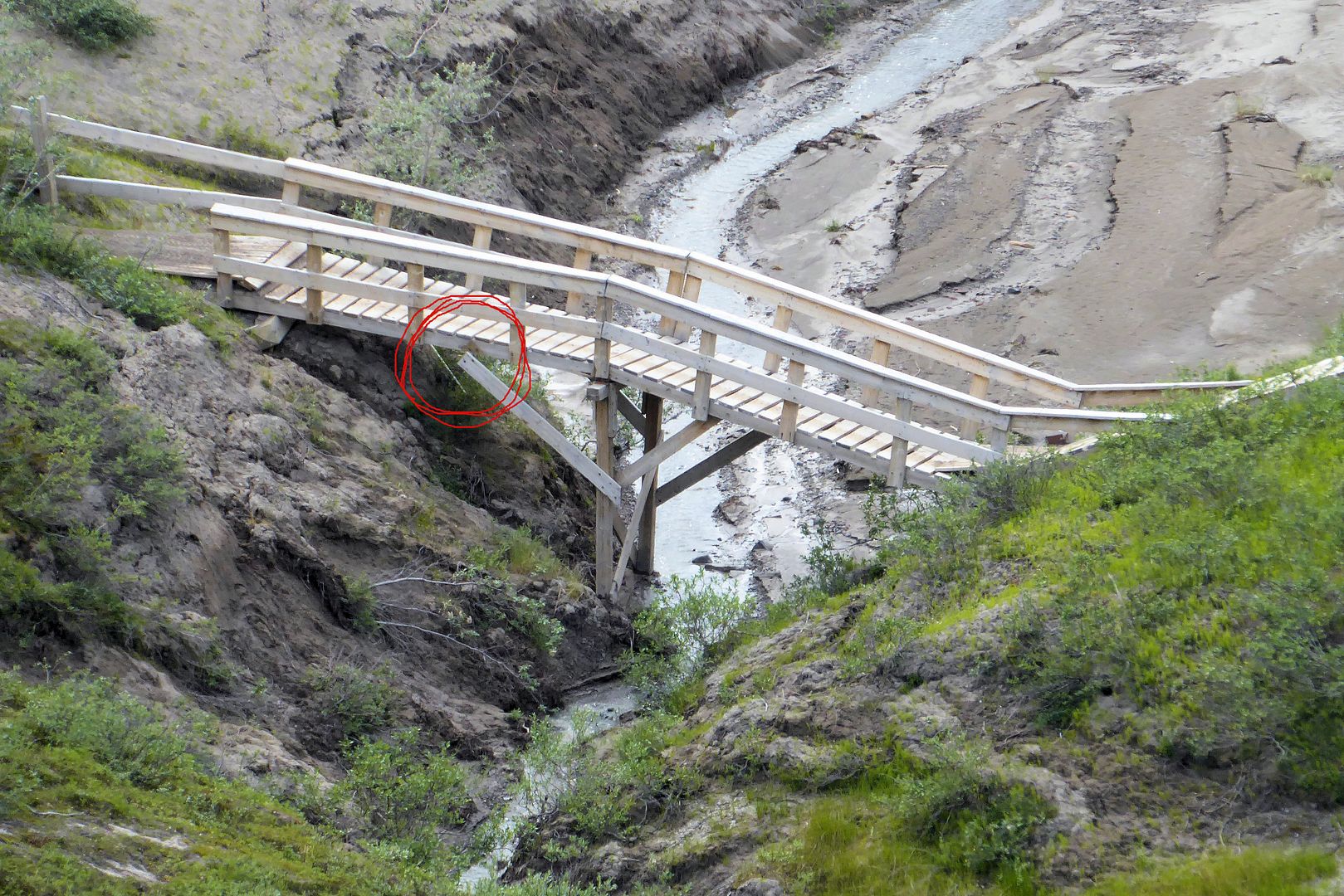 I arrived at the park boundary to the signs posted there. The trail beyond is a “use at your own risk” kinda deal. The Hamlet of Kugluktuk is working at building more long boardwalks to stretch from the signs onward a couple more kilometers to the falls, but it’s not near complete. On route there would be one sandy esker, a hill that dives downward to a sketchy looking bridge. Some ATV’ers do choose not to go down the hill and over that bridge. But, a little nervously I locked up both brakes and just skidded down that sandy slope, there was no stopping forward momentum after beginning, it was steep. At the bridge I parked a moment, took a good look at it and just didn’t feel like today was my day to die. It’s in pretty good shape actually, so over I went.