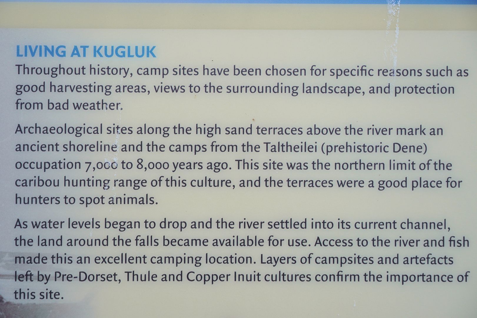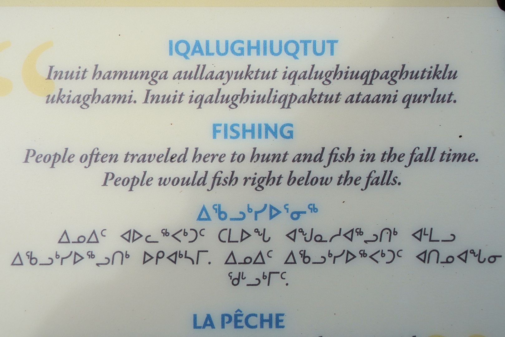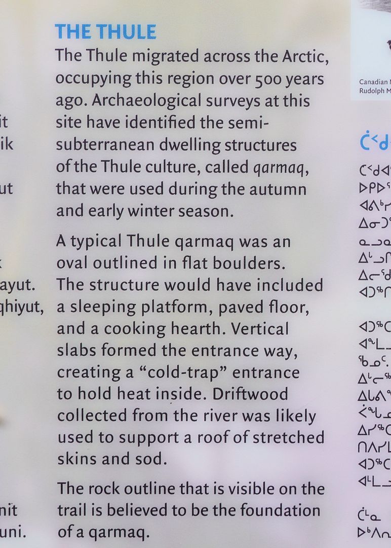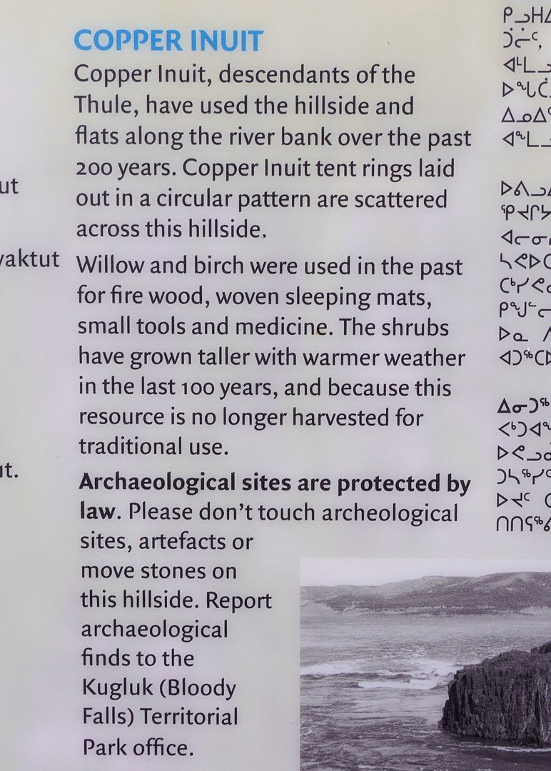 But as the signs do say the Bloody has a long history of being a place to fish. “In the fall” time, Inuit or Dene would meet here once the first northwinds reminded them of the cold days approaching. The arctic char out feeding in the sea, also triggered by the end of summer, they too return to the Coppermine River, to spawn and over-winter in the freshwater lakes and deep river pockets found upstream.