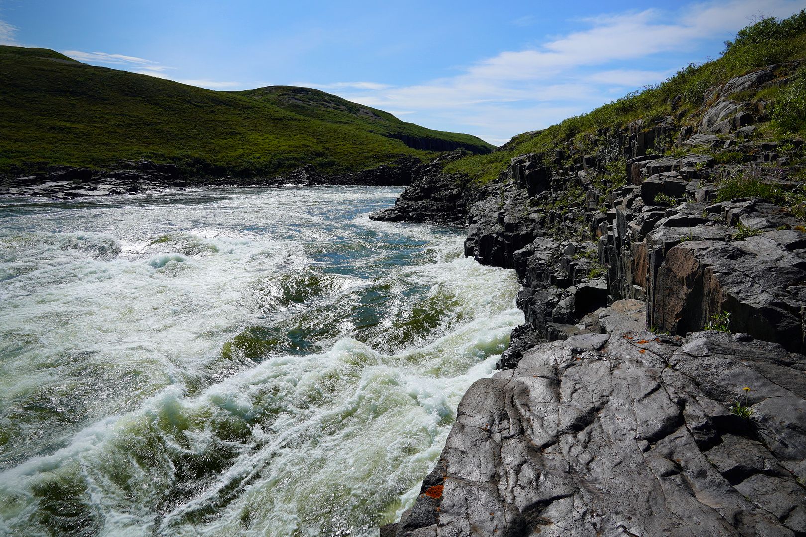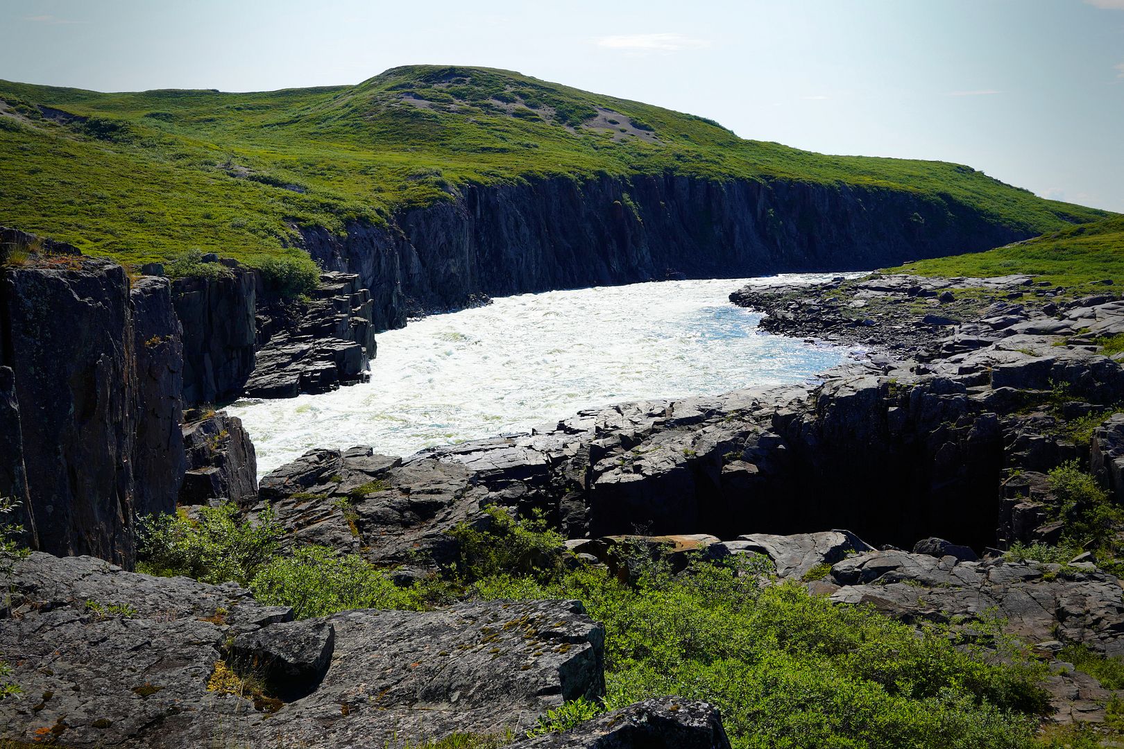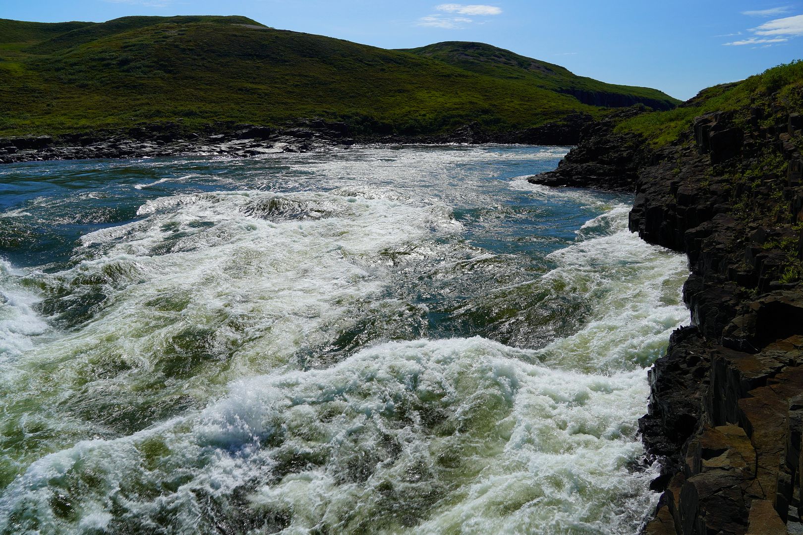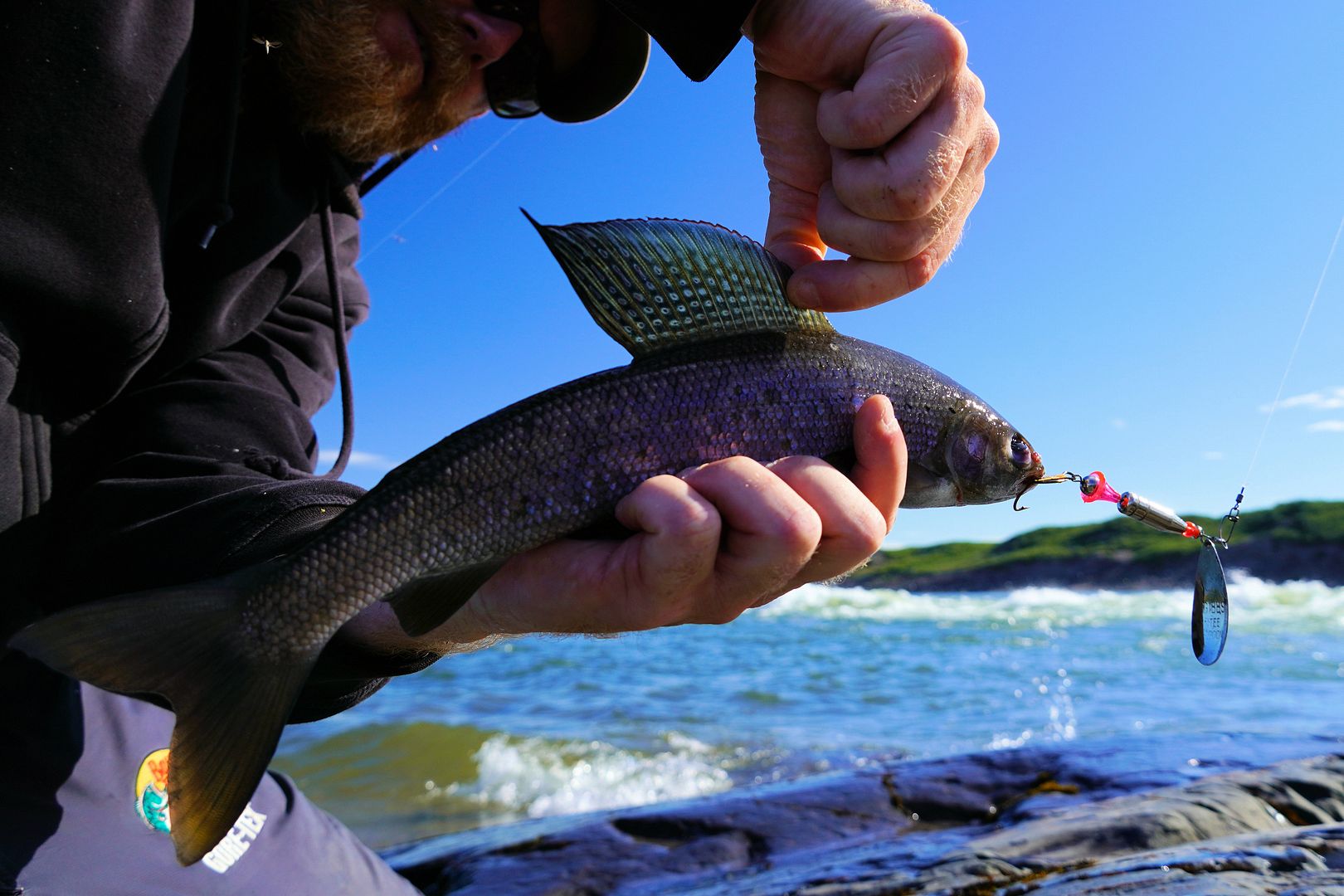 Had the Falls all to myself and was happy to arrive early. The morning grayling bite was hot, almost wished I’d gotten there sooner. On one early cast the lure got rammed and scrammed by something very powerful. A fast reel peel tore the line just into the main channel current where whatever it was popped off. I wanted badly to believe it was a char and it could have very well been. Beyond that, each other hit was simply aggressive and fun, as graying don’t really take line. That said, they’re certainly spirited little fighters, and if armed with a light to medium-light rod like one used for crappies, walleye or small trout, or a 4 to 5wt fly rod, catching dozens and dozens of these beauties would make for an incredible day. The best for the morning would be a 17-incher that I decided to bury under some rocks in the river, to keep fresh for a meal.
