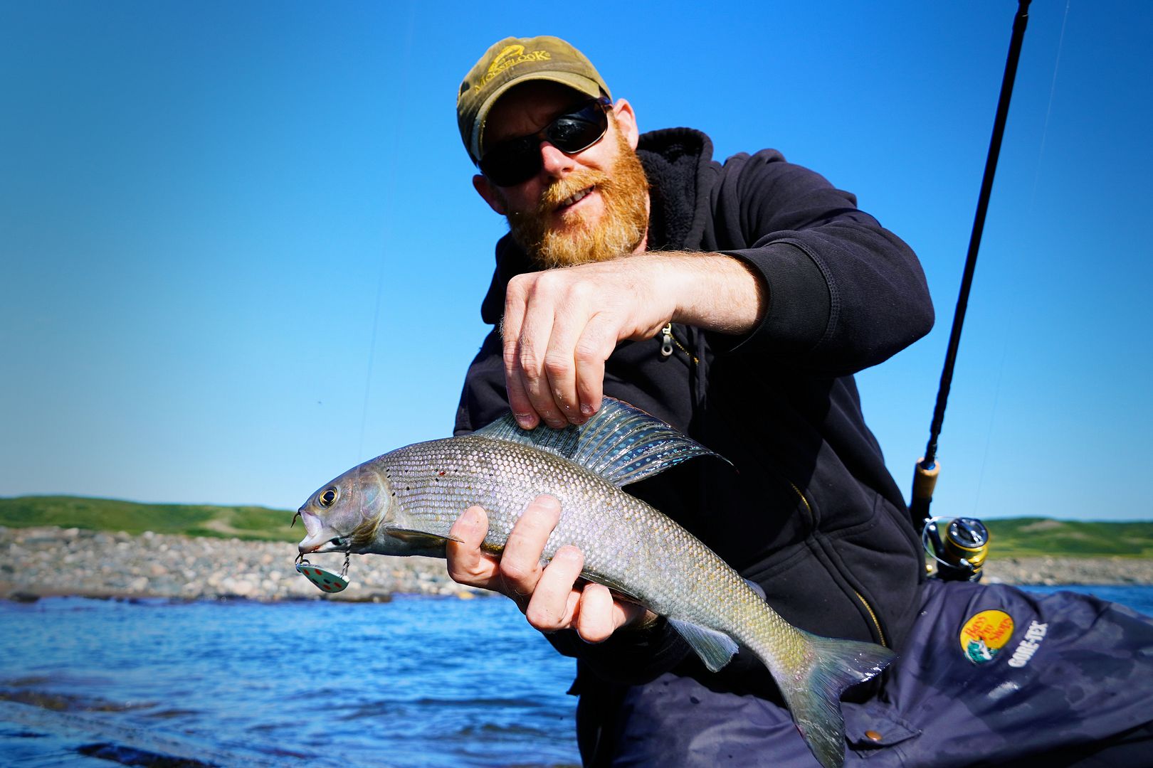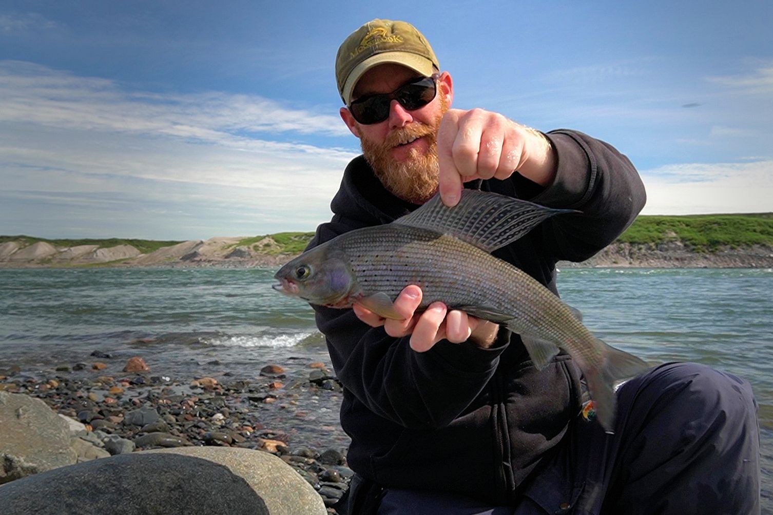 The river whitefish had been biting this day too… kind of. Failing to mention earlier in this story, I had already caught three smaller than this one earlier on. Their fight for whitefish is quite impressive, nothing like the wimpier lake versions we have back in Ontario. Whities up here in the Coppermine will make the odd run to the saltwater, getting caught in nets at sea. They also spend their lives moving through the heavier river currents, and so in essence are quite strength and conditioned by their hard environs. Whites will eat minnows and the young of other fish. Up here that could be anything from sculpin, stickleback I presume, grayling, char, lakers, herring and even capelin if at sea. They’ll also eat any and many bugs, anytime. So to have them going after spoons I was chucking for char was cool. Problem for them is, unlike the much smaller grayling, with even smaller but forward facing mouths, whitefish yaps are down-turned and so they have a trickier time grabbing a horizontally retrieved lure. They will try, but they often miss. So far I’d caught two in the mouth, one in the head and one in the back but they all came from off this specific little rocky ridge between me and the slick spot, they held on the further deep side. Thinking about it afterwards, after taking a couple home to eat, when I opened them up they were bursting full with eggs. It might have been that I was running the lure across their reds, and they were simply lashing out? Maybe, but that would normally be a behavior more common to the male fish. Keep at it into the evening when a few grayling started to bite again, this one being the best of that short flurry.