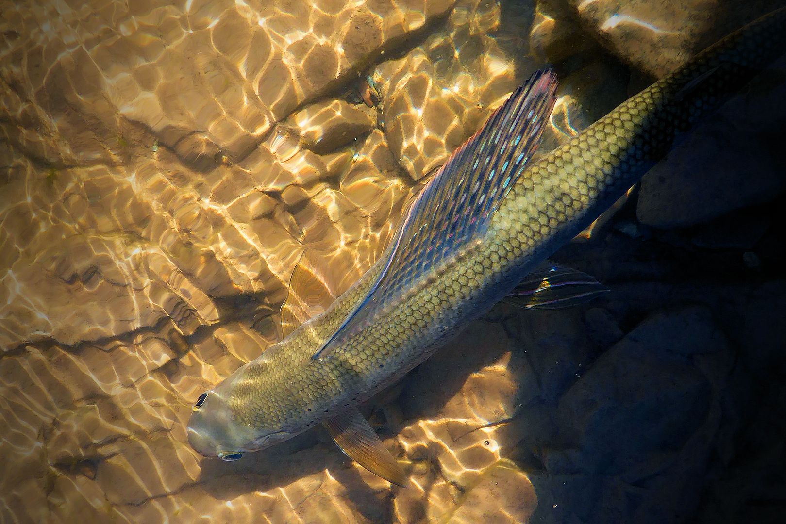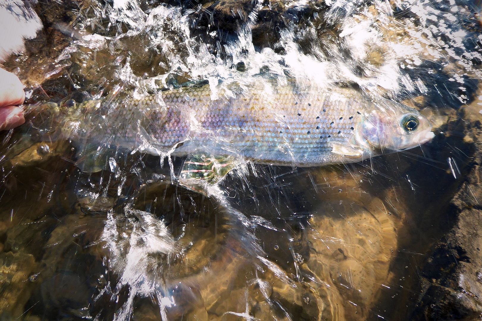 It was in the slick that a first orangish fish was spotted surfacing to bugs. After that, two more darker colored fish dimpled the surface. It looked active, I downsized my spoon to safeguard from shallow rocks, then I peppered the shit outta the place, nailing a couple dozen feisty grayling for a short time on like every third or fourth cast. Two other large fish also showed up to fight, both powerful within the current, I would lose them both. Big shouldered whitefish.