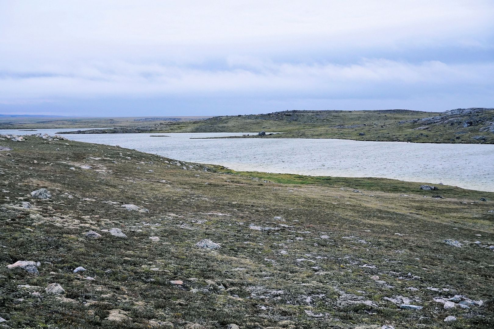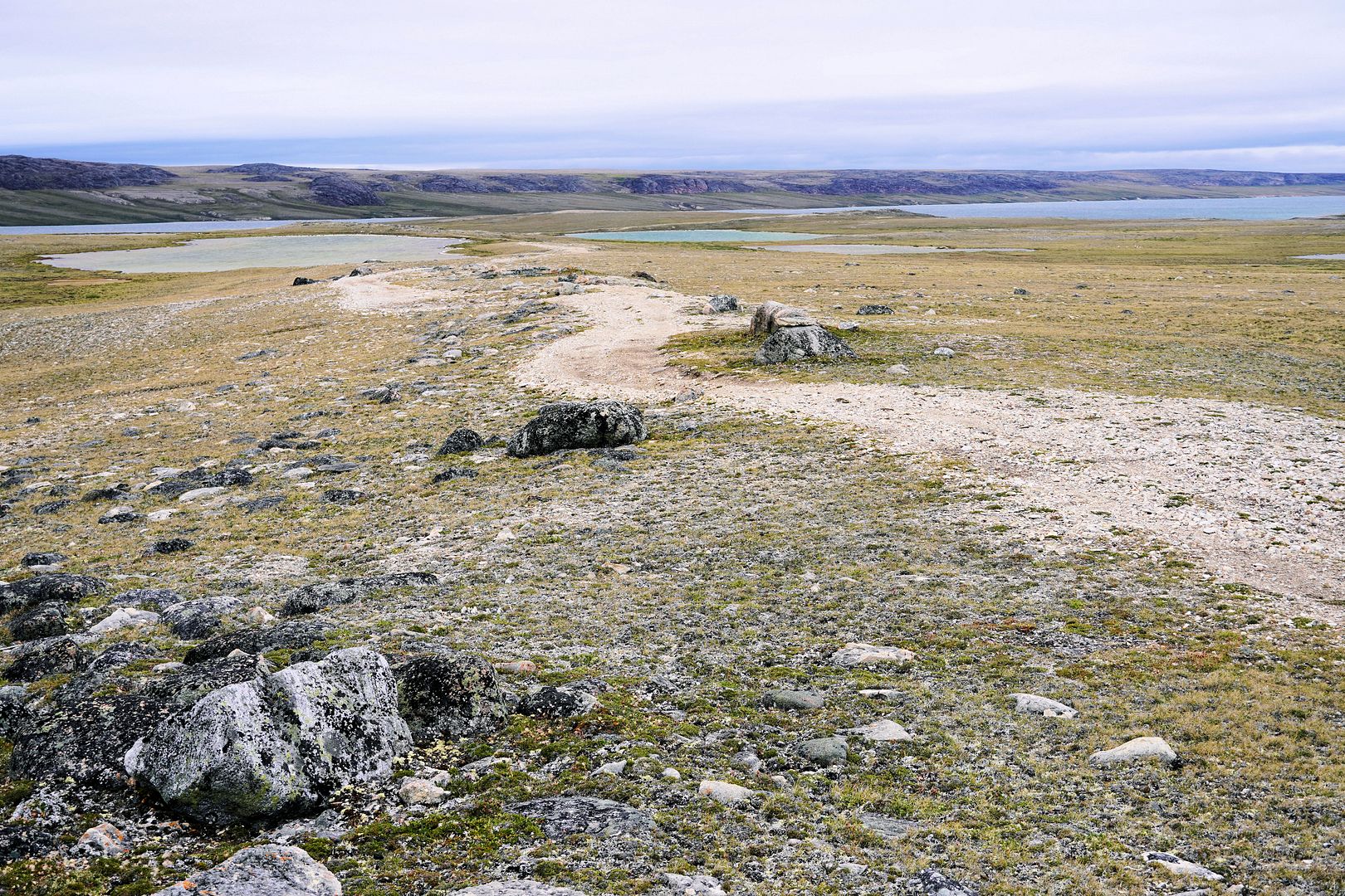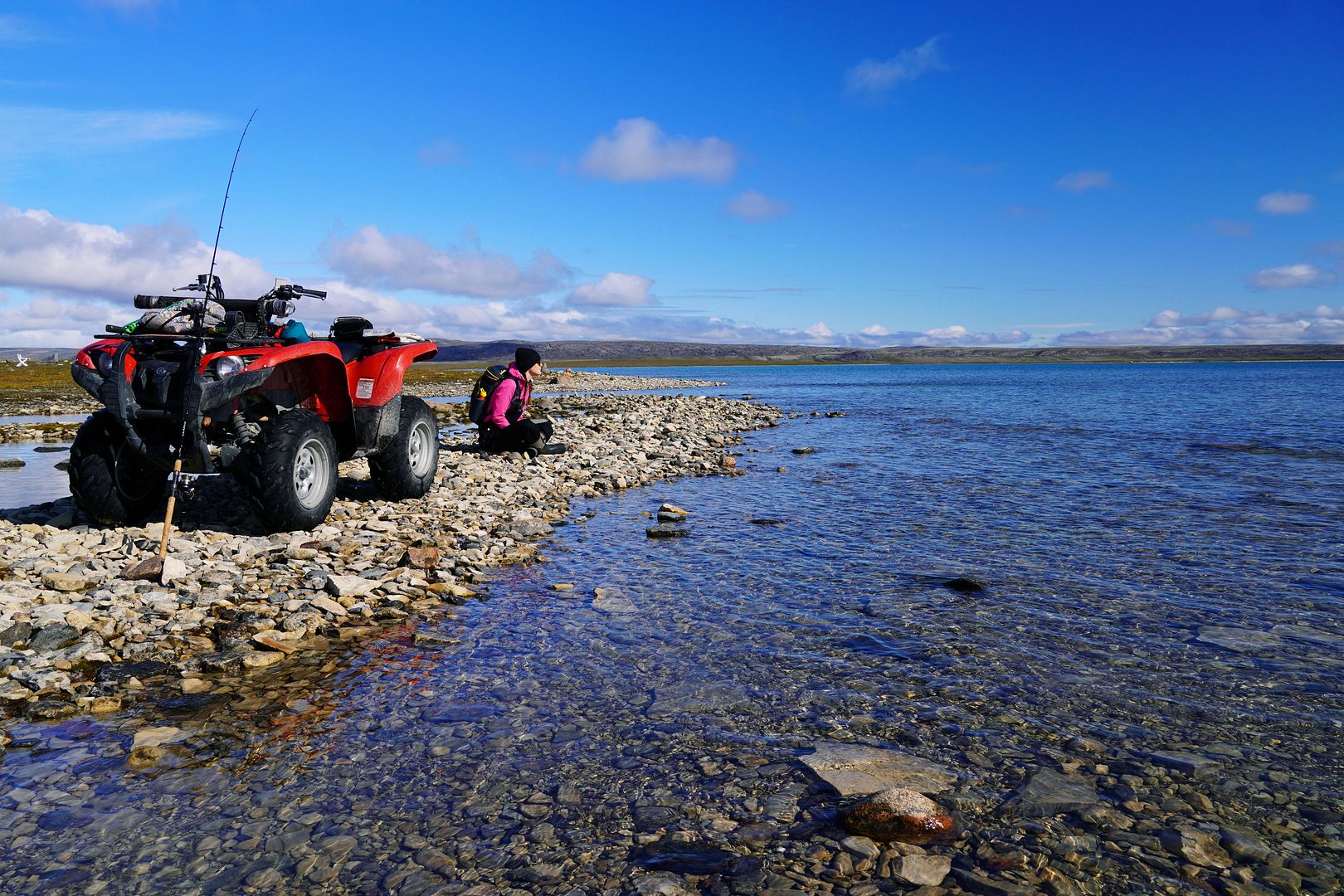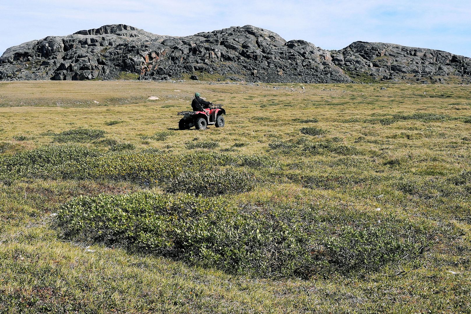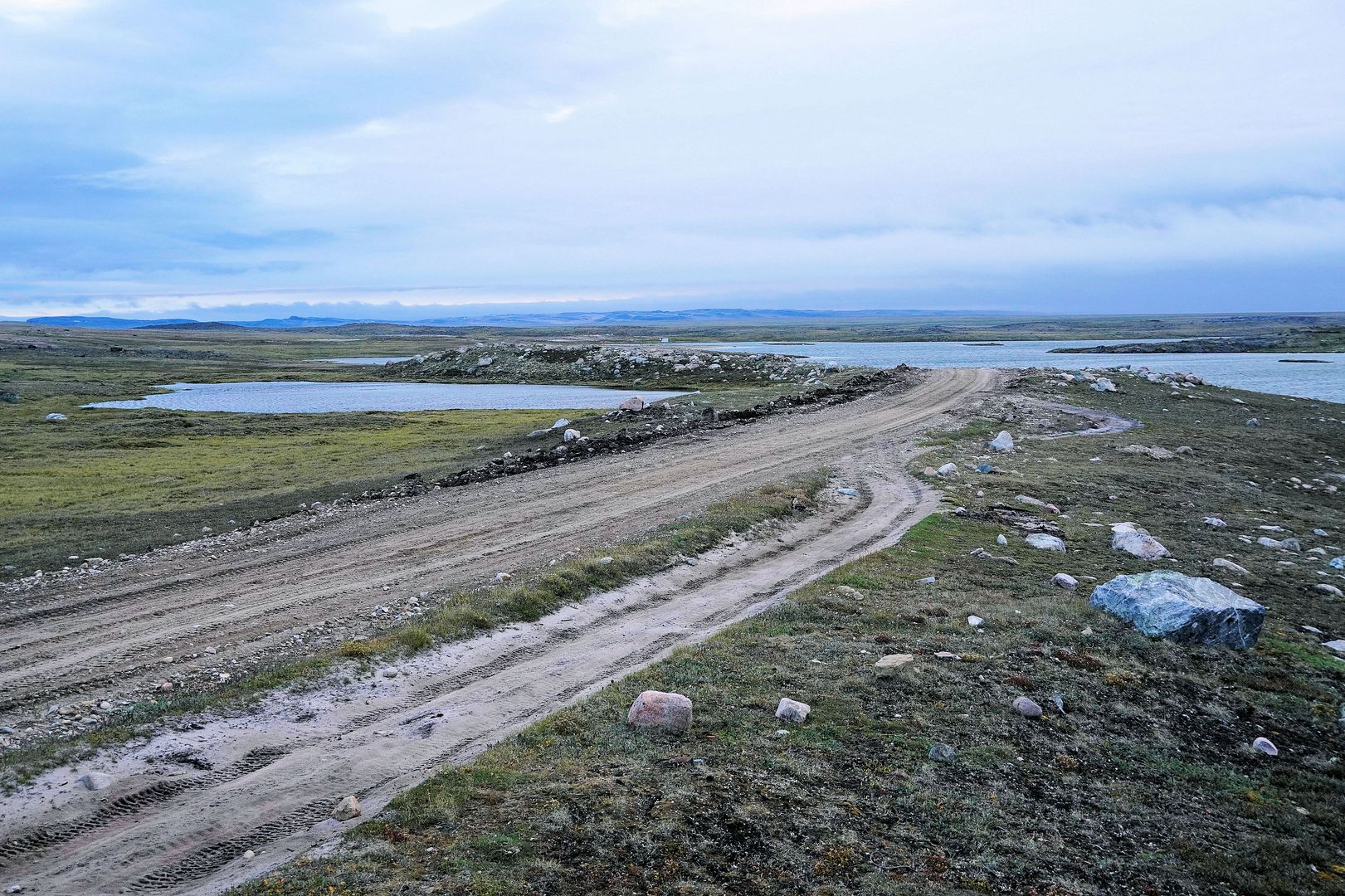 The tundra run on the quad is a real mixed bag of terrain. Lowland stretches through any grasses are often buggy, boggy, rutted out and rather terrible. Highland grass routes can be pretty good and flat. There are spaces of rough and jagged rock, sharp like sheets of vertical embedded shale sticking up or otherwise, just variable sized rocks to swerve or hurdle. Gravel beds are also present, areas where its laid flat to the ground just like a driveway, and there’s also sandy patches too, ones that are far from eskers though. Plenty of land I presume would be ancient seabed..? The area around Taloyoak is certainly rugged enough, not Baffin Island mountainous but plenty of great hills and rocky ridges to make it all seem a bit more grand than some other places. After another half hour of spine massaging and muscle tensing through all of that terra Arcticus, I reached the plotted waypoint.