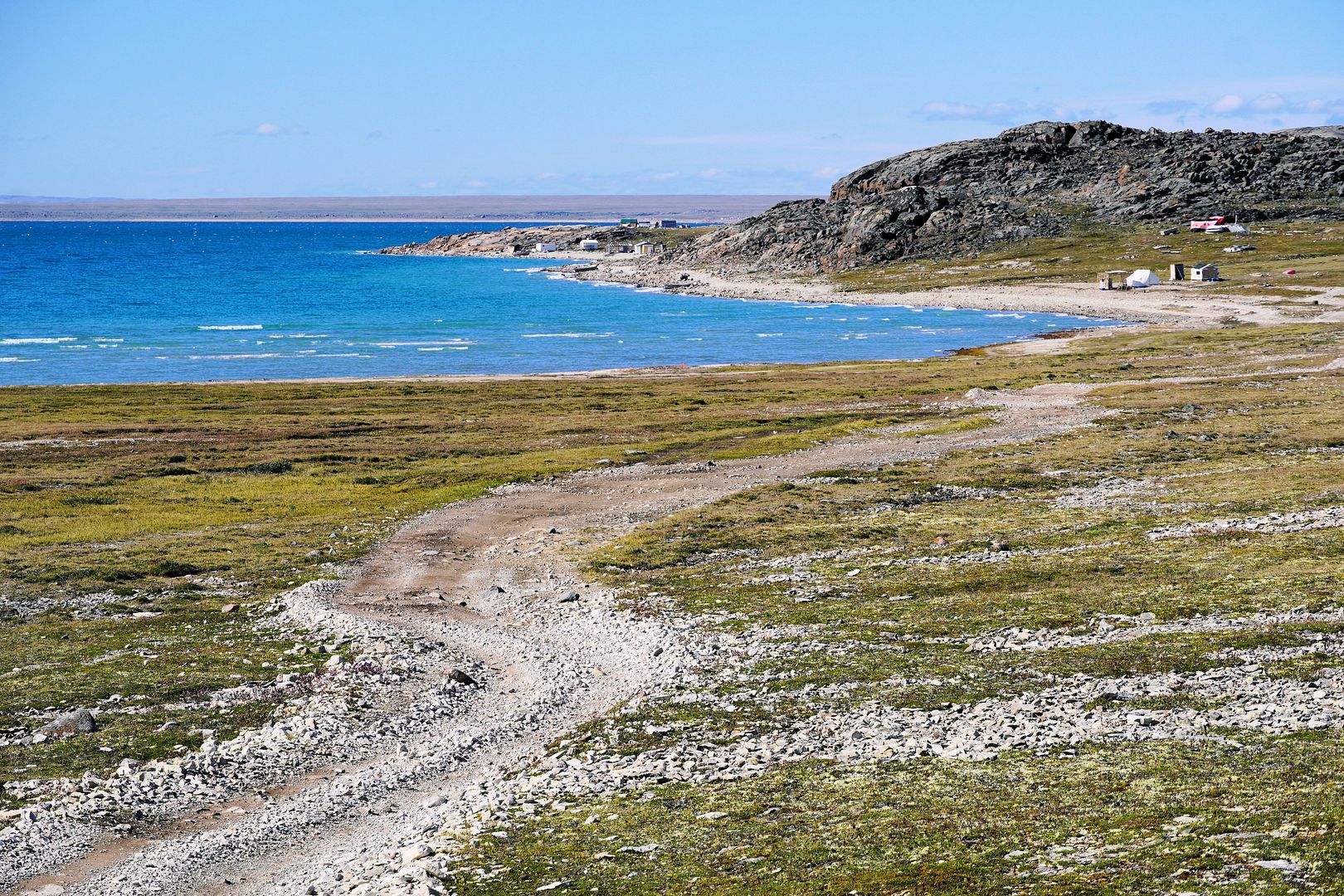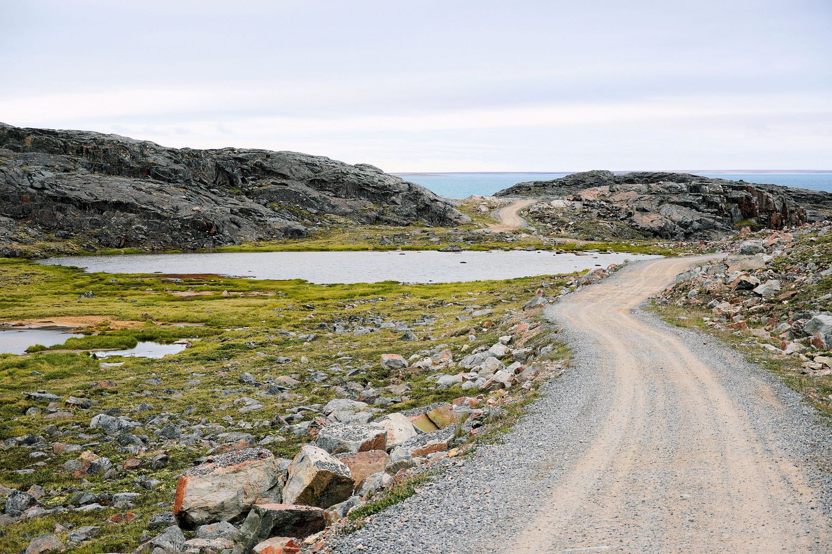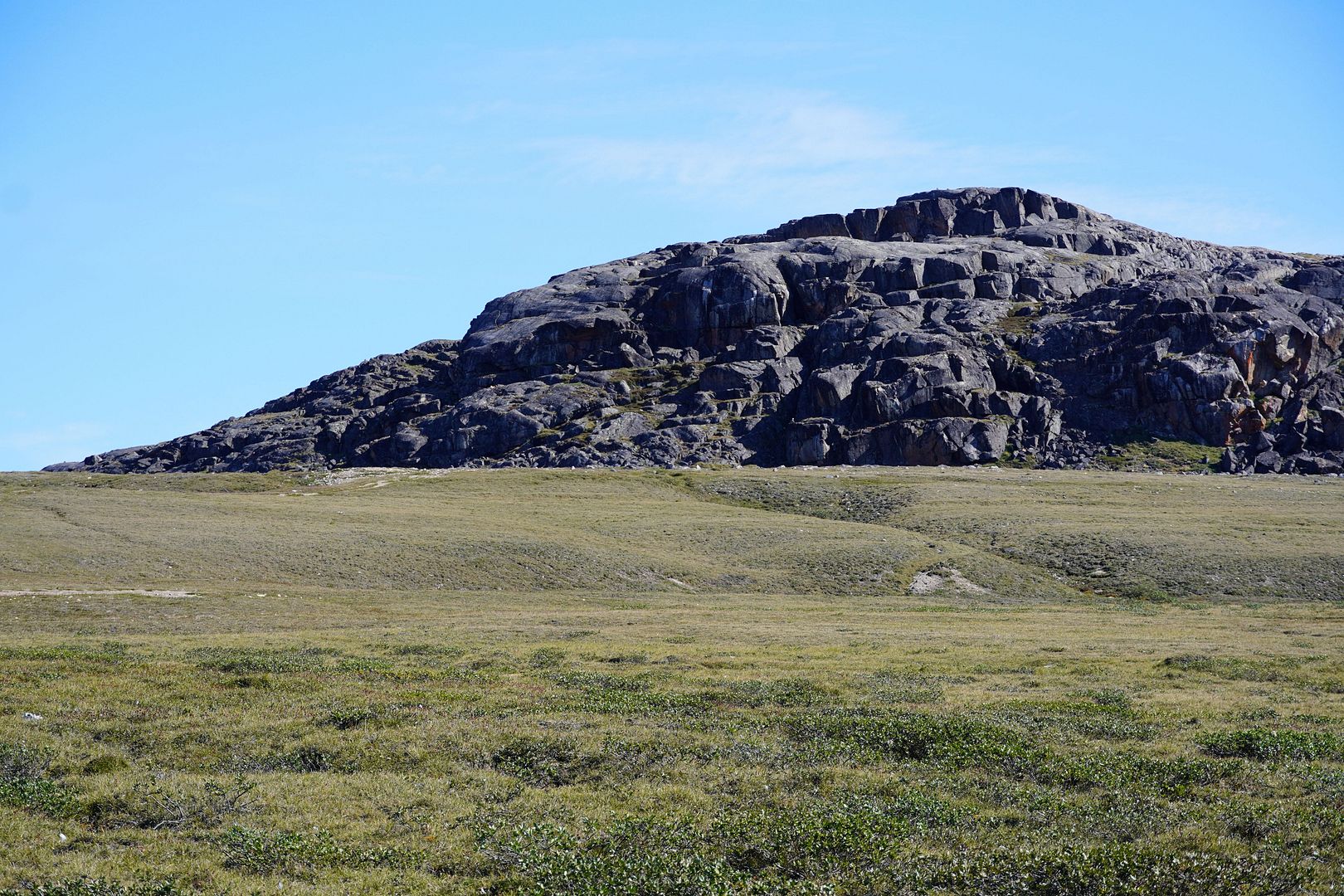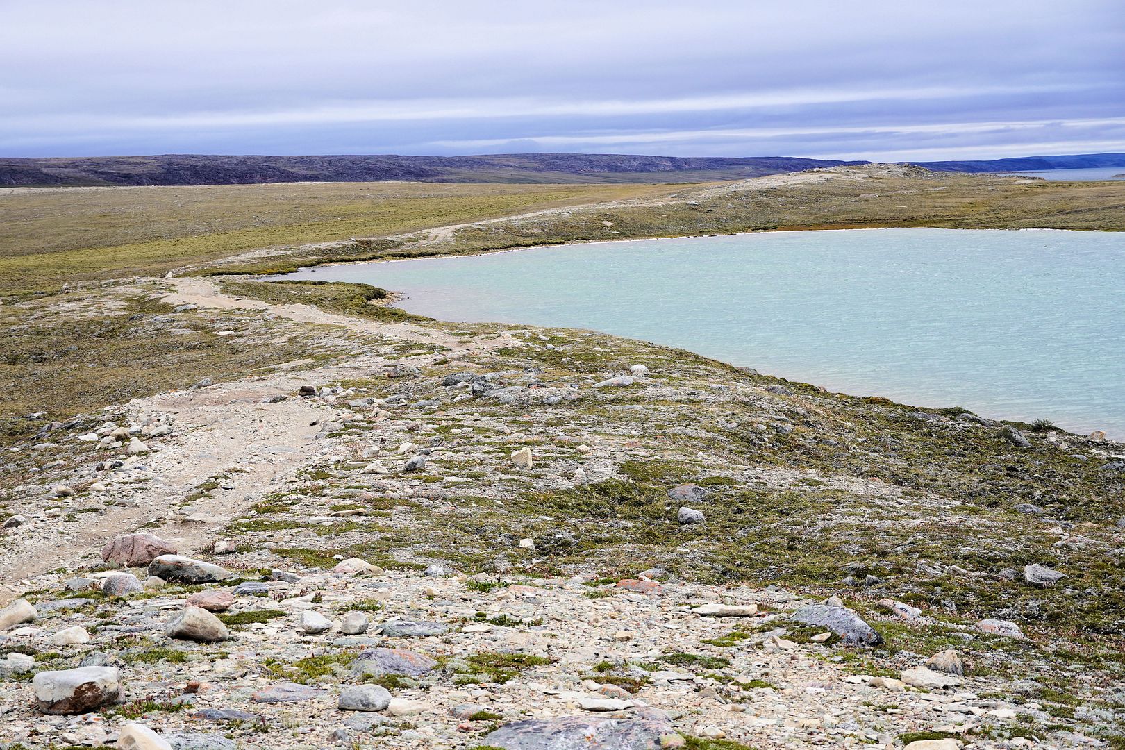 The tundra run on the quad is a real mixed bag of terrain. Lowland stretches through any grasses are often buggy, boggy, rutted out and rather terrible. Highland grass routes can be pretty good and flat. There are spaces of rough and jagged rock, sharp like sheets of vertical embedded shale sticking up or otherwise, just variable sized rocks to swerve or hurdle. Gravel beds are also present, areas where its laid flat to the ground just like a driveway, and there’s also sandy patches too, ones that are far from eskers though. Plenty of land I presume would be ancient seabed..? The area around Taloyoak is certainly rugged enough, not Baffin Island mountainous but plenty of great hills and rocky ridges to make it all seem a bit more grand than some other places. After another half hour of spine massaging and muscle tensing through all of that terra Arcticus, I reached the plotted waypoint.