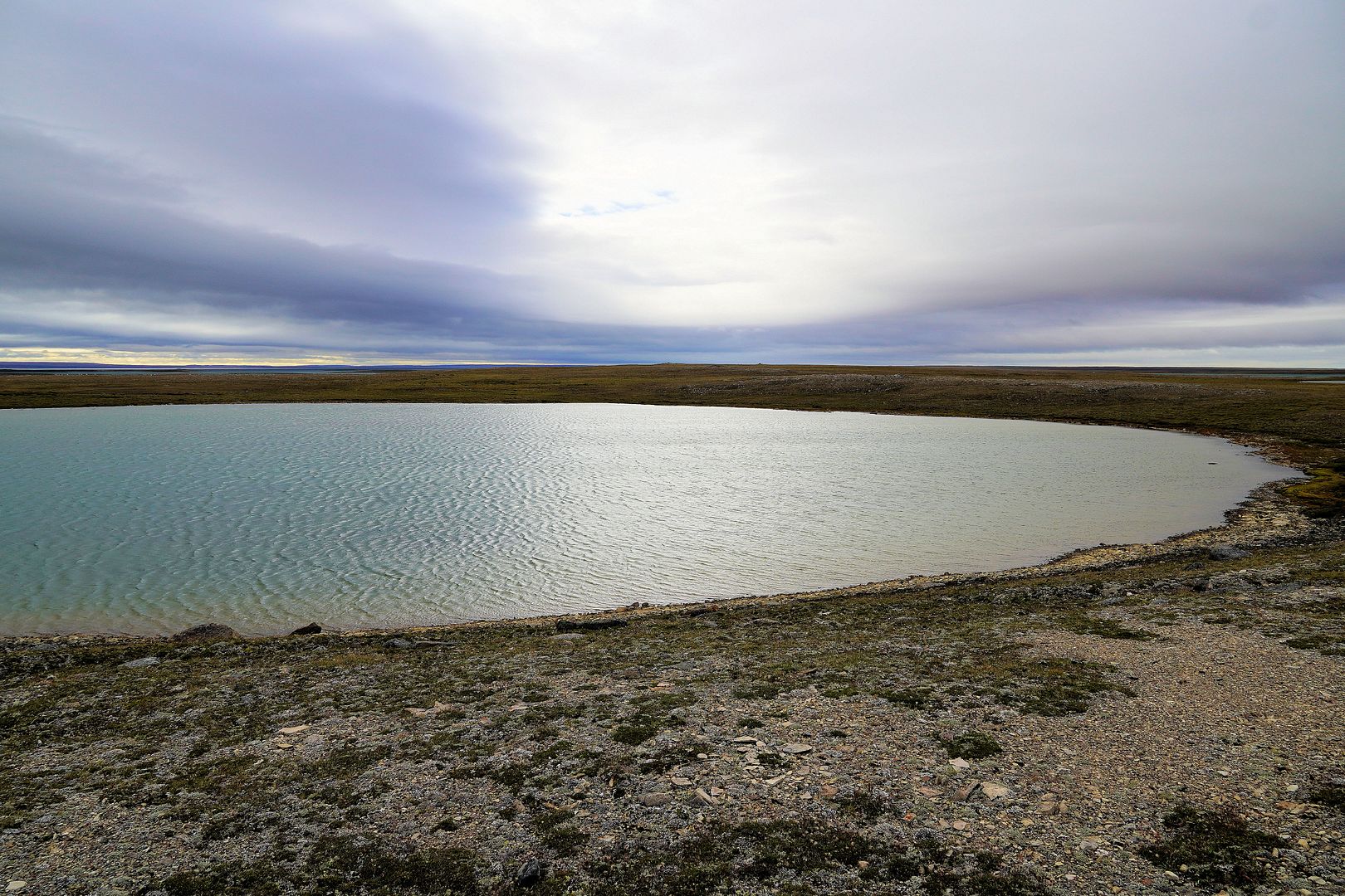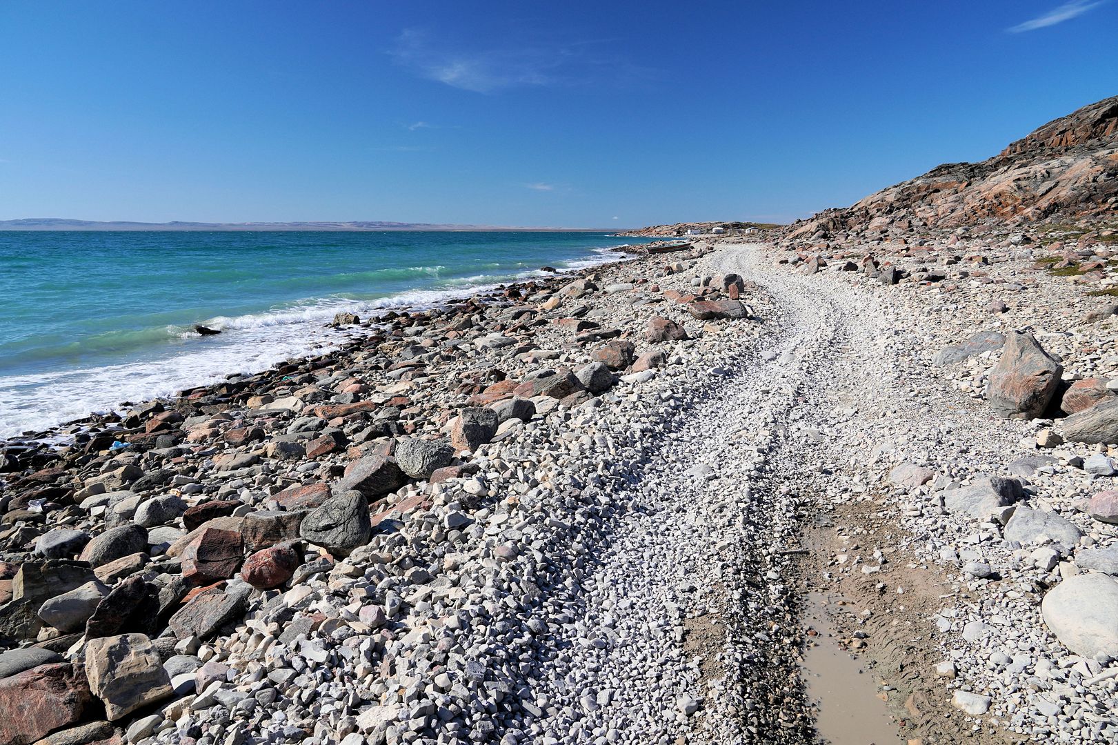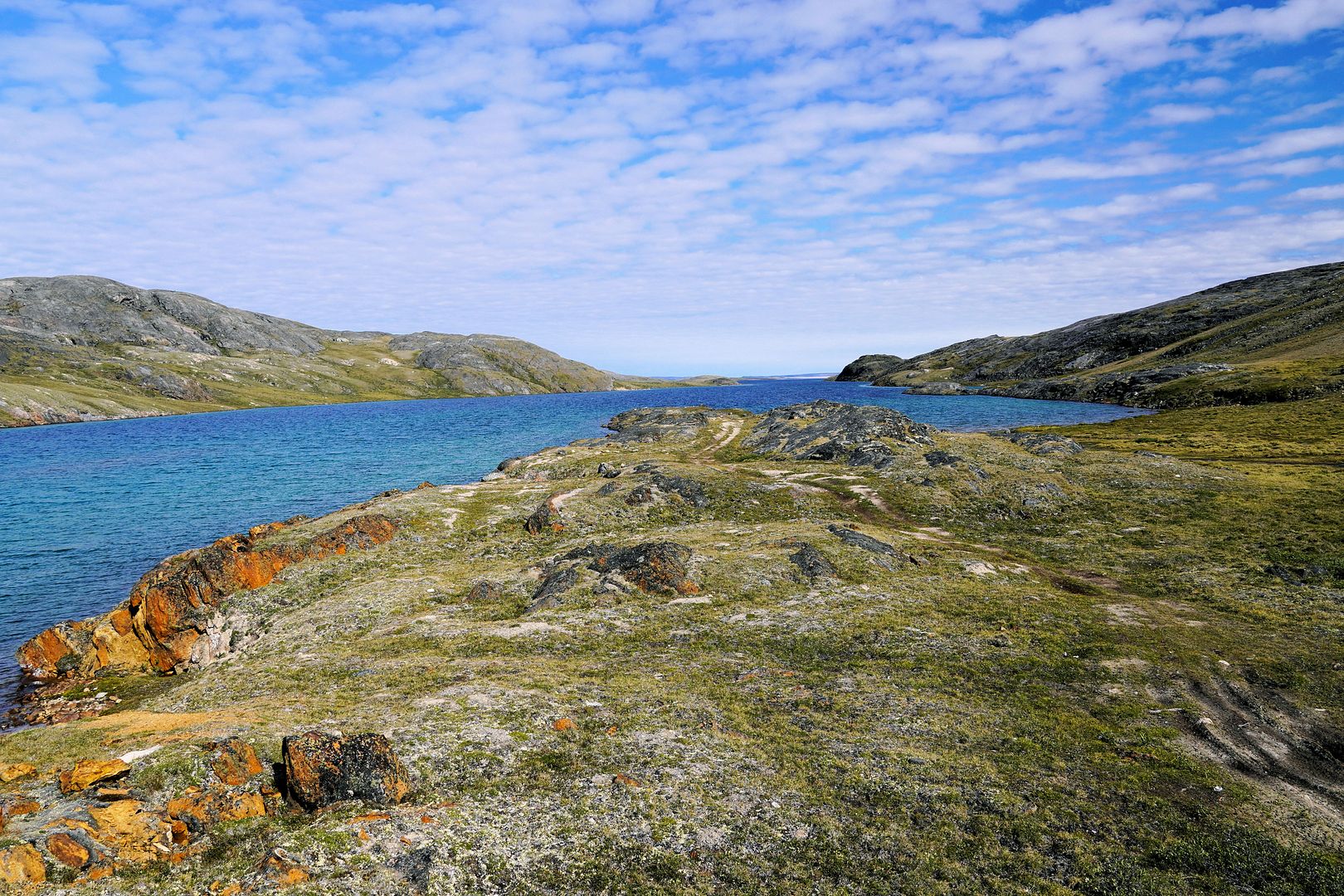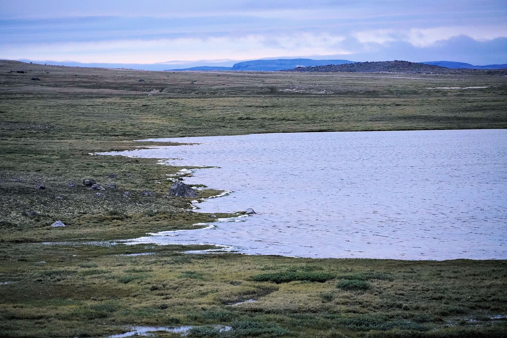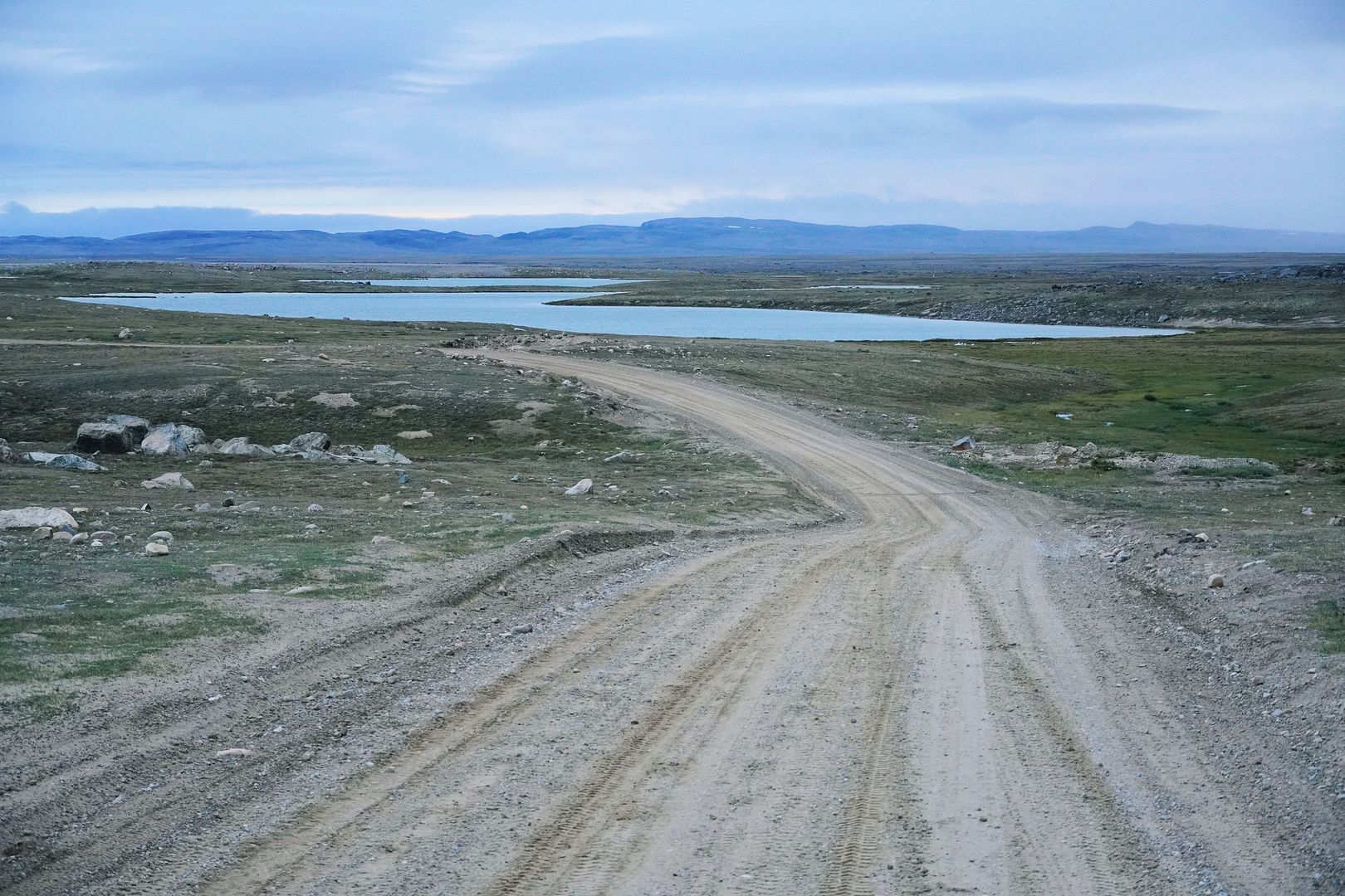 The tundra run on the quad is a real mixed bag of terrain. Lowland stretches through any grasses are often buggy, boggy, rutted out and rather terrible. Highland grass routes can be pretty good and flat. There are spaces of rough and jagged rock, sharp like sheets of vertical embedded shale sticking up or otherwise, just variable sized rocks to swerve or hurdle. Gravel beds are also present, areas where its laid flat to the ground just like a driveway, and there’s also sandy patches too, ones that are far from eskers though. Plenty of land I presume would be ancient seabed..? The area around Taloyoak is certainly rugged enough, not Baffin Island mountainous but plenty of great hills and rocky ridges to make it all seem a bit more grand than some other places. After another half hour of spine massaging and muscle tensing through all of that terra Arcticus, I reached the plotted waypoint.