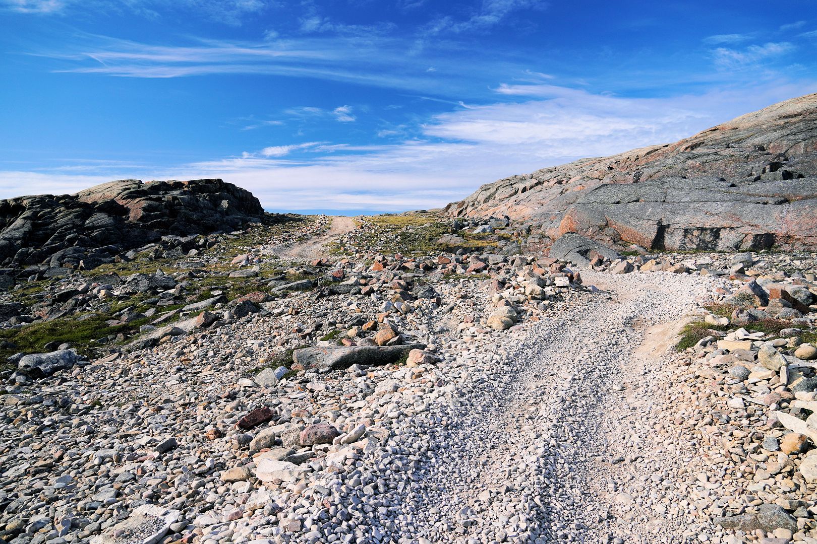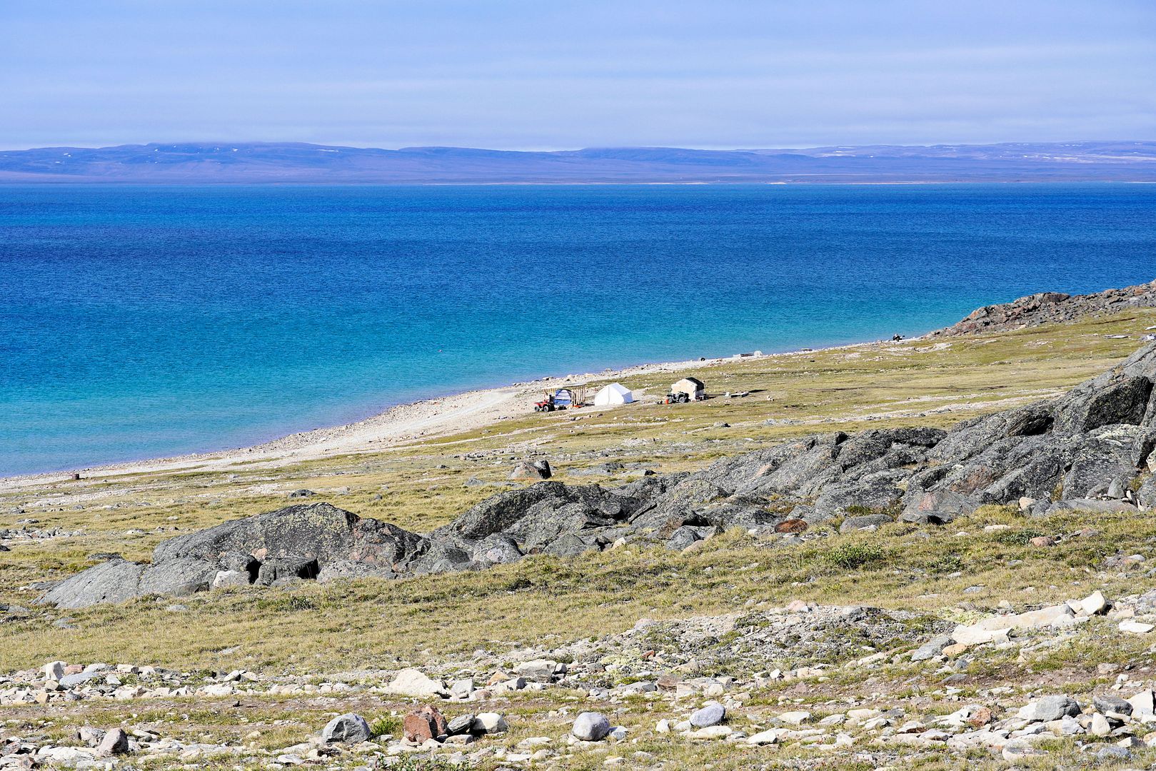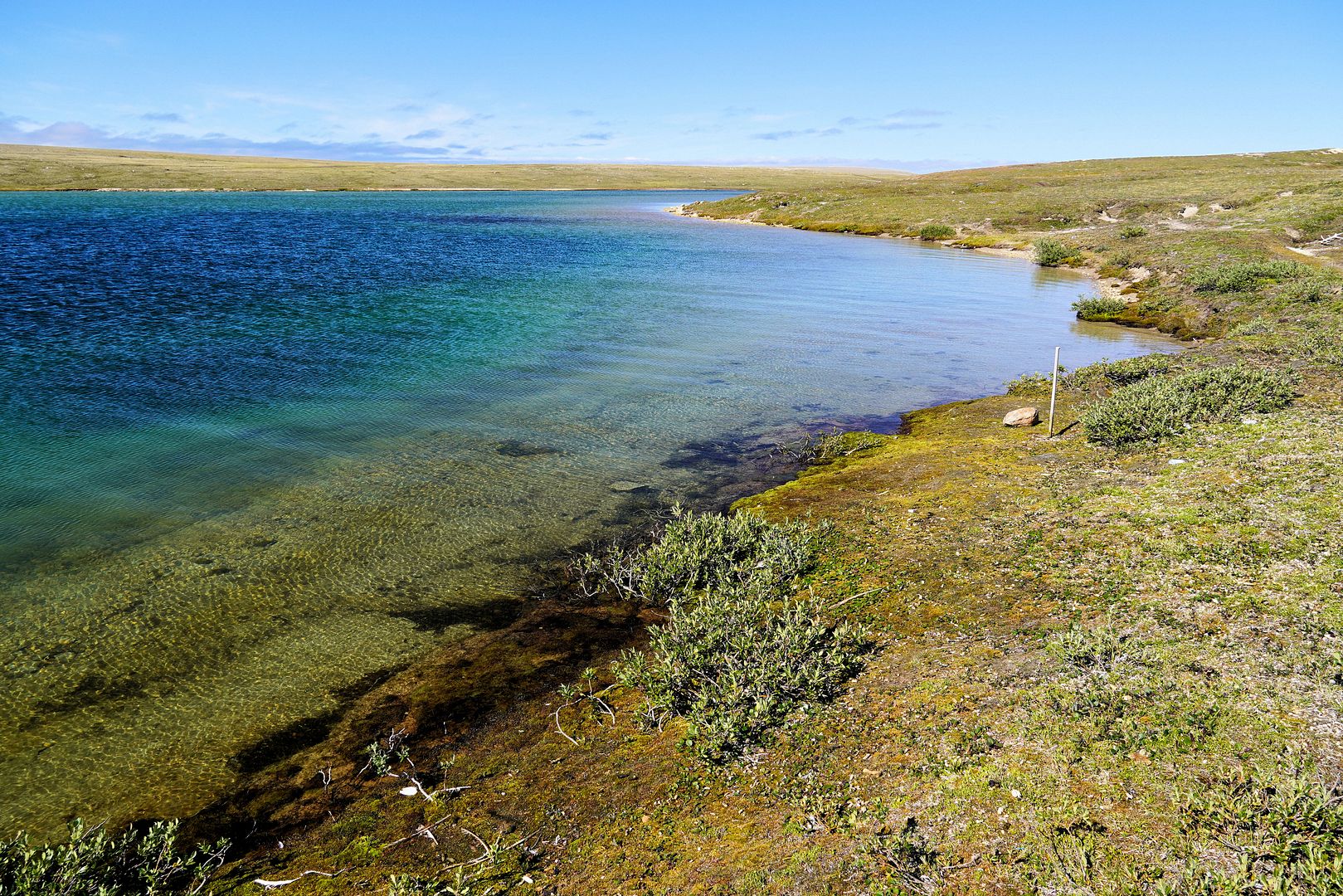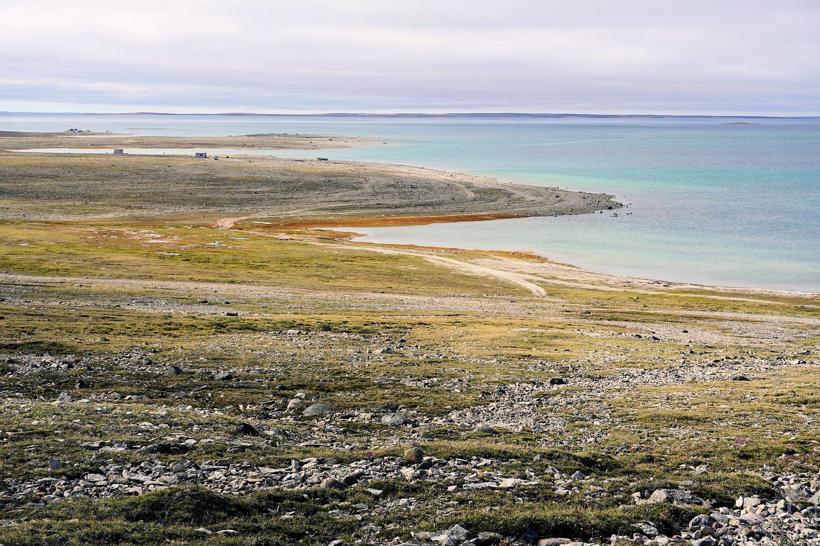 The tundra run on the quad is a real mixed bag of terrain. Lowland stretches through any grasses are often buggy, boggy, rutted out and rather terrible. Highland grass routes can be pretty good and flat. There are spaces of rough and jagged rock, sharp like sheets of vertical embedded shale sticking up or otherwise, just variable sized rocks to swerve or hurdle. Gravel beds are also present, areas where its laid flat to the ground just like a driveway, and there’s also sandy patches too, ones that are far from eskers though. Plenty of land I presume would be ancient seabed..? The area around Taloyoak is certainly rugged enough, not Baffin Island mountainous but plenty of great hills and rocky ridges to make it all seem a bit more grand than some other places. After another half hour of spine massaging and muscle tensing through all of that terra Arcticus, I reached the plotted waypoint.