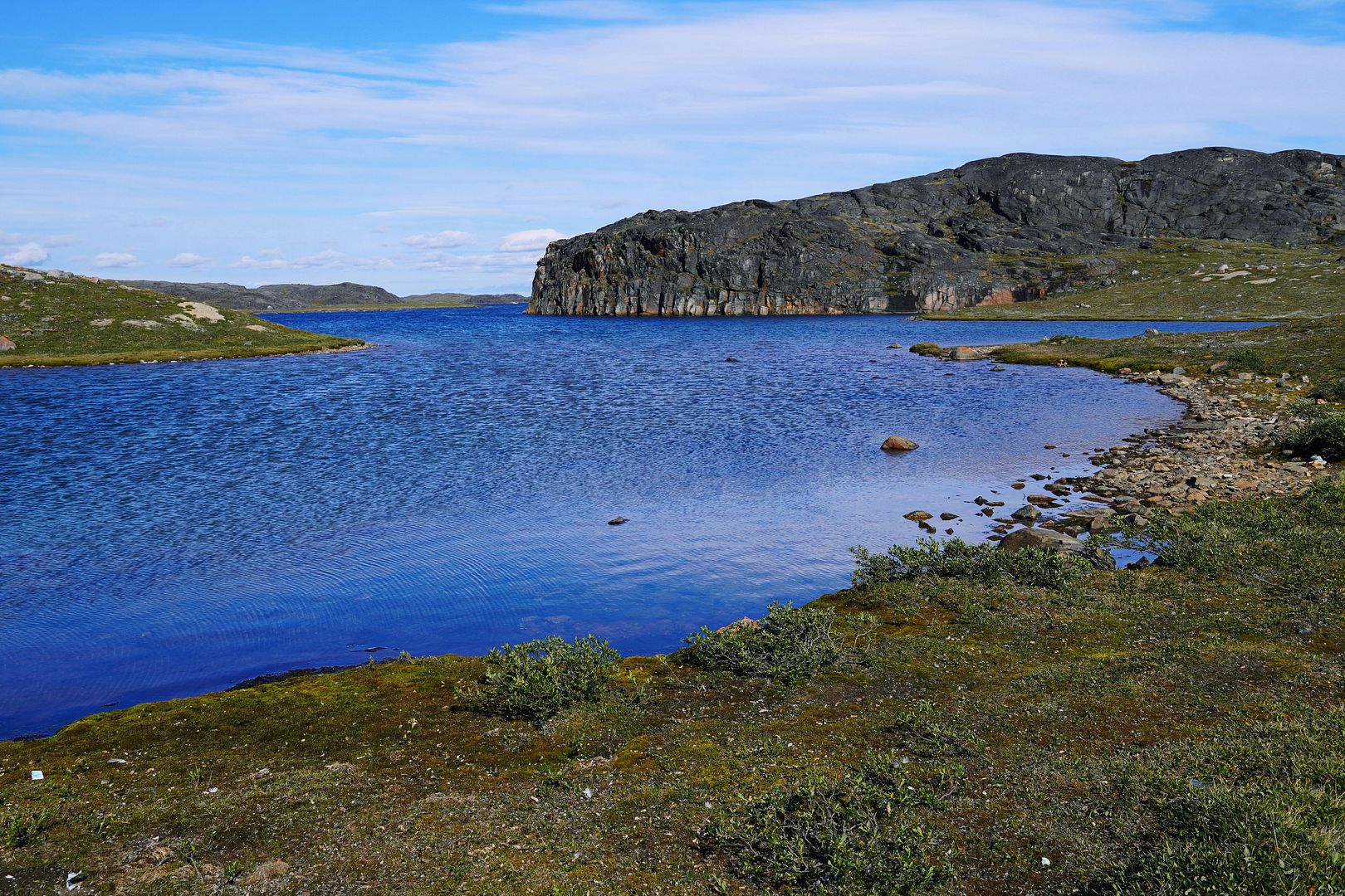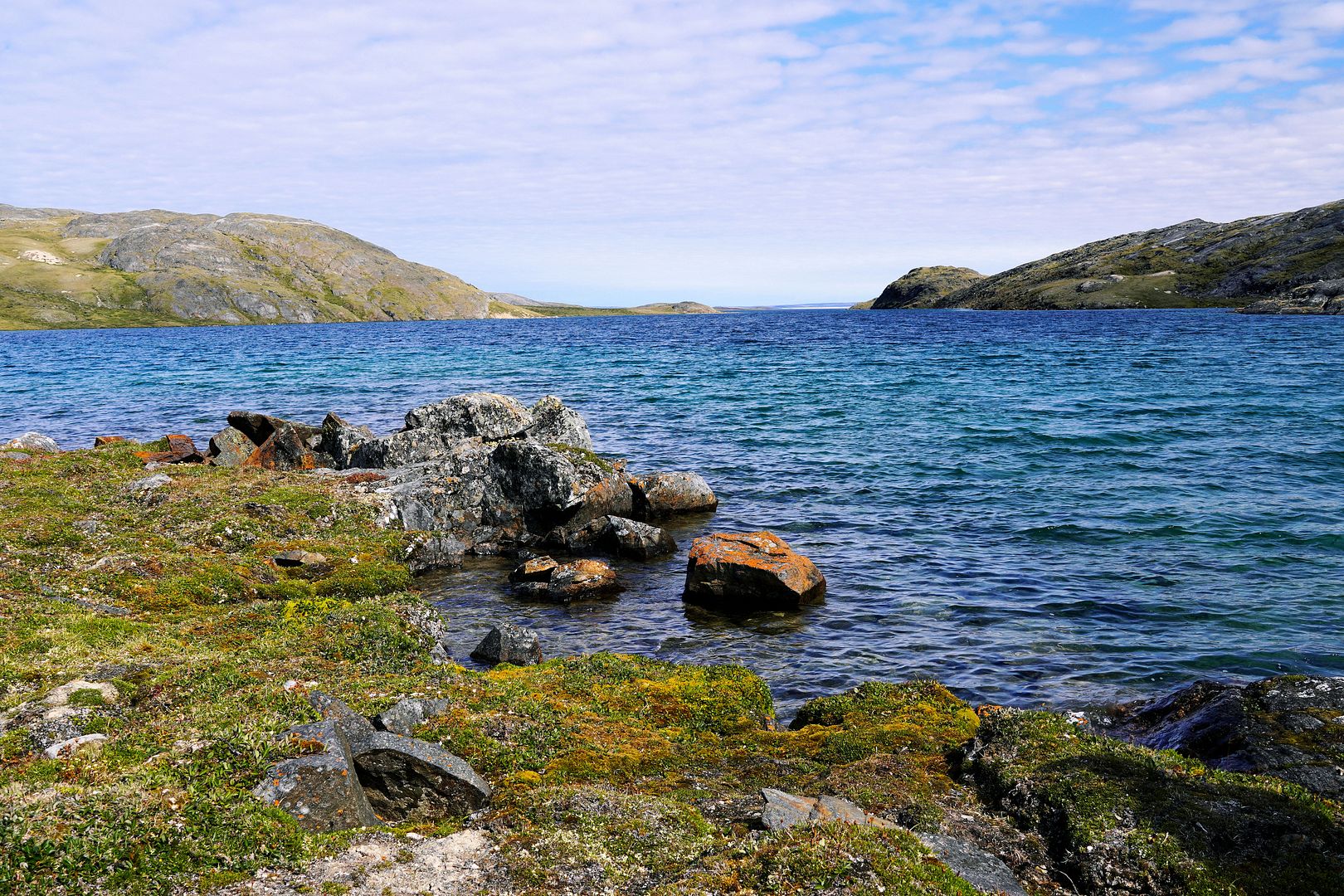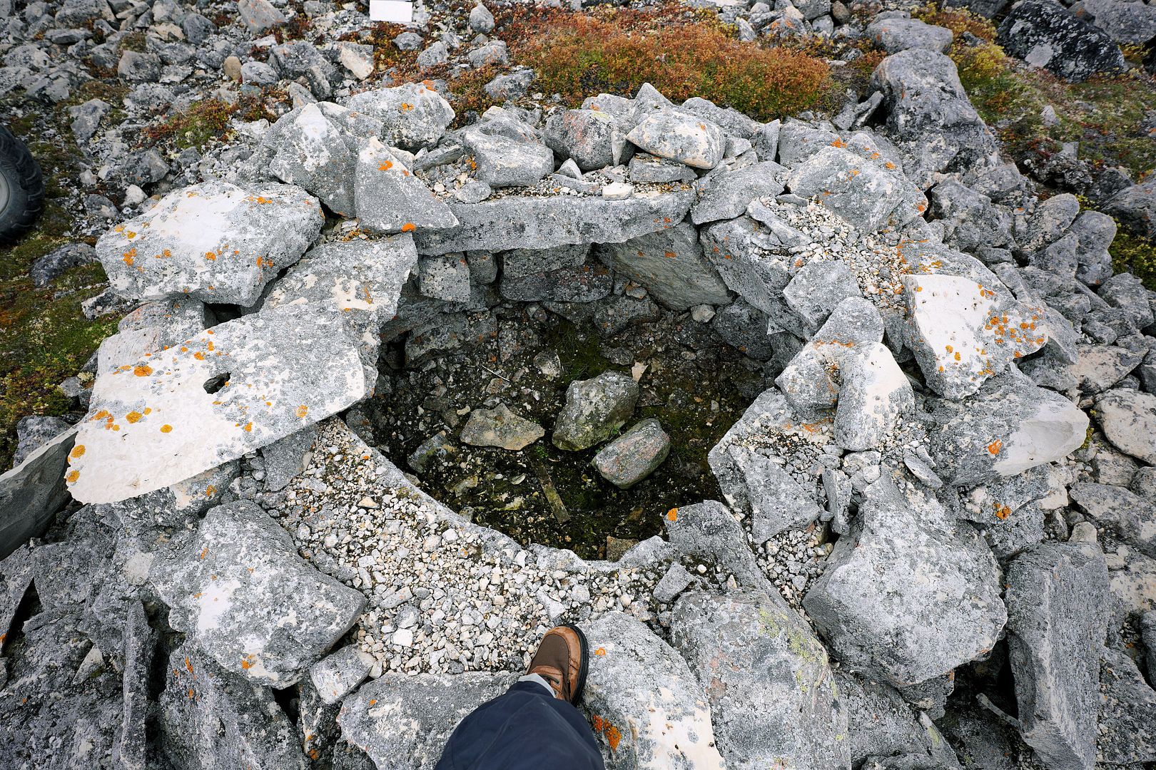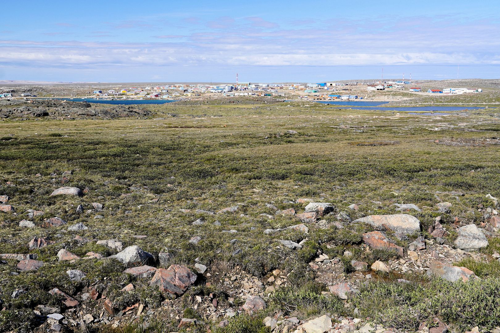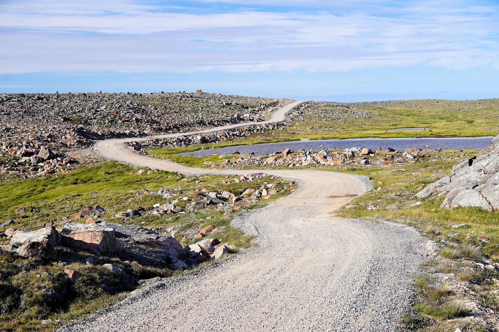 The tundra run on the quad is a real mixed bag of terrain. Lowland stretches through any grasses are often buggy, boggy, rutted out and rather terrible. Highland grass routes can be pretty good and flat. There are spaces of rough and jagged rock, sharp like sheets of vertical embedded shale sticking up or otherwise, just variable sized rocks to swerve or hurdle. Gravel beds are also present, areas where its laid flat to the ground just like a driveway, and there’s also sandy patches too, ones that are far from eskers though. Plenty of land I presume would be ancient seabed..? The area around Taloyoak is certainly rugged enough, not Baffin Island mountainous but plenty of great hills and rocky ridges to make it all seem a bit more grand than some other places. After another half hour of spine massaging and muscle tensing through all of that terra Arcticus, I reached the plotted waypoint.
