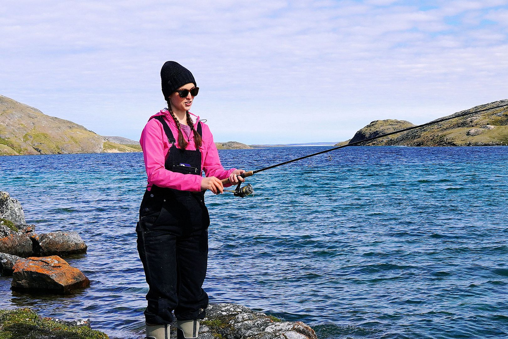 In Lauren’s absence Jordan readied some fishing poles for himself and the boys, all got casting. We did the same. Very quickly Jordan proved how well he knew these waters, catching a number of the only char in the area as we moved further on down the shoreline trying to change our luck.