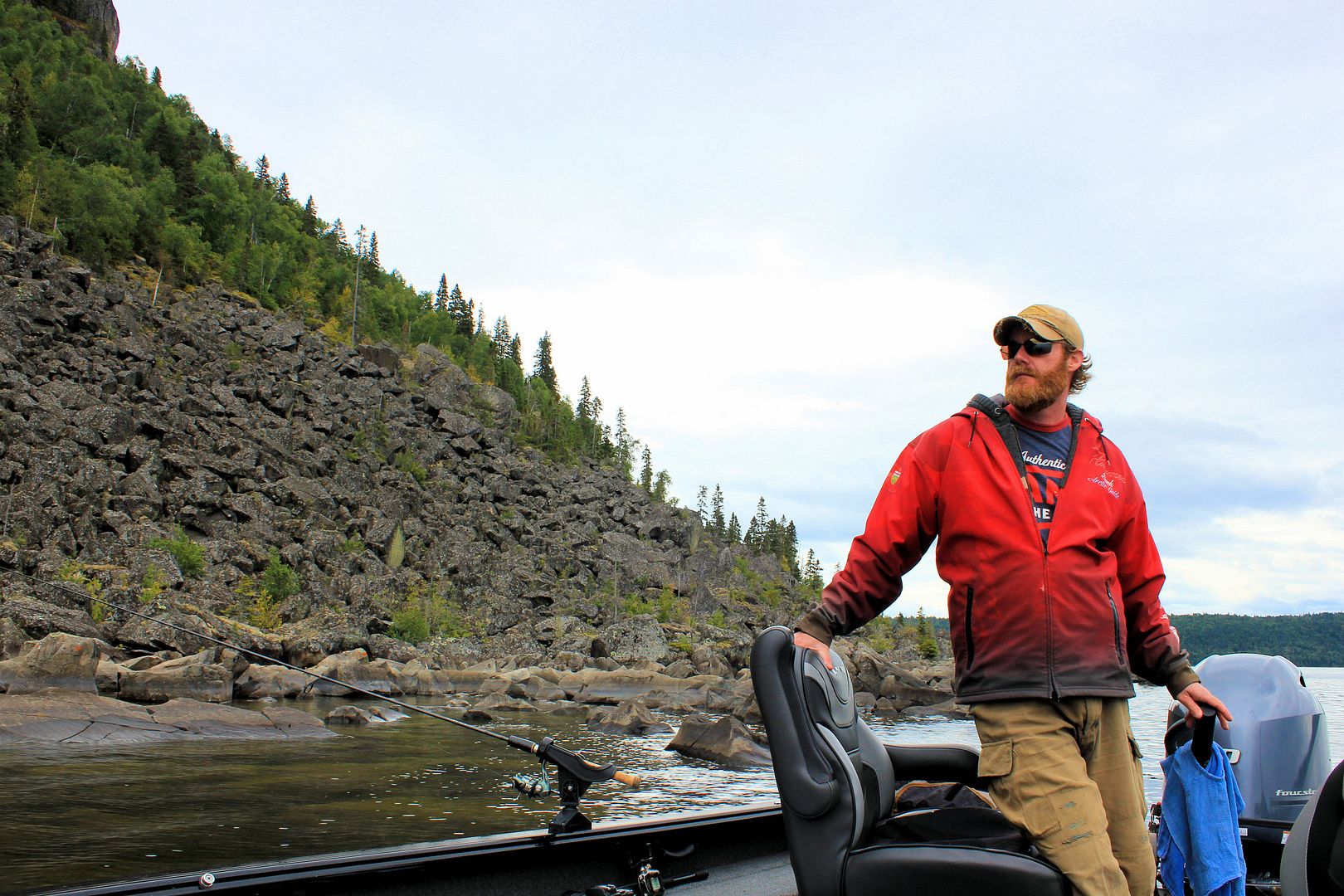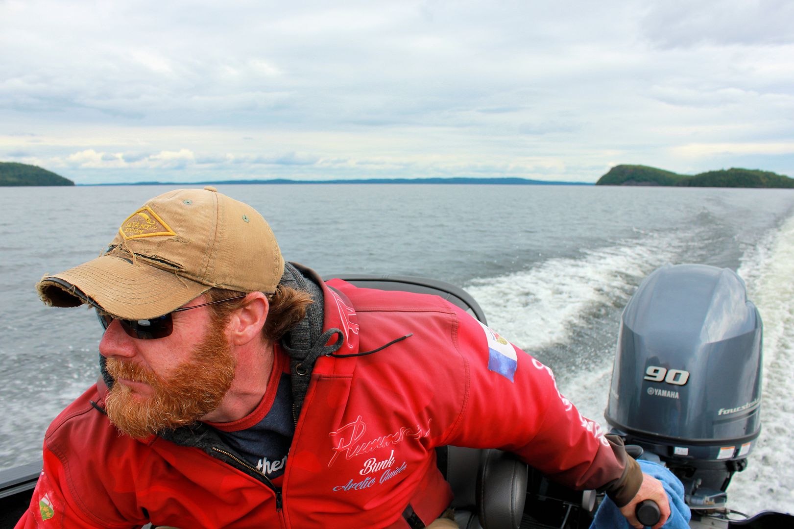 Taking a minute we stowed everything away in the boat, donned our heaviest raingear, threw on the life jackets and prepared to pound back to camp. The shortest direction wasn’t the safest, islands and shoals would need careful navigation so, I started us out awhile boating across the waves, riding in the troughs, until feeling we were far enough to cut 90 degrees and begin surfin’ Shania Twain home. Stevie clutched his InReach awhile, I’d remark later that the waves were probably 5 to 6 feet but he’d disagree and say 6 to 7. Whatever they were they weren’t always uniform and nice to play in, some were rather criss-crossy-pissy with us. The odd big roller to hop over I was forced to angle up the backside for any straight climb would push the RPM’s and bow to stand pretty high. In all honesty it’s time like this that again a tiller may soak ya a little more, but having the instant ability to make quick maneuvers that can smooth out the ride is so sweet. Having bounced through chop in equal sized consoled boats, other than a windshield for wind and spray I almost don’t like it, there’s far less zig-zagging that can be done to avoid the worst of the waves so your ass end forward in the boat takes the thumping. Best advice in big water though, never be 100% comfortable with any of it, NEVER! Anywhere!