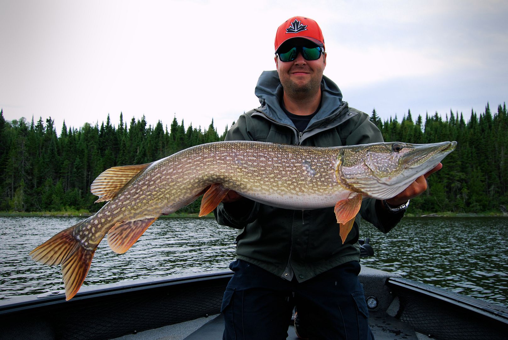 Over a couple hours we’d strike blows with plenty mid to high 30 inch pike but more importantly, pick up some numbers of trophy class fish as well. Can’t remember who got their big one first but Stevie set the hook into a pike that had him screaming with excitement. Seeing his fish I was stoked for him too. A real railroad tie of a pike that came to boat side much faster than expected, it was then we noticed very little hook holding on to it. A quick scoop in the net the pike went ballistic for what seemed far too long a time, thrashing and rolling in the mesh. Unfortunate but fortunate really, some fins split but Stevie had his new PB pike, a thick 46-incher. The fish swam away strong and like spawning wounds suffered each spring, it will mend up in time.