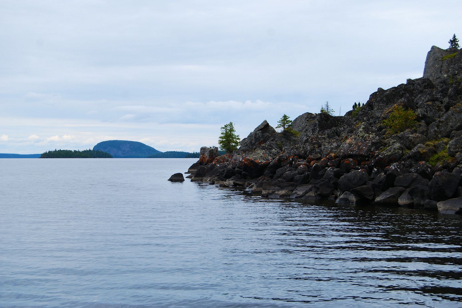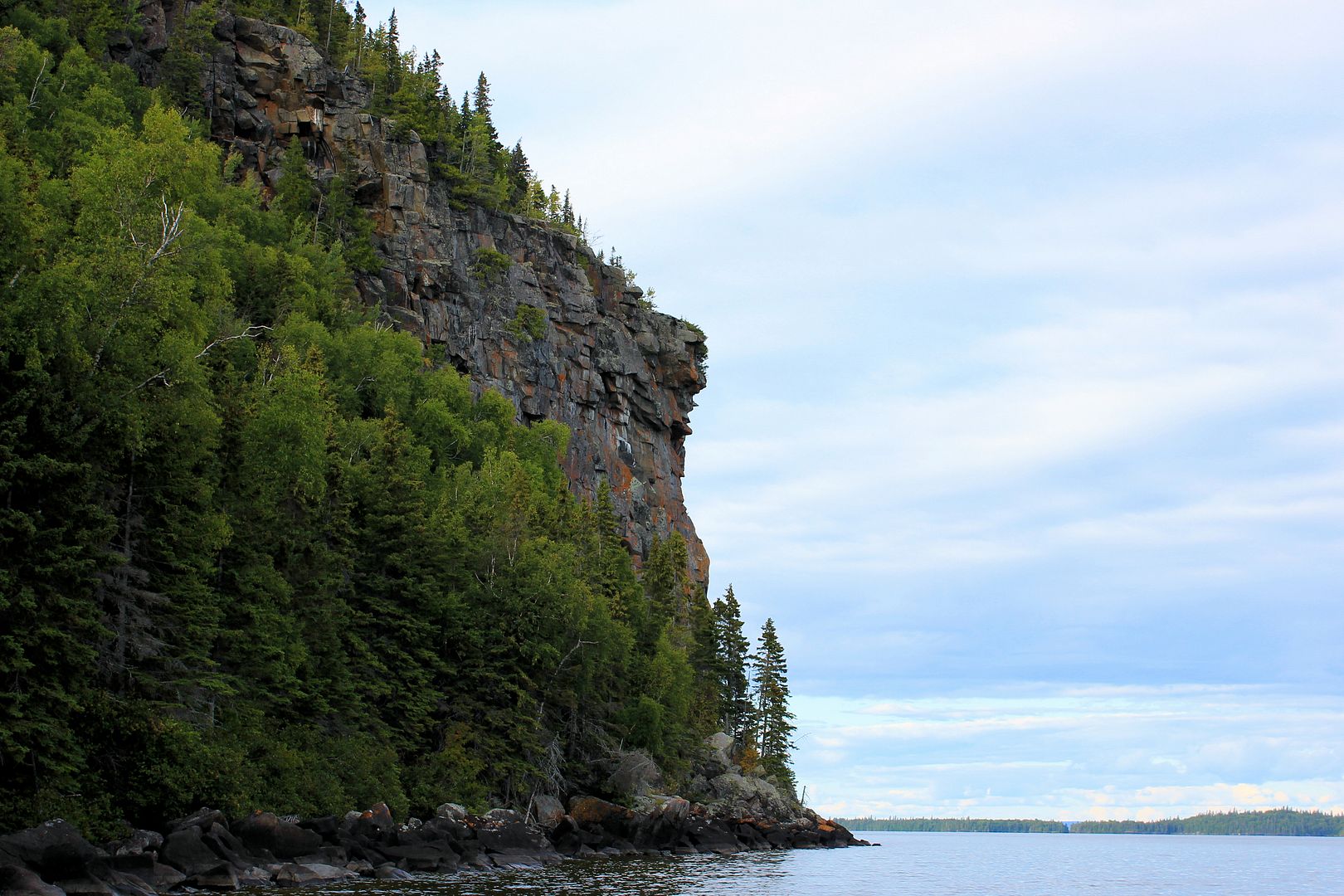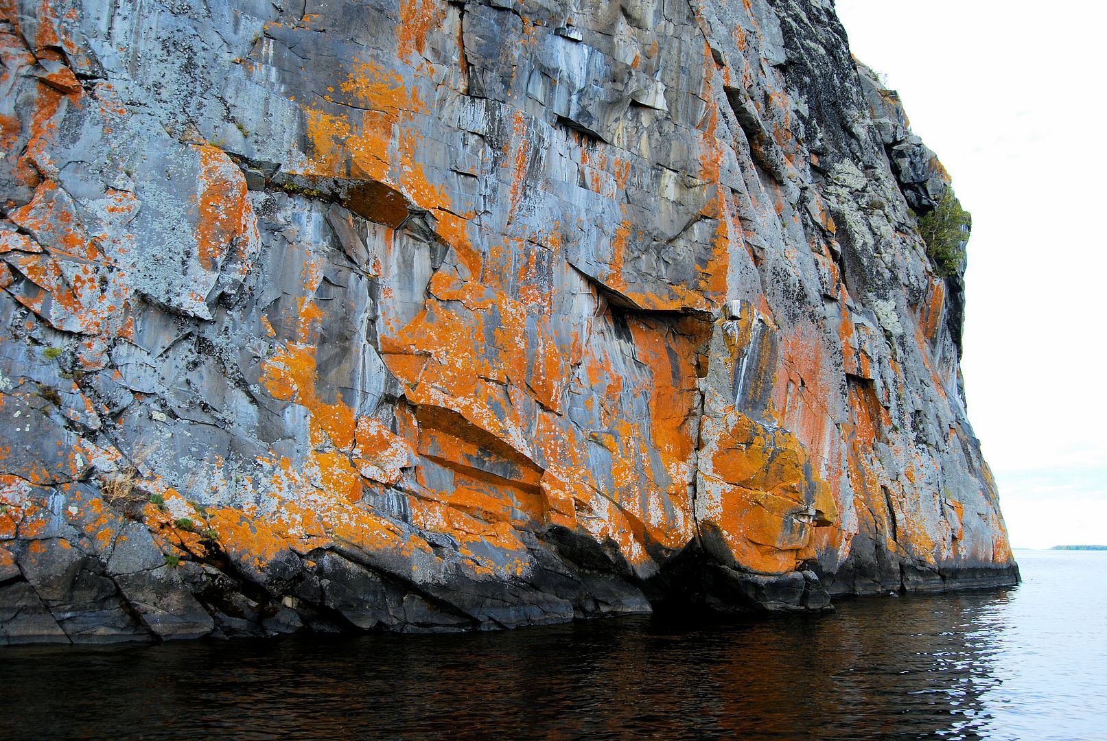 Stevie and I set out towards camp. When you’re back deep in the bays for hours with no way of checking on the big expanses of lake you’ll later have to return to, it’s a good idea to keep your head up. Inland it appeared the tree tops were swaying more and we took a sprinkle of rain but, outside and viewing the big lake it was still flat. We booked it for an offshore island that stood out like a sore thumb. With straight vertical cliffs and a good distance from anything pikey-like, we guessed it might give up our first speck. Cruising the orange lichen covered shores there, it was deep enough in places that I could have scratched the inside rod tip along the rocks while trolling by. Peregrines must nest above but we didn’t spot any this day.