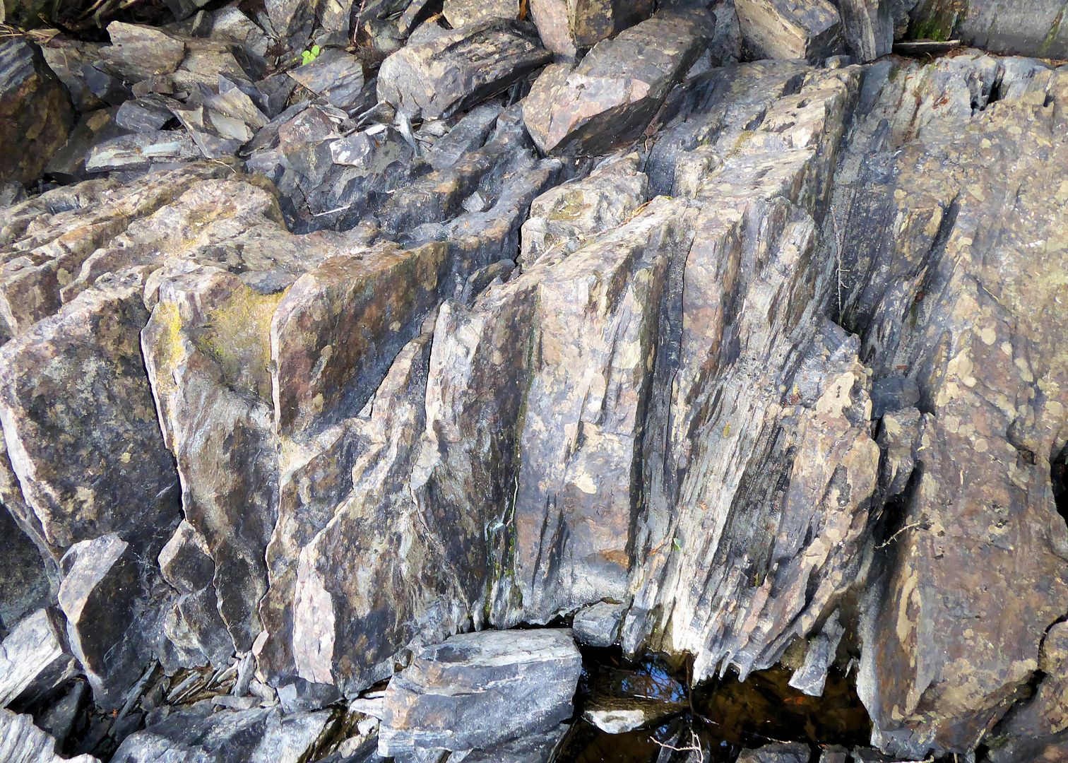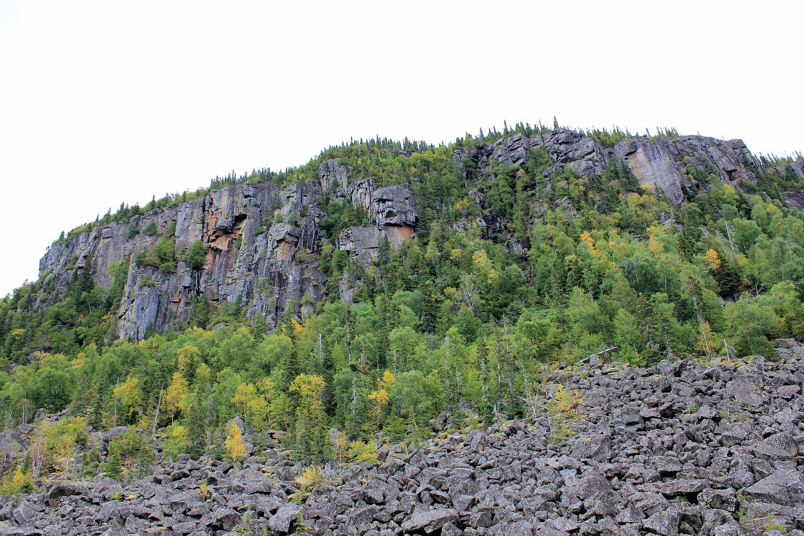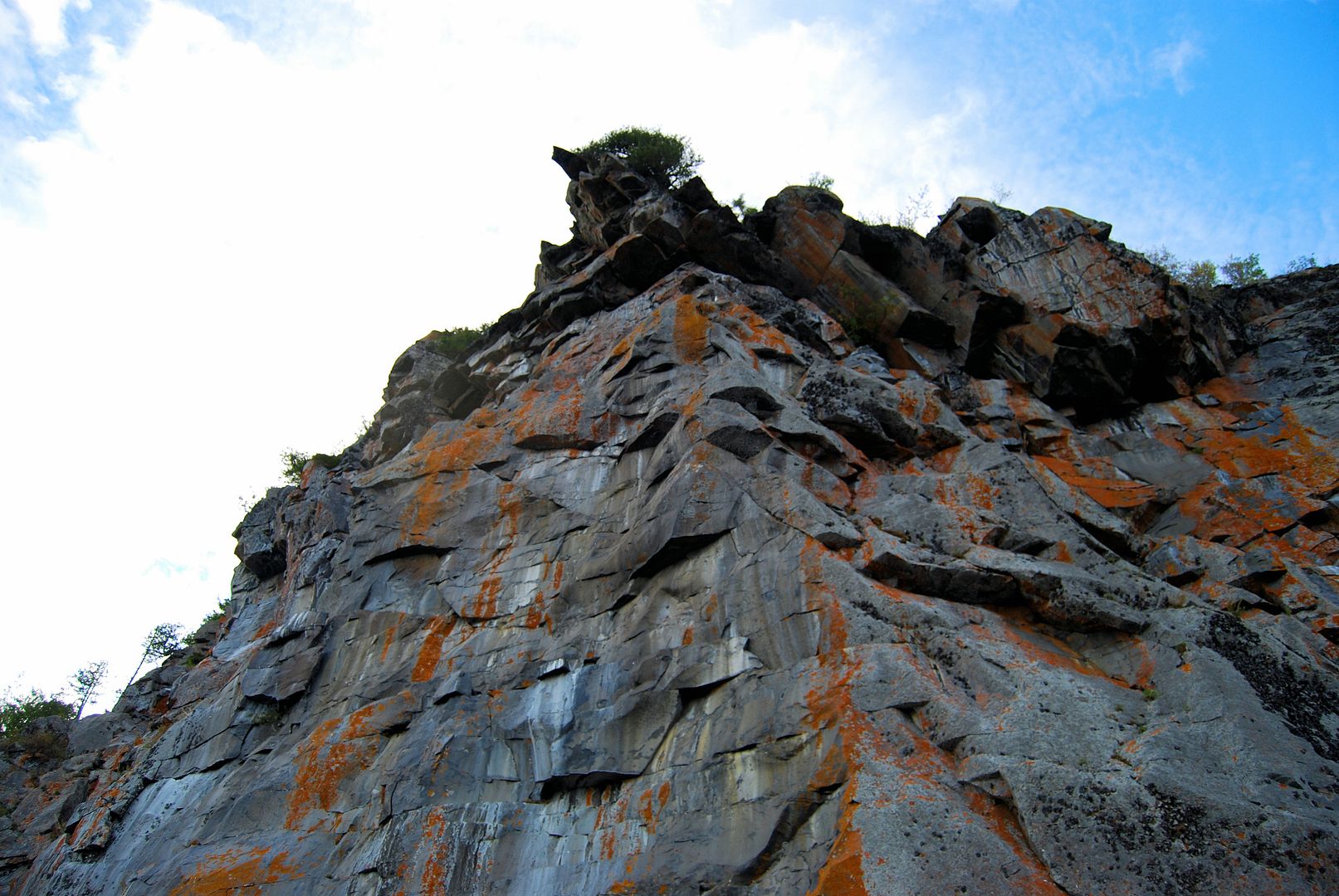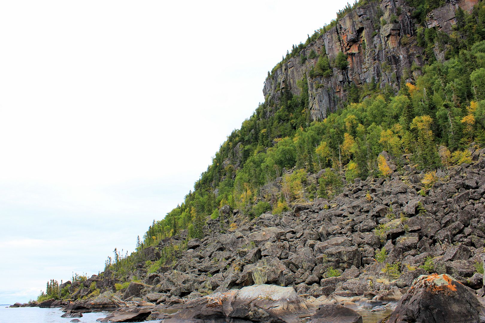 Stevie and I set out towards camp. When you’re back deep in the bays for hours with no way of checking on the big expanses of lake you’ll later have to return to, it’s a good idea to keep your head up. Inland it appeared the tree tops were swaying more and we took a sprinkle of rain but, outside and viewing the big lake it was still flat. We booked it for an offshore island that stood out like a sore thumb. With straight vertical cliffs and a good distance from anything pikey-like, we guessed it might give up our first speck. Cruising the orange lichen covered shores there, it was deep enough in places that I could have scratched the inside rod tip along the rocks while trolling by. Peregrines must nest above but we didn’t spot any this day.