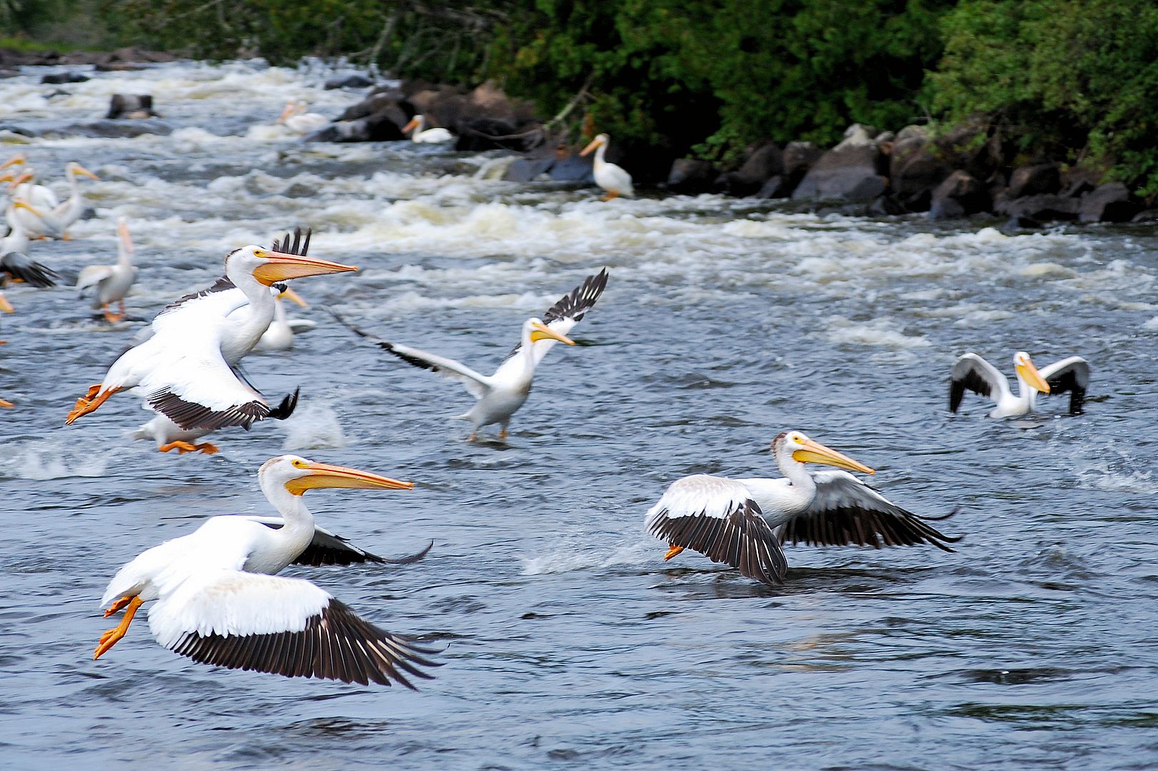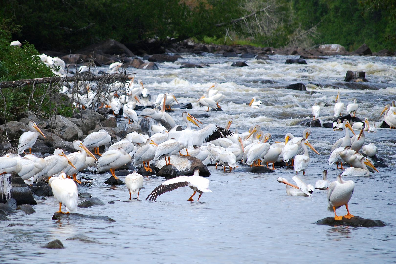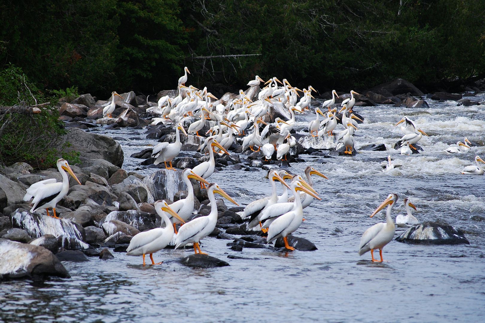 After our troll and discovery of a couple new campsites, the dinner hour coming on we cruised deeper into a back bay towards an incoming river. Arriving at some rapids we found quite a site waiting. The largest flock of Ontario pelicans we had ever seen.