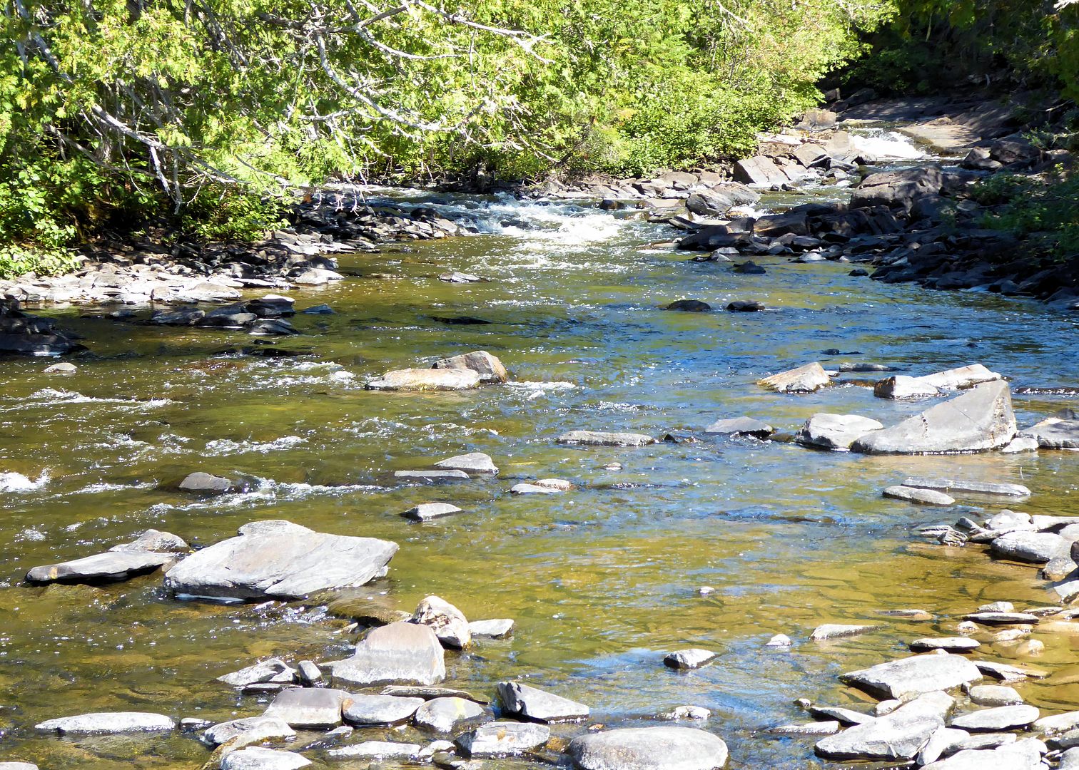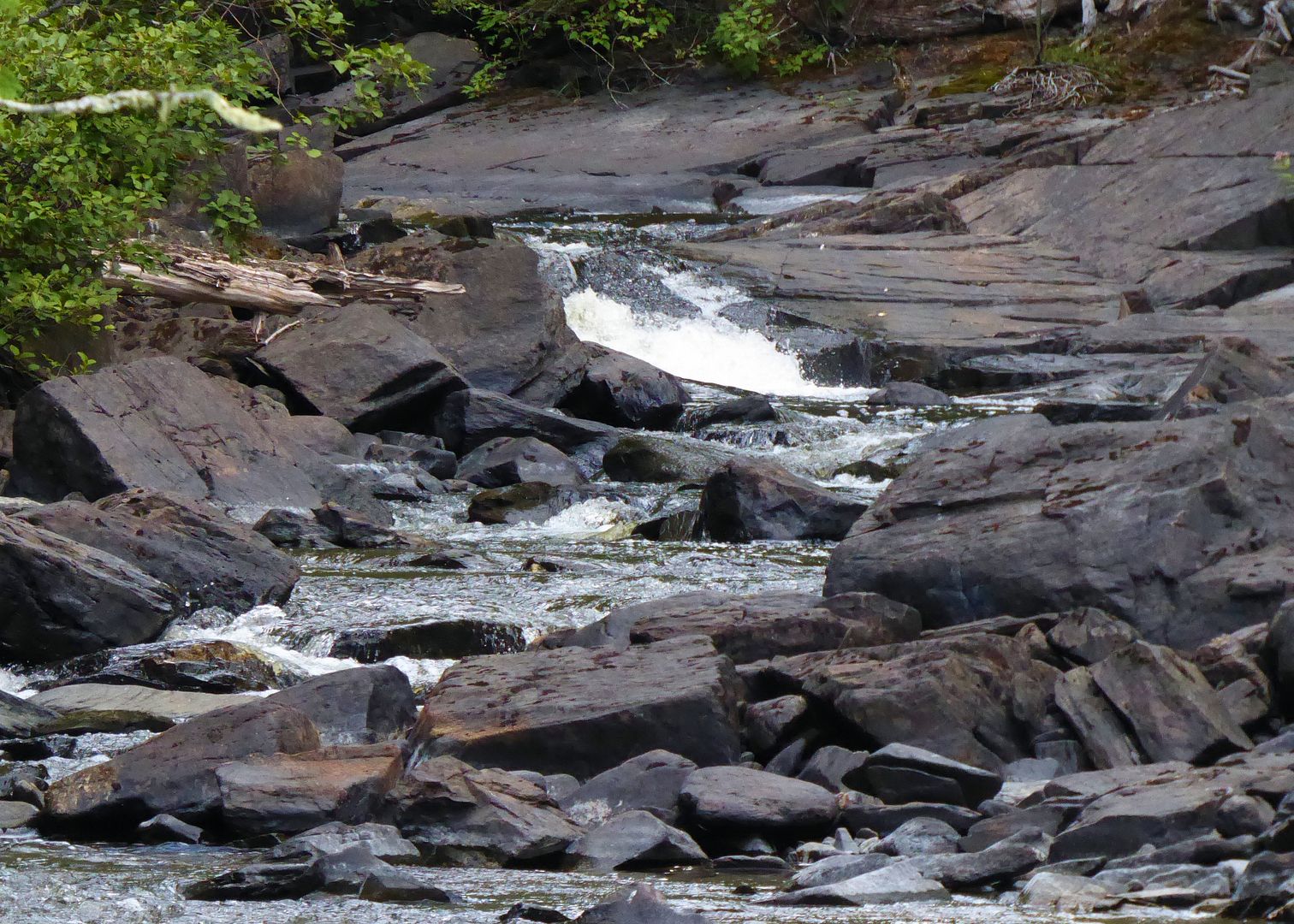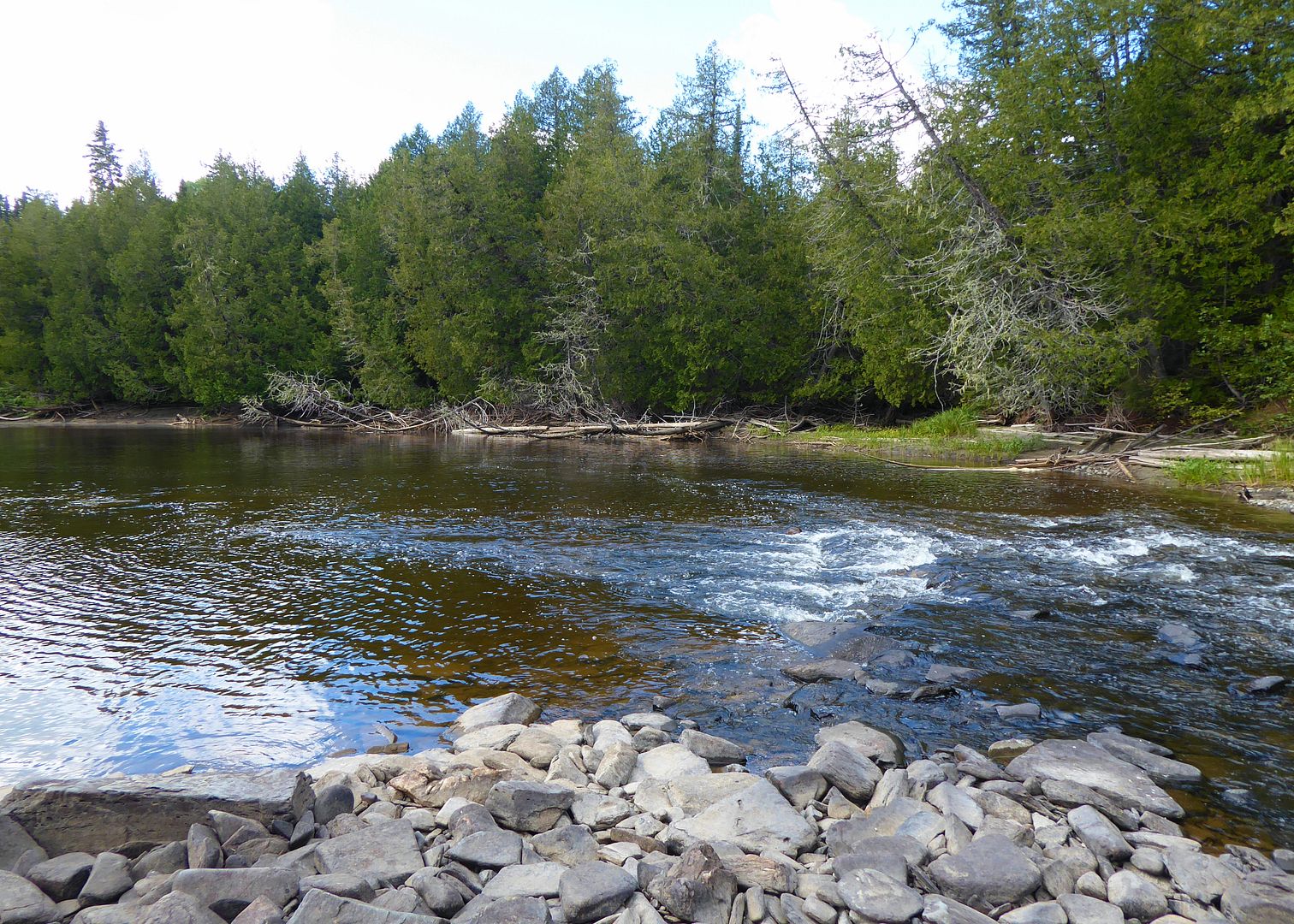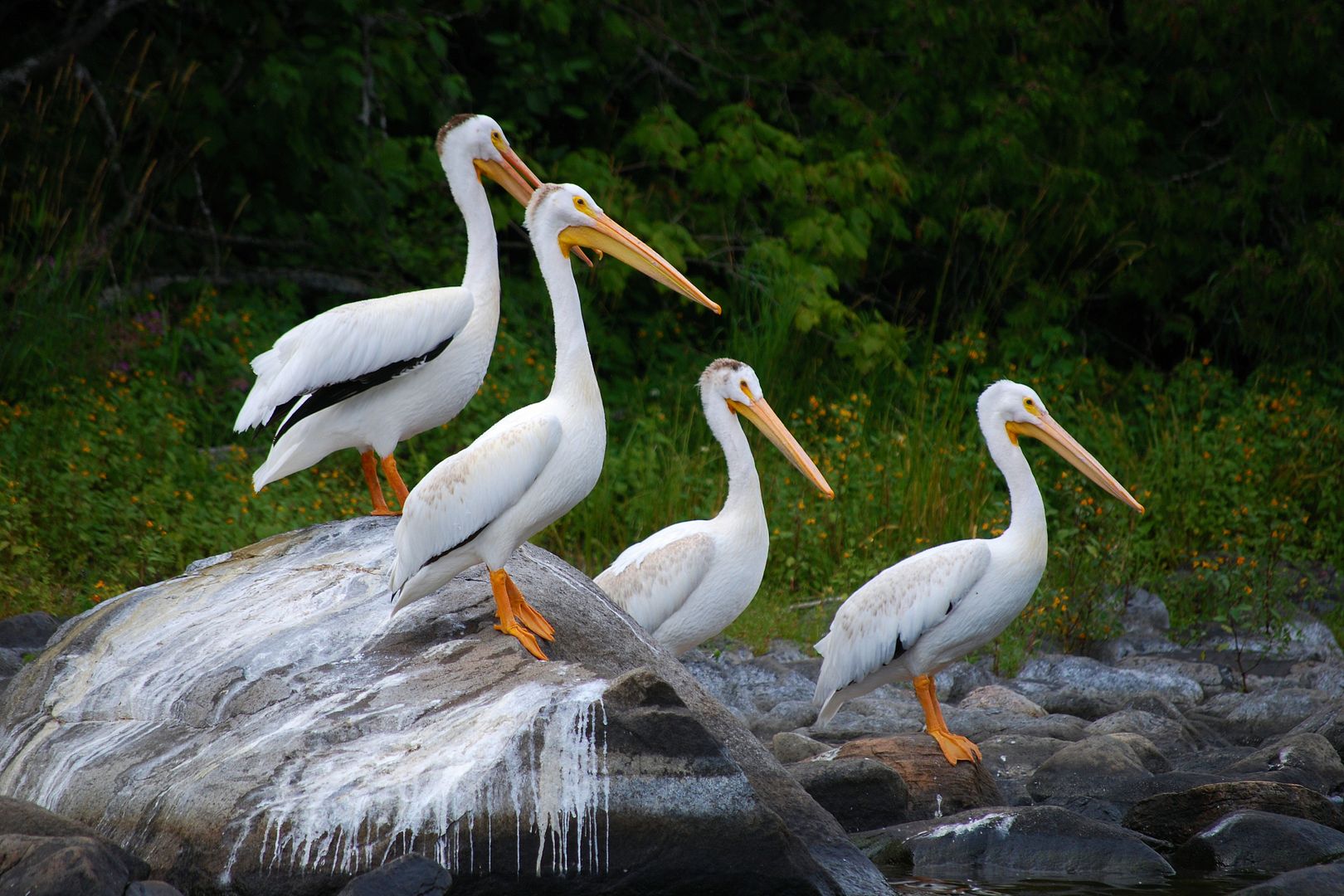 After our troll and discovery of a couple new campsites, the dinner hour coming on we cruised deeper into a back bay towards an incoming river. Arriving at some rapids we found quite a site waiting. The largest flock of Ontario pelicans we had ever seen.