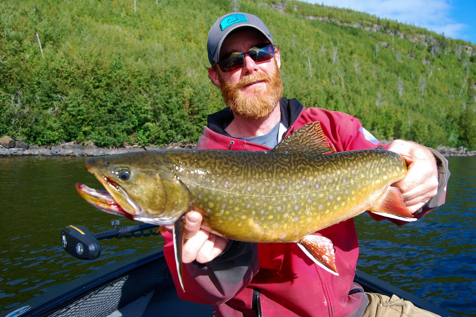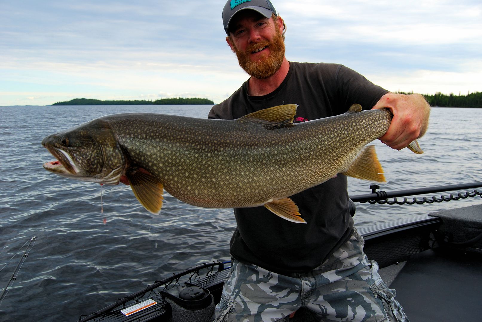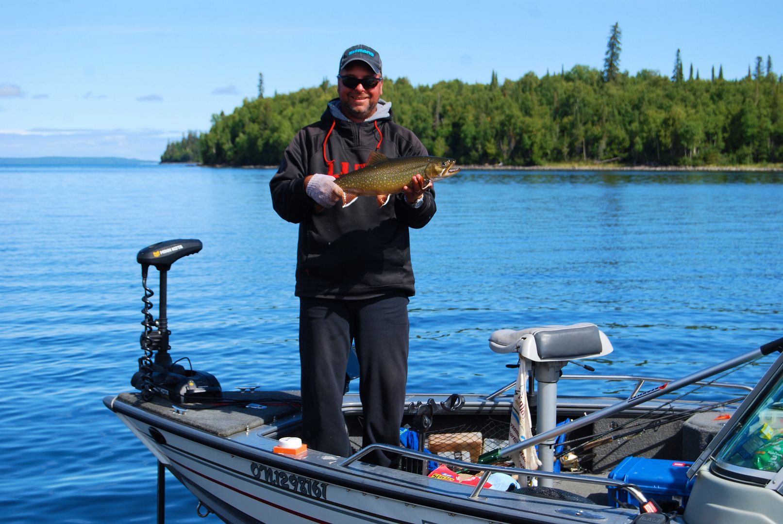 Damp but dry come morn the winds overnight switched 180 and laid down. Drifting outside of camp I didn’t notice the boat slide into shallow rocks before it was too late, the skeg took a little bump. We decided to start on lakers and when I found a dime on the floor I said to Stevie, “first fish, call it.” He won the toss and kindly offered me the first.