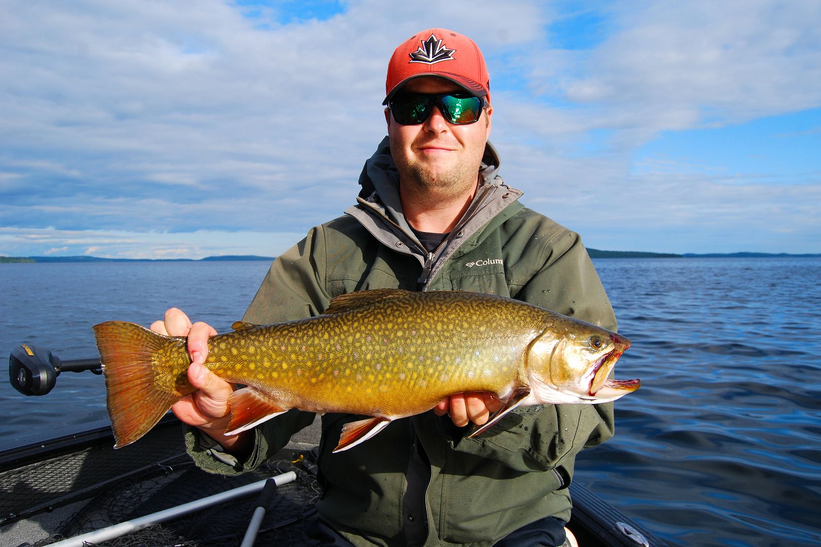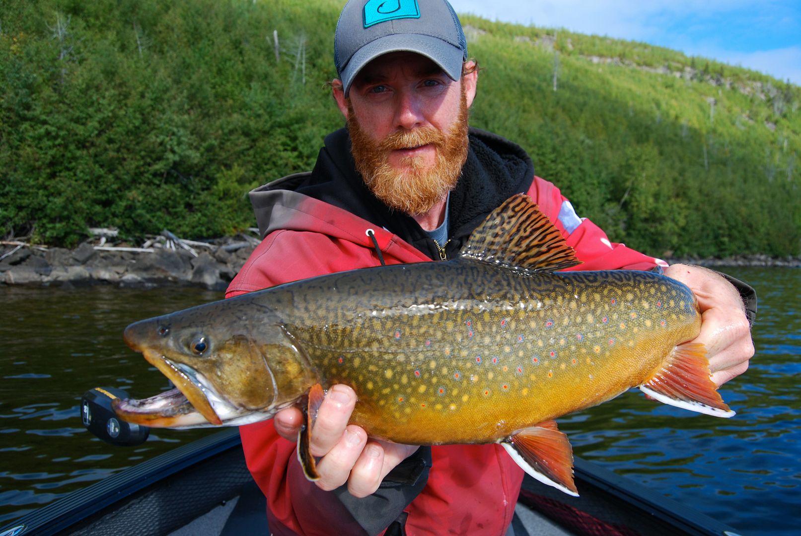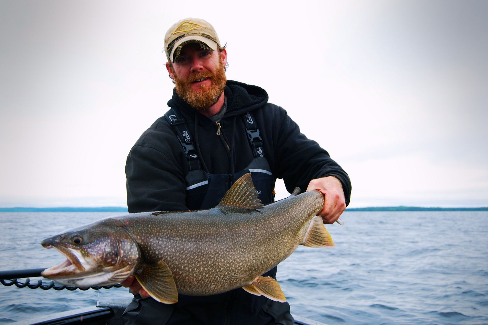 Damp but dry come morn the winds overnight switched 180 and laid down. Drifting outside of camp I didn’t notice the boat slide into shallow rocks before it was too late, the skeg took a little bump. We decided to start on lakers and when I found a dime on the floor I said to Stevie, “first fish, call it.” He won the toss and kindly offered me the first.