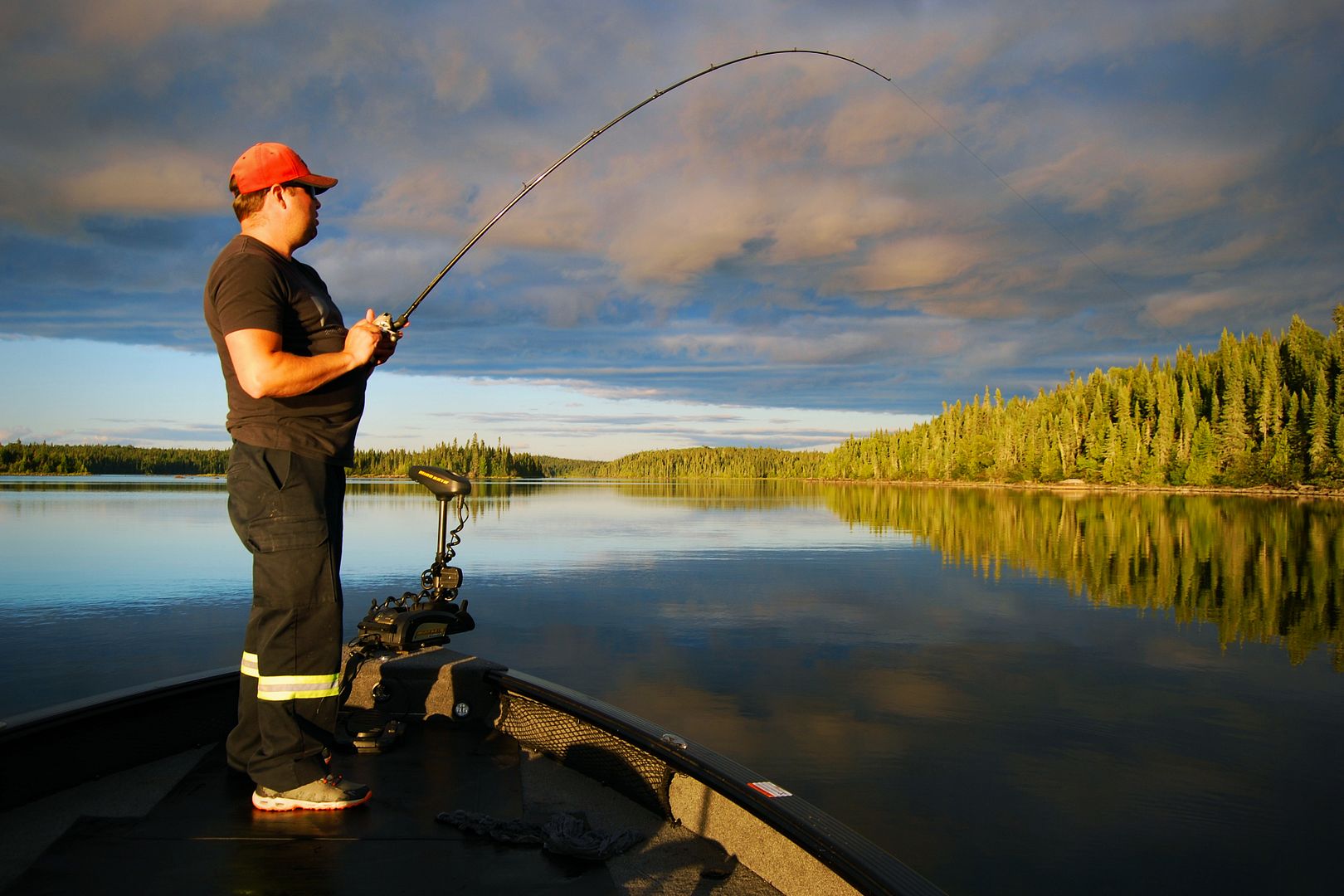 A scorching evening the winds had lied, it was dead calm. Another boat was nearby, the guys hootin’ and hollerin’ and maybe catching some fish. On the graph it was loaded on bottom with fish. Later I’d ask Rob if what I was seeing were walleye and he’d answer that most surely are. For now though, they were lock-jawed, and I only got me a pike. Fishing being slow I was able to set auto-pilot on the troll and manage having a wash in the boat. Time seemed to fly by fast, and in a blink the sun was setting.