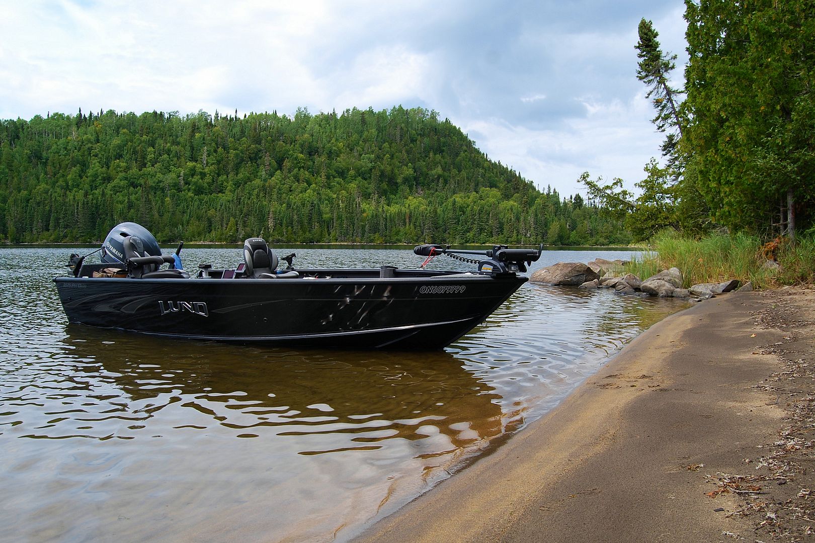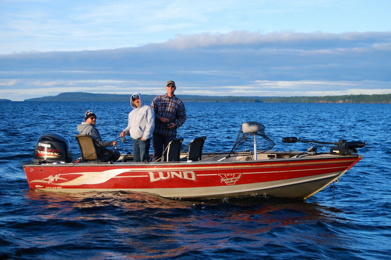More boats were out but so far for the entire trip I’d seen a Sylvan, two Princecrafts, six Lunds and my own rig. Some new fellas showed up in a big white Lund ProV with a Yamaha and we said hello in passing. I’d quit at 7:30pm after eleven hours fishing, it felt like everything had been done to death, including me. Back at camp I found the ProV boys had set up close by, after a chili dinner and well before spitting rain began to fall, we all enjoyed a campfire together and a few drinks. Good company!