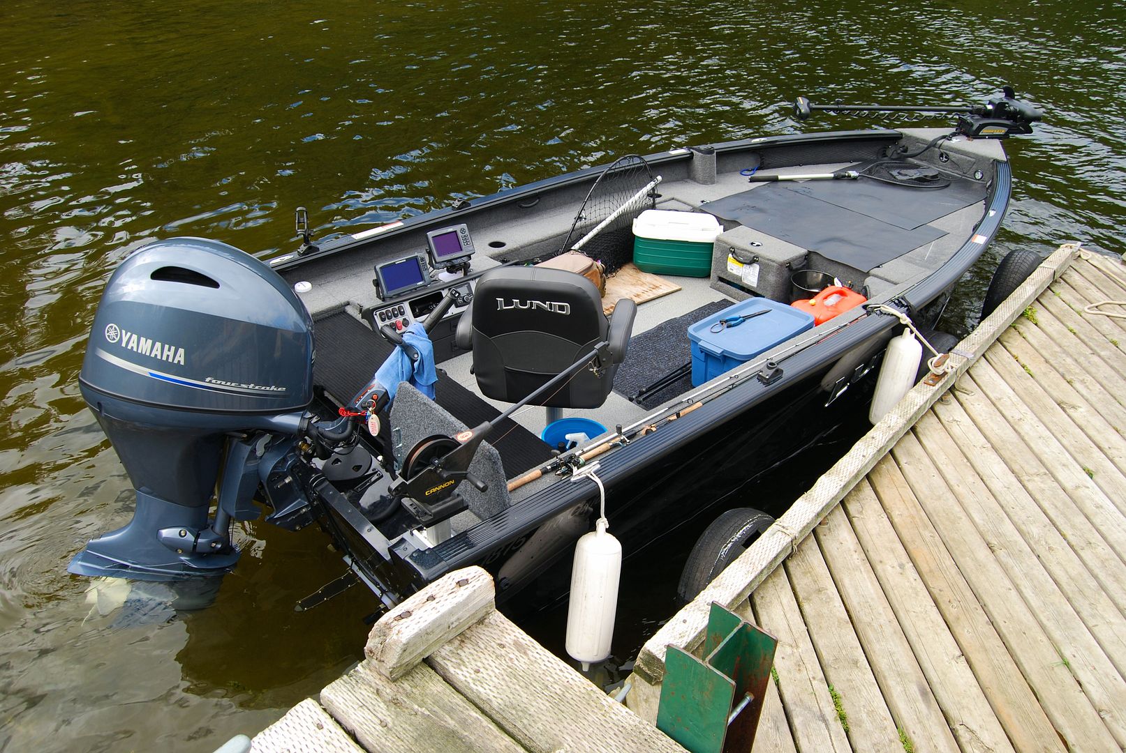 On plane at 35mph I kill the motor, begin trimming and am still gliding into a rocky point with no way of stopping. No choice, springing from my seat I ran and jumped midway off the portside, luckily landing with two feet on slippery wet boulders. Turning around I grabbed the gunnel, blocked and pushed the bow of my boat away from the shore. Right through the midsection I had to lean hard against the Lund and when the transom began to pivot into the rocks I felt the boat strike something. Having redirected the bow outward the boat then angled to drive away from shore but the wakes from others tried to push it back in, the transom kept swinging in towards the rocks and in heavy danger. Motor remaining down, somehow unscathed but still in an idle drive forward, the boat began to pull away from shore and I couldn’t stop it. A split decision I leapt toward the boat, clinging to the gunnel and pulling myself over and in. Frantically scrambling on hands and knees I crawled to the bow, popped the lever to deploy the Minnkota and instantly hit 10 on the pedal forward. Had a fucking heart attack for a second, caught a breath then drove over to the dock like nothing happened. Al asks later, “I wondered why you were getting out of your boat over there?”