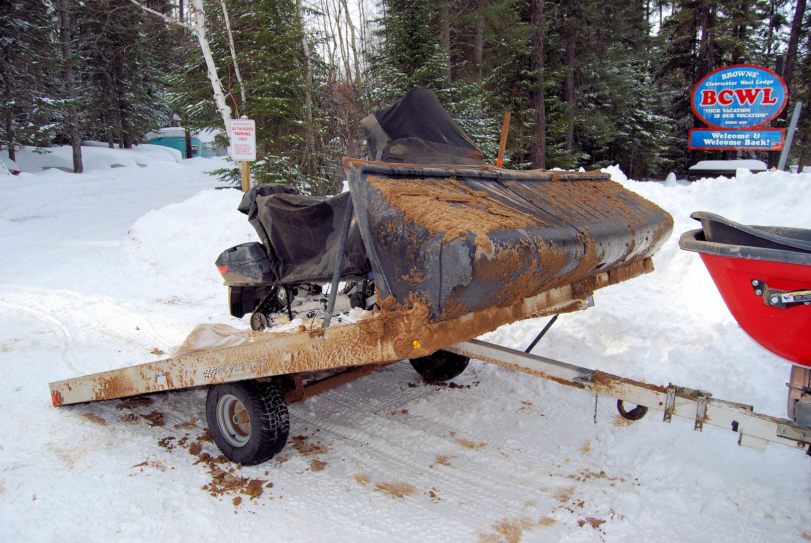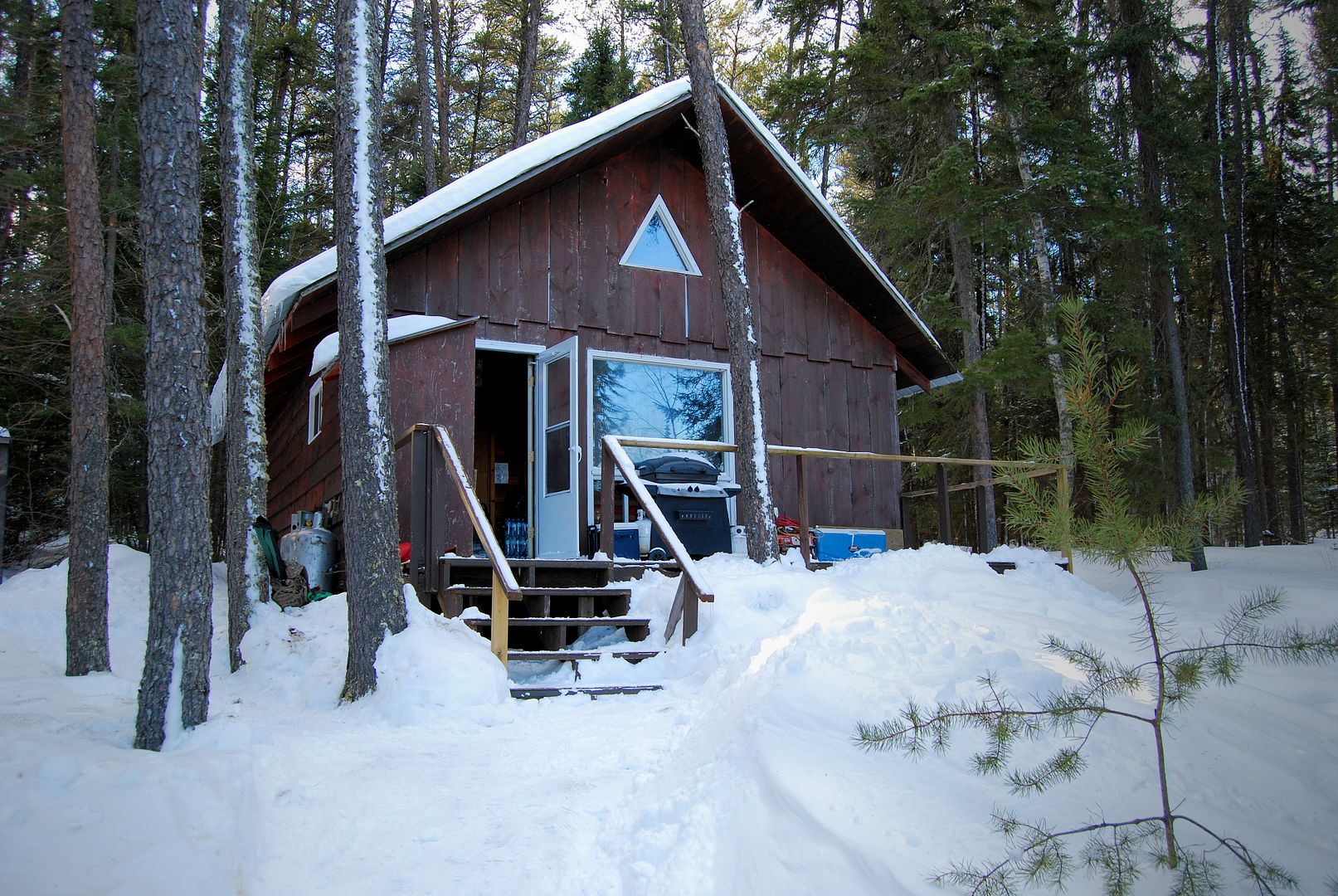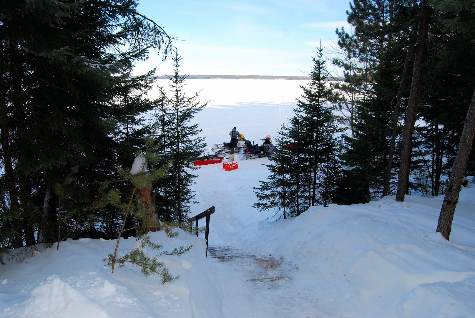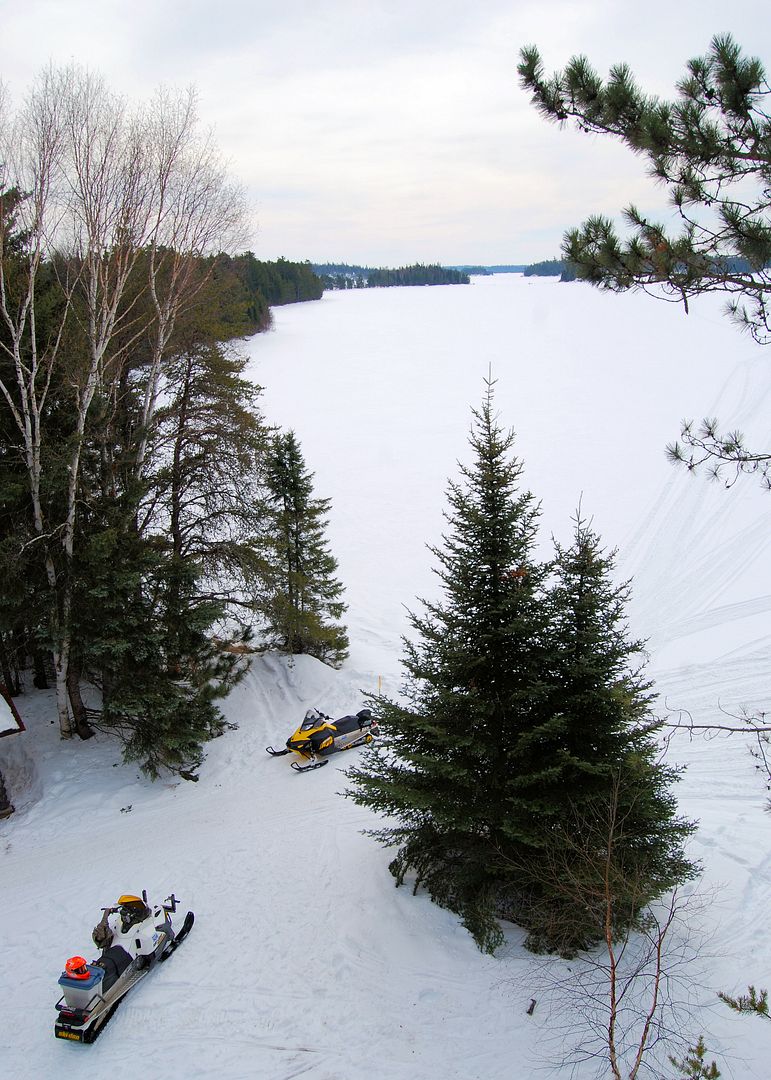Patty was told by Brown’s very little other than park where we had stopped earlier, load up your skidoos, go out on the lake, follow the markers left of the resort shoreline and we’ll find it. Wood should be there, propane too, and “have fun” she said!