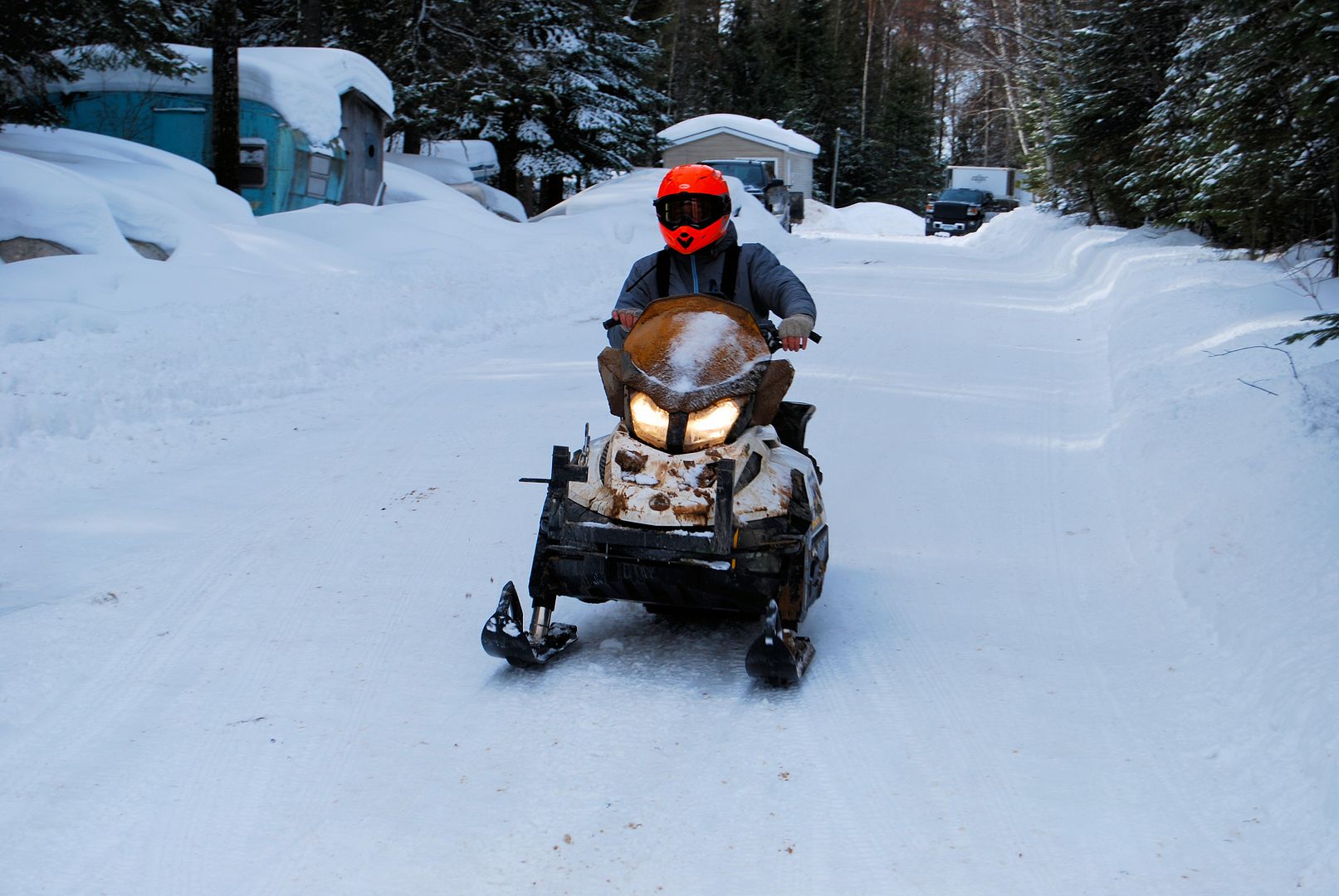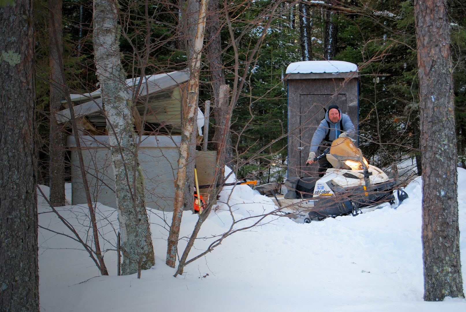 On route back with Shayne on the big Venture I dipped the left ski just off the hard-pack trail and buried it into some deep snow. Fifteen minutes of digging, lifting and sweating our brows to balls off we finally got it back on track. What a shitidiot move Bunk!