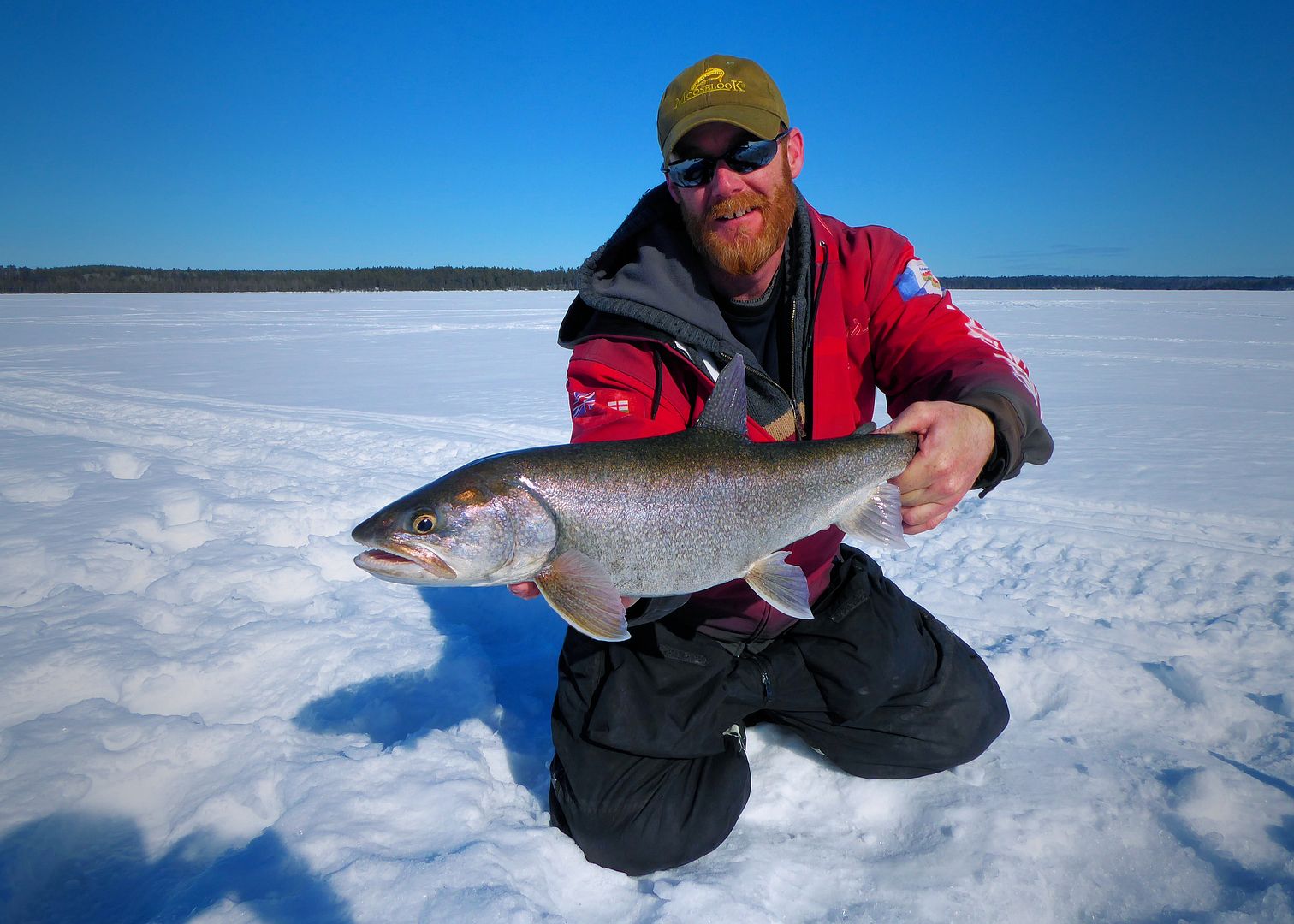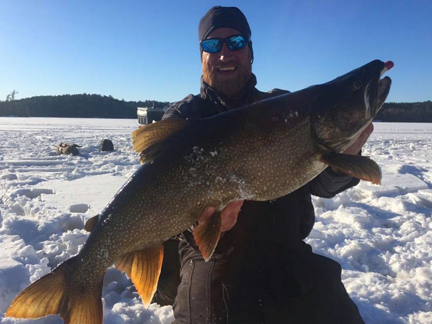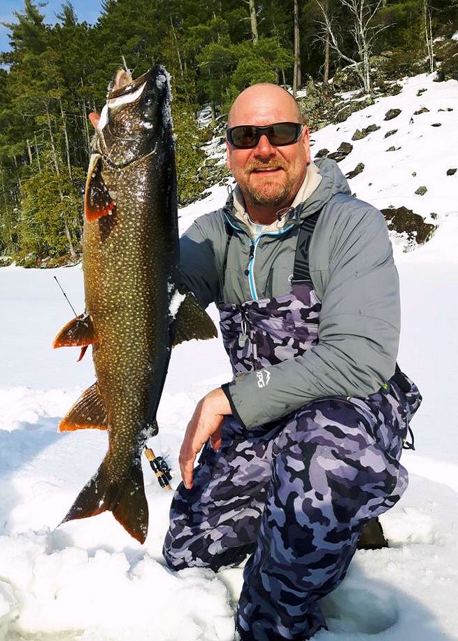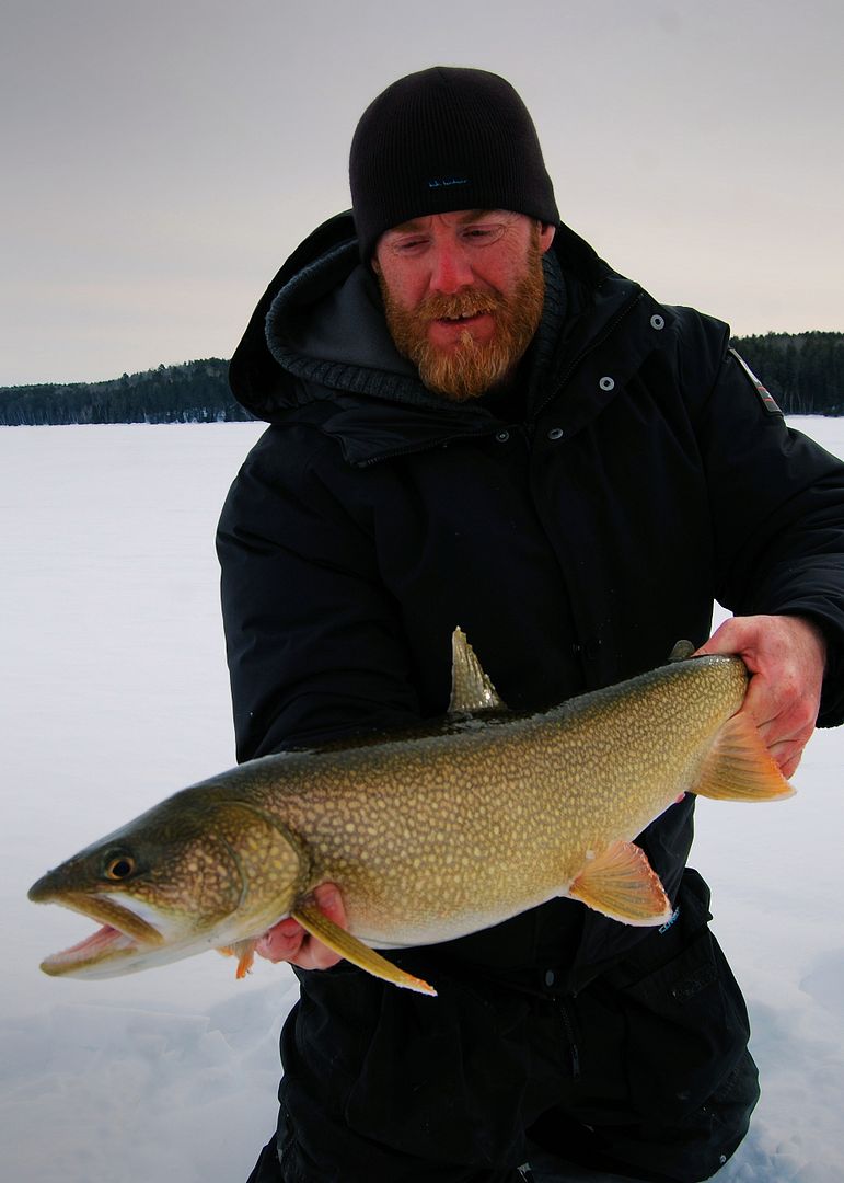 The sun was beginning to set when Pat’s still rod with a live minnow twitched and bowed. Springing off his snowmobile seat he was on it fast. Real solid bender of a fish on the light stick and four-pound test, the man played it to perfection. All watching on, all excited to see what it would be, Patty called out laker long before it ever appeared. And well, he was right! A real nice one too.