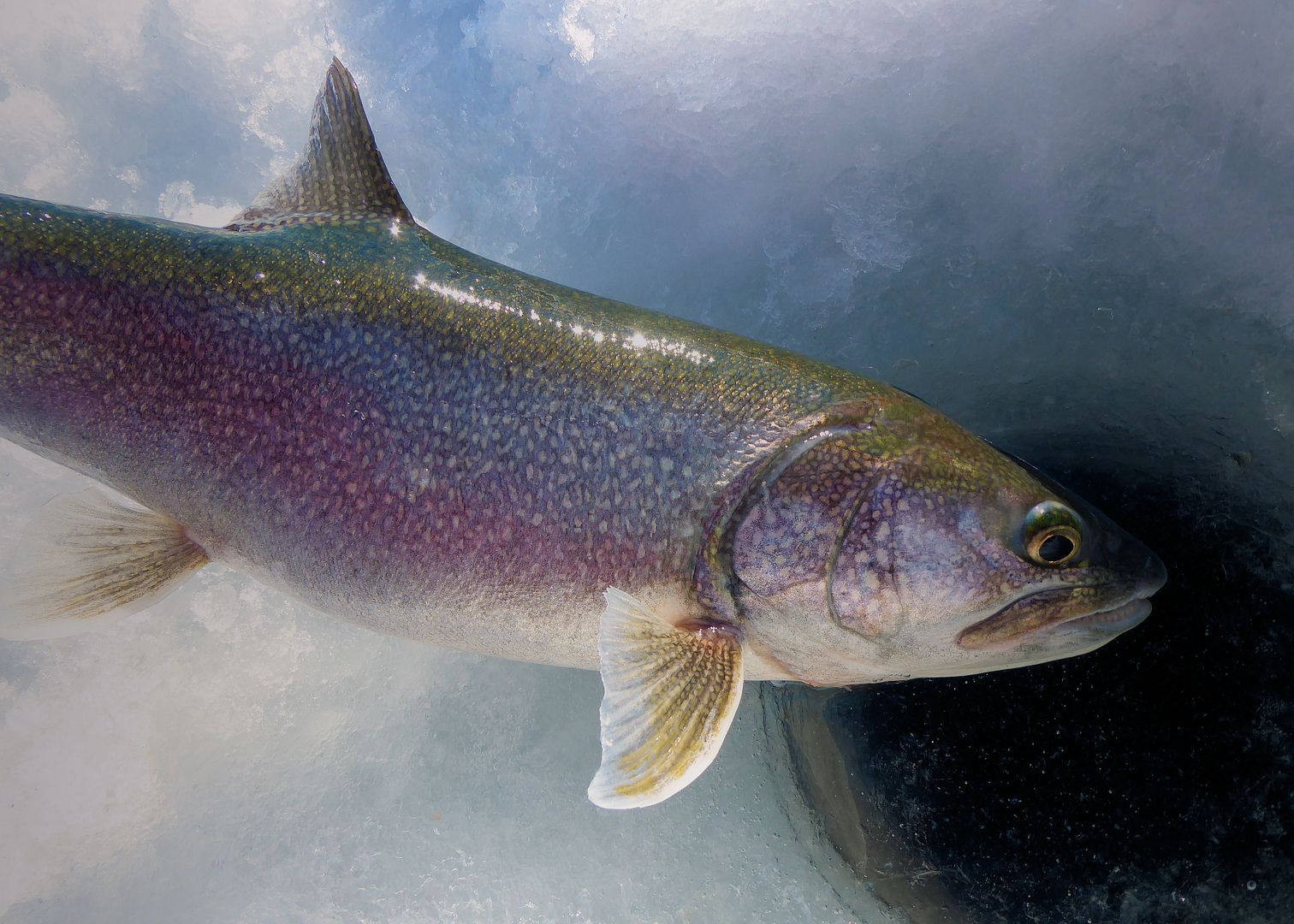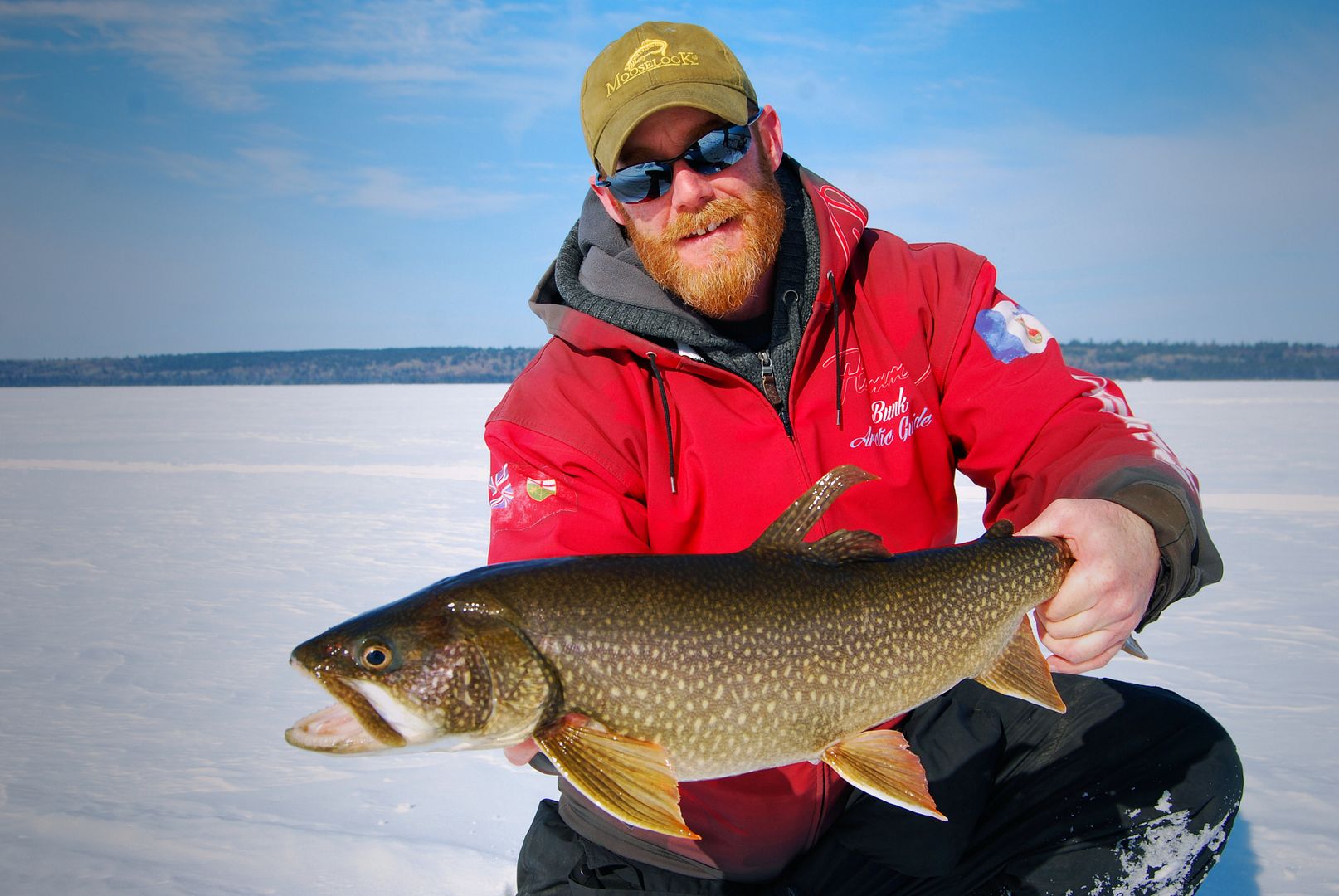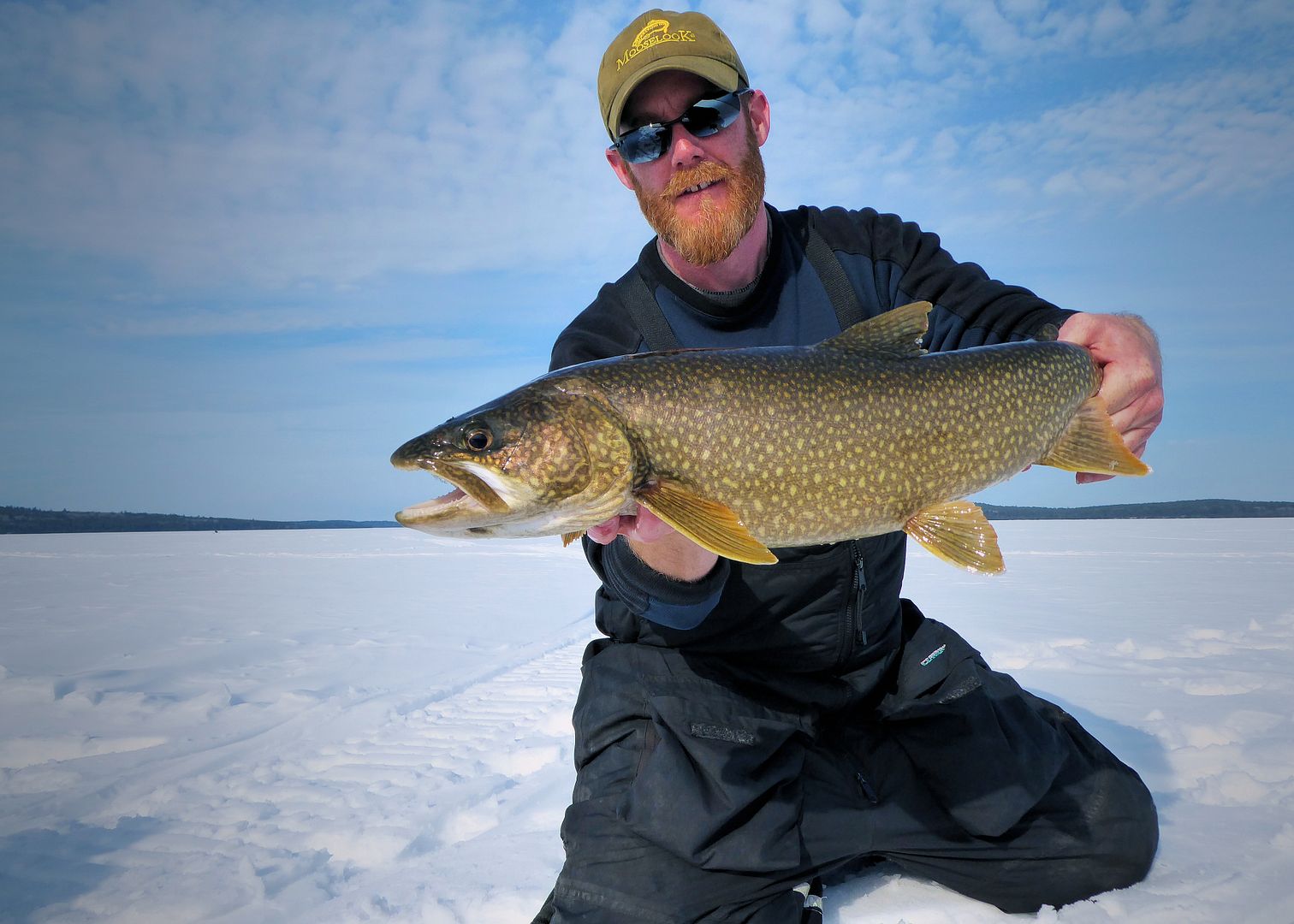 The sun was beginning to set when Pat’s still rod with a live minnow twitched and bowed. Springing off his snowmobile seat he was on it fast. Real solid bender of a fish on the light stick and four-pound test, the man played it to perfection. All watching on, all excited to see what it would be, Patty called out laker long before it ever appeared. And well, he was right! A real nice one too.