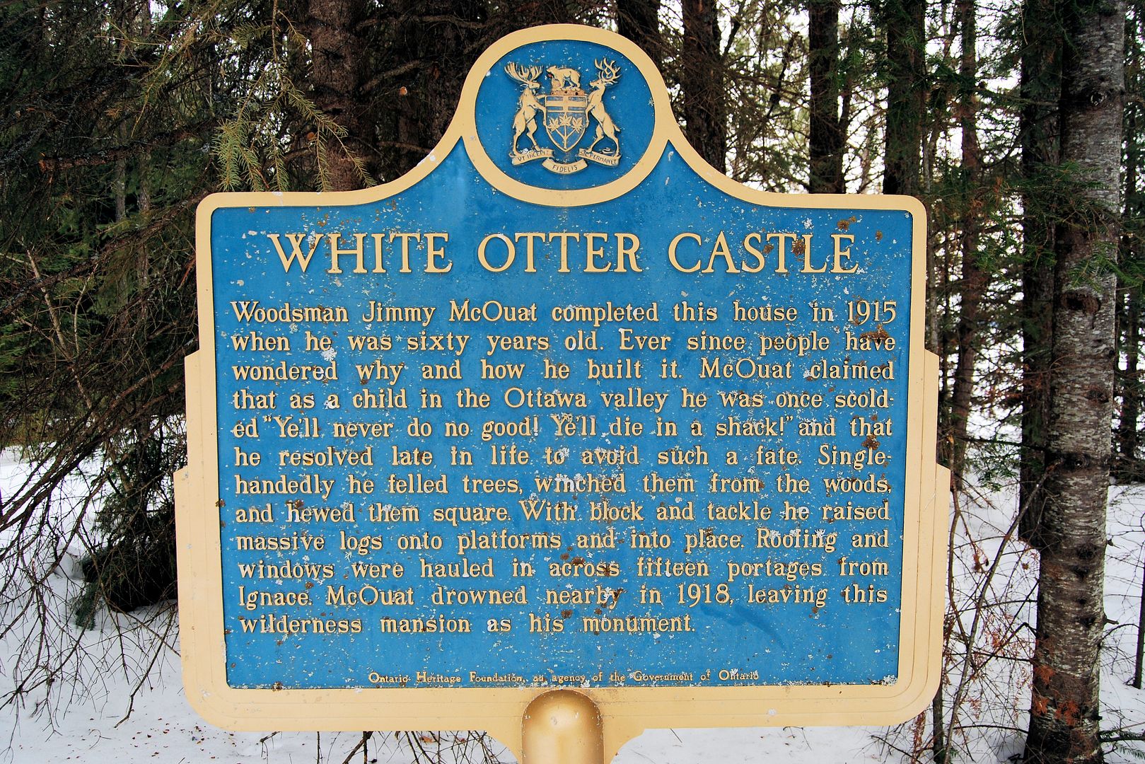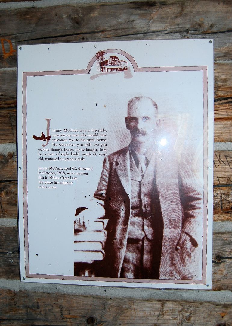 Reads: Jimmy McQuat was a friendly, unassuming man that would have welcomed you to his home. He welcomes you still, as you explore his home try to imagine how he, a man of slight build, nearly 60 years old, managed so grand a task. Jimmy McQuat, age 63, drowned in October 1918, while netting fish in White Otter Lake. His grave lies next to his castle.