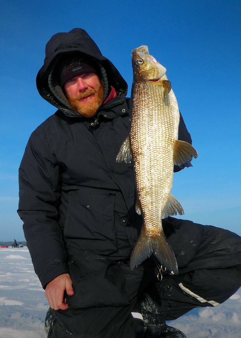 A fleet of local anglers pulling pop-up huts behind their skidoos convoyed across Clearwater. “See, they know what time it is!” And after our new holes were cleaned, at an all new spot, we didn’t jig long before a grey bumped on a bottom thumper. Hookset!!!