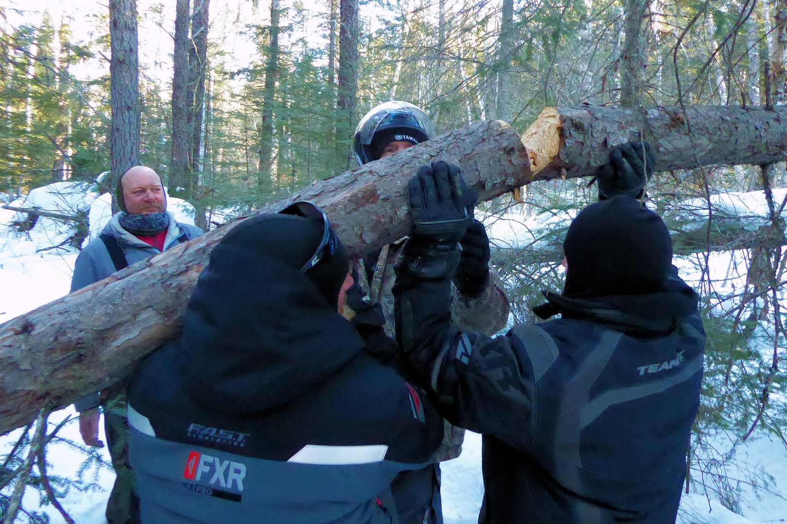 But we fellas were all ready to tackle some place new. Finding a trail head into another lake the previous afternoon, all set off with high hopes of accessing a new big body of water holding lake trout. On the trail we were quick to find that although it had been broken once that winter, it had certainly been awhile since used. Pat lead the way, the lighter weight Tundra with a narrower ski stance is a great machine for blazing the path… but it still can’t go through trees.