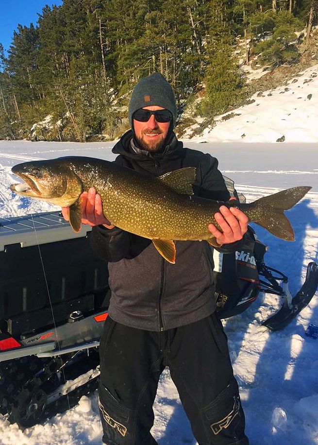 Exploring for a trail head we all came up lost. Stopped at a creekmouth Patty basically just said to drill him a few holes right there. Didn’t care the depth, figured it’s a creek and something will come along, maybe walleye, maybe pike, who knows. Well, holes drilled he was left with 13 to 20 feet of water to play in and then the rest of us left. Adam and Scotty went stage left, Shayne and I stage right. We were all within sight of one another and with the wind finally down some we could hear all if we yelled at the top of our lungs. The four of us who had left heard Patty yell out first. Barely audible I made out, “BIG FISH ” I kept the echo going to the others, Adam jumped on his skidoo and rode over quick. Patty did nail a good one, a bit wrapped up and not quite as big as he had initially thought, but it was enough of a motivator that within twenty minutes every one of us was drilling around Patty’s holes. However, I did take a side trip to a point nearby to distance the X67 and explore. Stupid move.