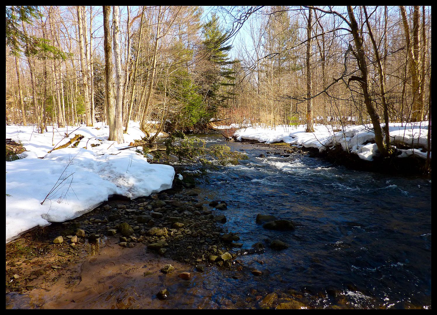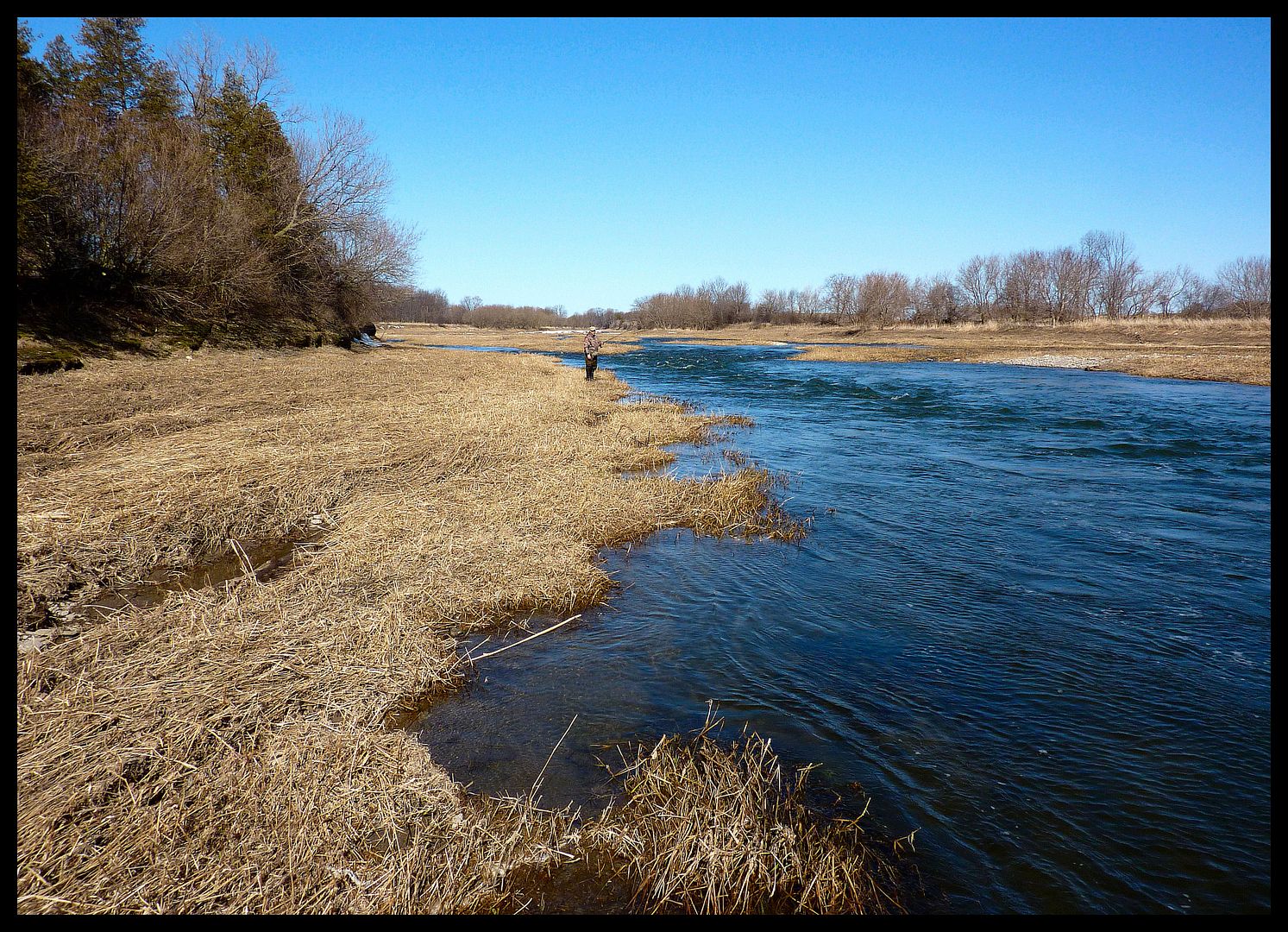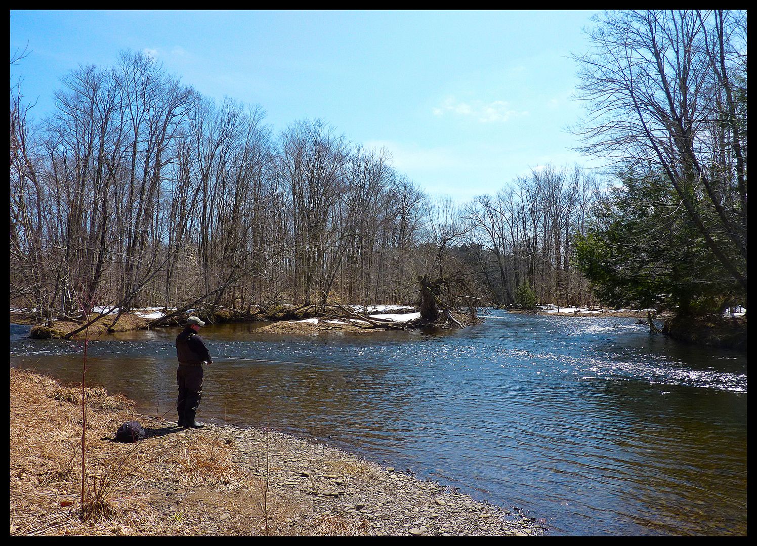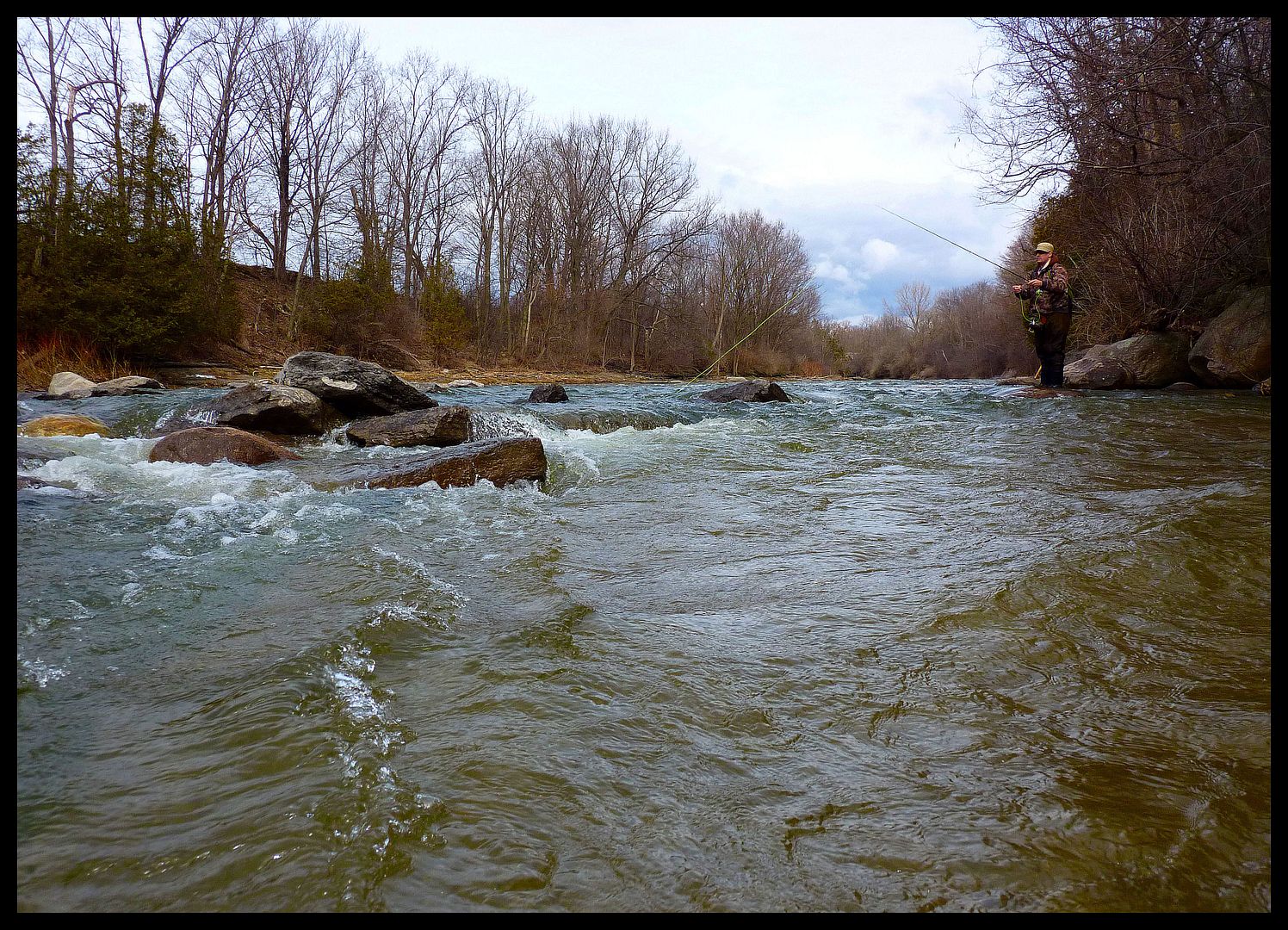 It was round then on a south wind that a courier pigeon arrived. In its beak, the delivered note read… “Twas nice giddayin’ ya in February up on the ice up in Qeebec. Saw one of your river photos on my Grandbaby’s FaceSpace and wondered a touch if you’d be into goin’ for some spring steelheads end of the month” Signed, Lukeberry Schoobs. Tickled pink with the notion that someone actually wanted to fish with yours truly, I was giddy when tellin’ the Missus about my plans to leave the homestead fer a couple days. Spring steelheadin’ was a foreign notion… but I’d the gist of it from doin’ ’em in the fall a wee little. They’re a purdy fish with alotta giver in ’em… barrels of fun really.