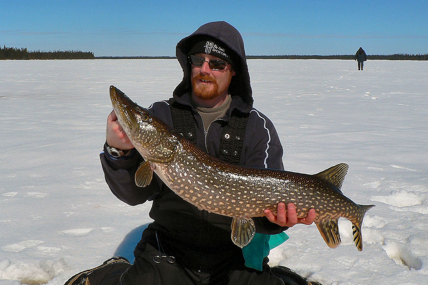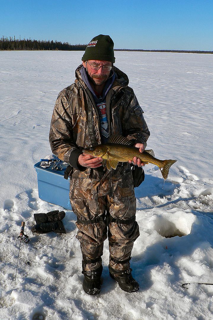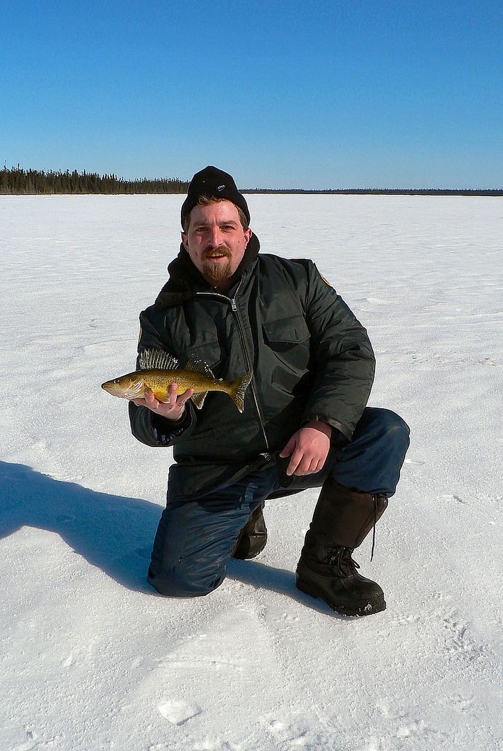 I walked off towards the shoreline about fifty meters or so from the walleye holes to start drilling for the pike, but not before Martin got his first fish too.