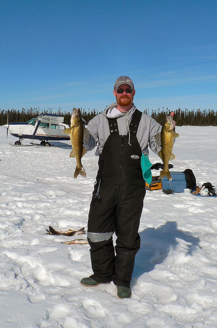 We landed on Kesagami at 9:00am. Quickly I drilled four holes in close proximity for eyes while Marty set out the gear and Kev watched on. Once finished drilling I said, “Martin, why don’t you drop down a minnow and get the first fish.” Kev was already on that though, and after about a ninety second count there Kev got a tap, and real quick he loads up and says, “HE F#$KING SMOKED IT!!!!!” Yeah, so a bit in disbelief he’s got the first fish in no time.