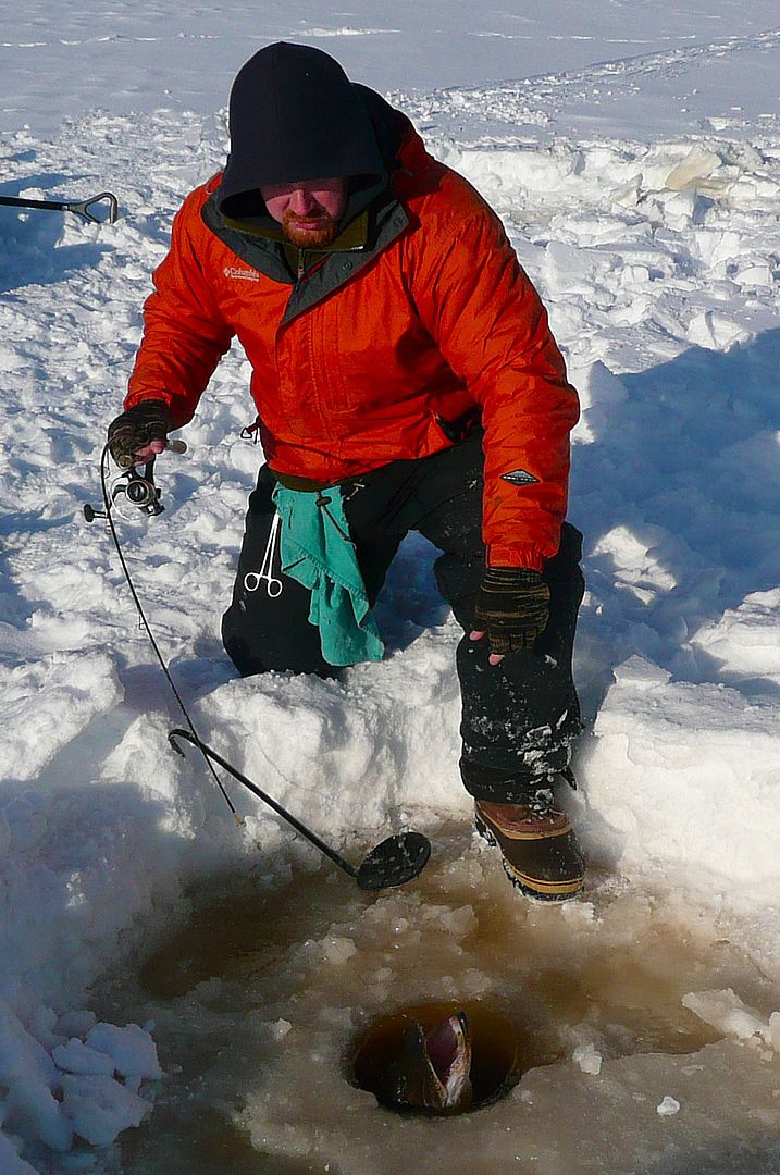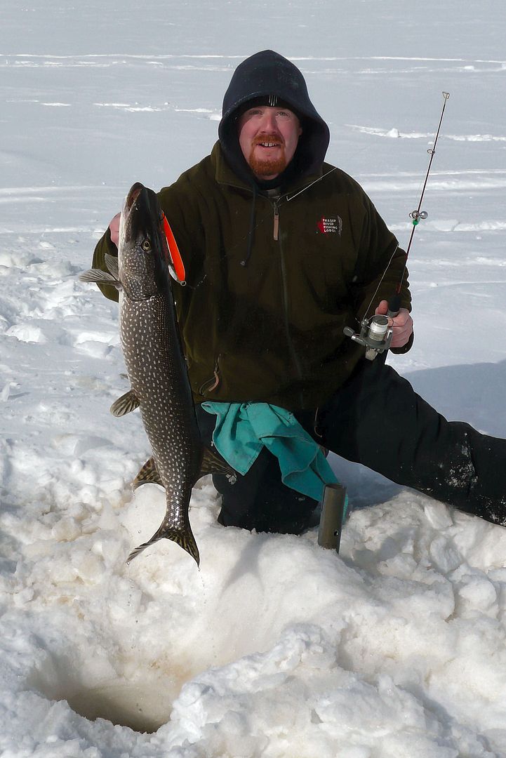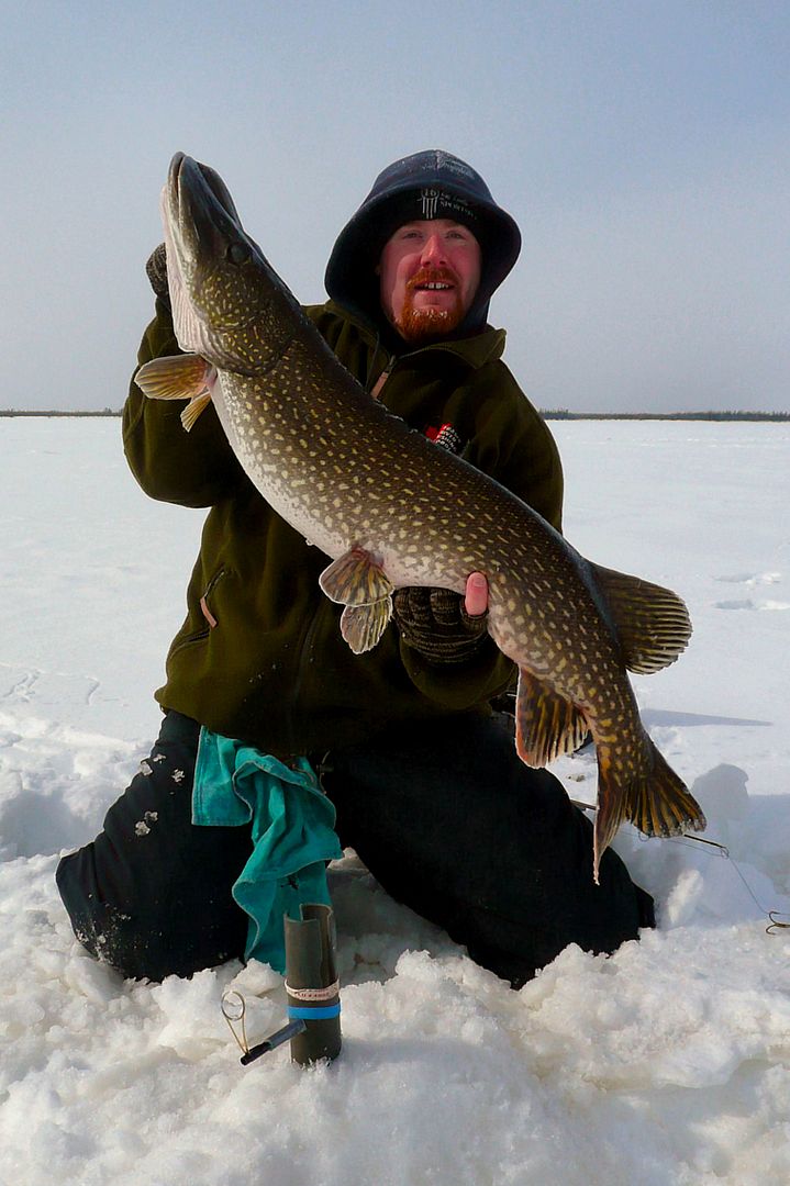 Bren and I set up. For pike, 10-12 inch fallfish on quickstrikes or chunks of fallfish on big spoons. For eyes it was jigging spoons with live shiners. The guns were loaded.