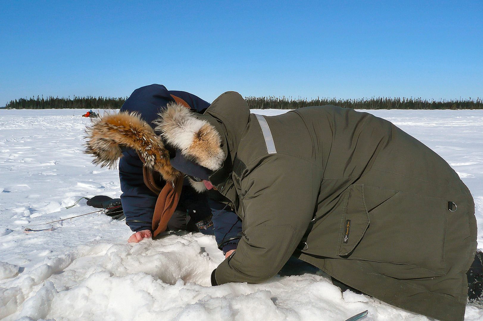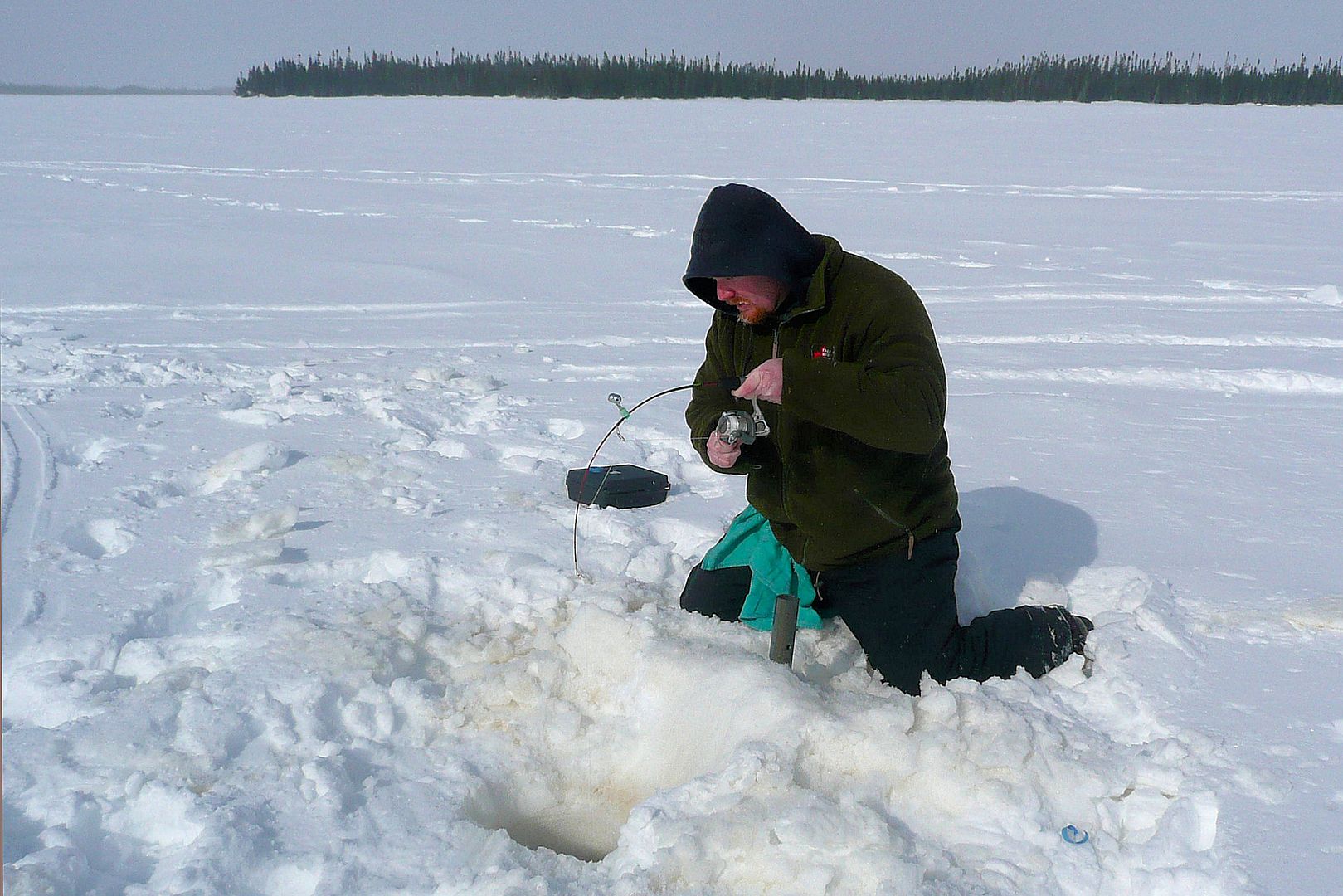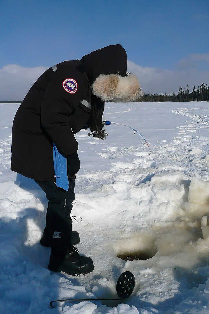In all seriousness and reality though, it was kind of a miserable weather day, gusty and cold. When we did arrive on the lake two locals out of Moose Factory were already there and fishing a big spread right down the chute in the middle of the lake. Turns out they had been camping a few days and not catching too many…. Bren and I kept our distance and drilled holes in sort of a new spot.