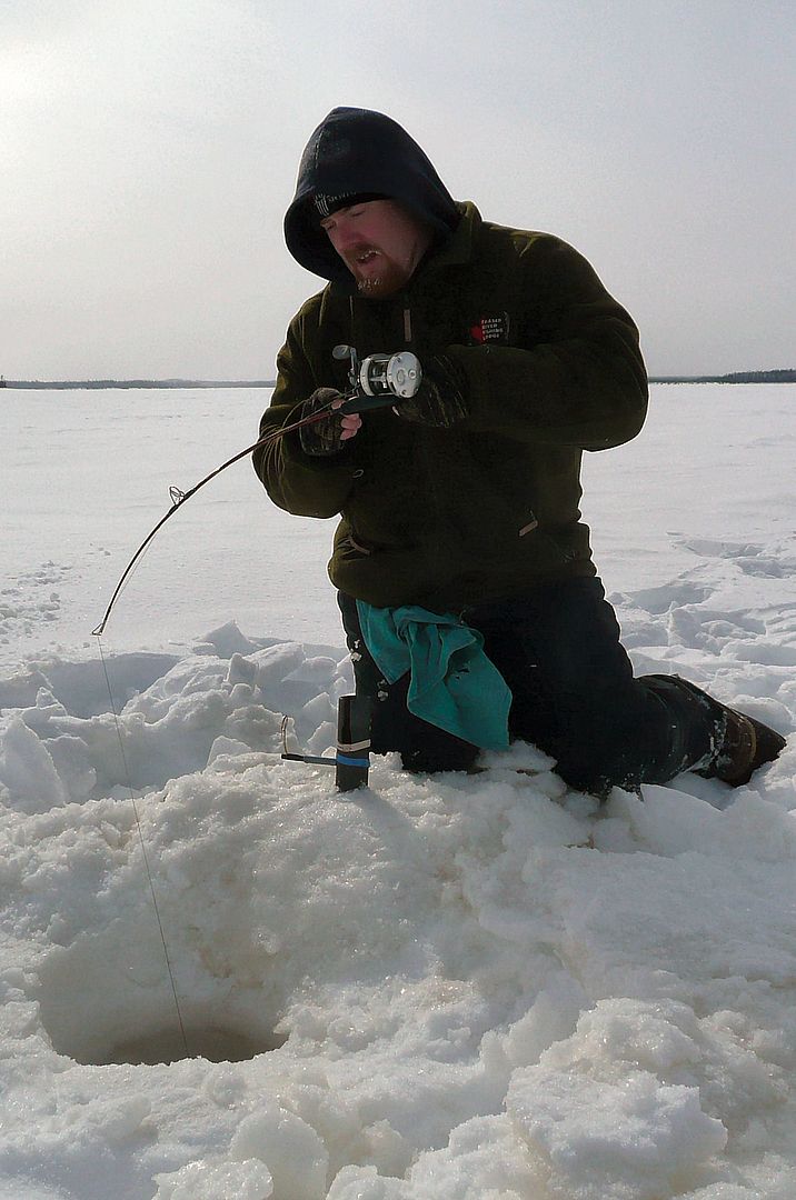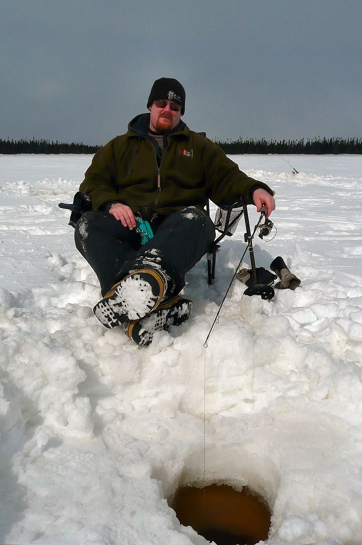 While I was drilling Bren got into the walleye within minutes. The process of setting up took me longer than I could remember. Worked up a wicked pit to back to bum drip, and with steam coming off my nog I was panting like a dog. Finally got everything finished around 10:40am. I have a method, but it seems the arse is slowing down as the years go by.