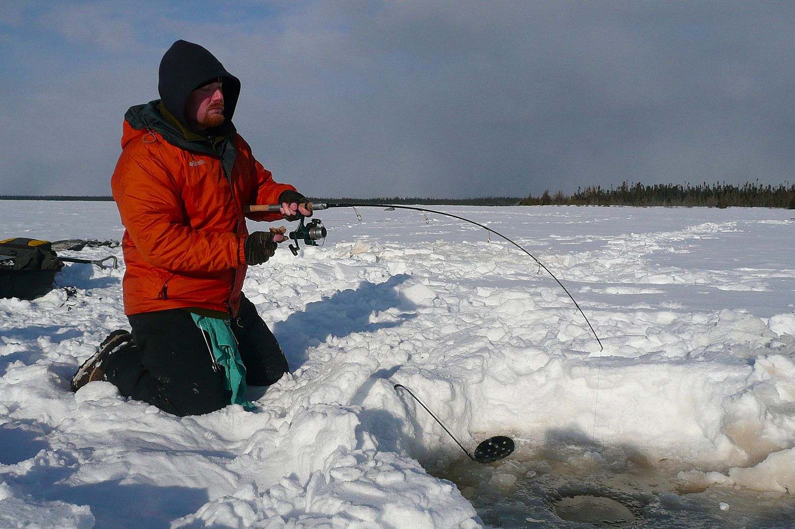 After the hour and a half process of getting all things set-up I was exhausted and a bit discouraged. A couple of the tipdown holes for pike seemed way too shallow and, Bren wasn’t hitting the walleyes in good speed. I redrilled a couple pike holes in time then decided we’d stick it out and see what happens.