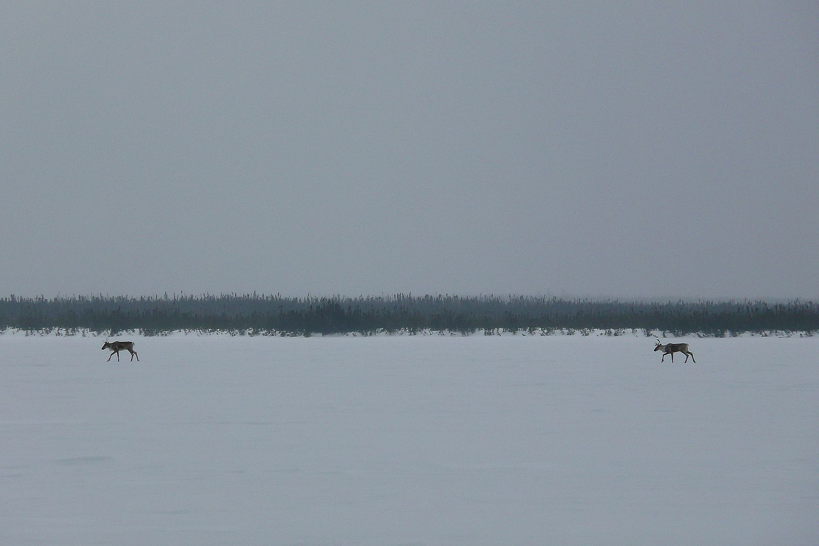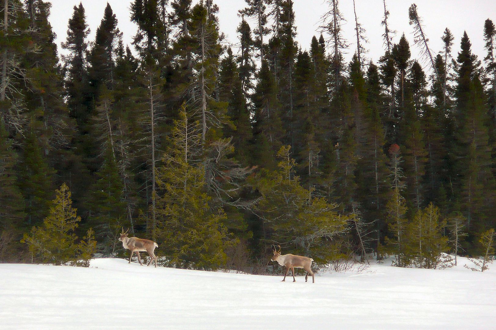 I laughed about my mistake. Those hadn’t been snowmobiles but instead two lone caribou traveling in the distance. Thing is, those beasts can really move. Before long they were staring our group down, as well as the other two Moose Factory fellas; and one man had snow-shoed quick to get his gun. The bous for a moment remained too far for a shot, then they began moving towards the treeline and us.
