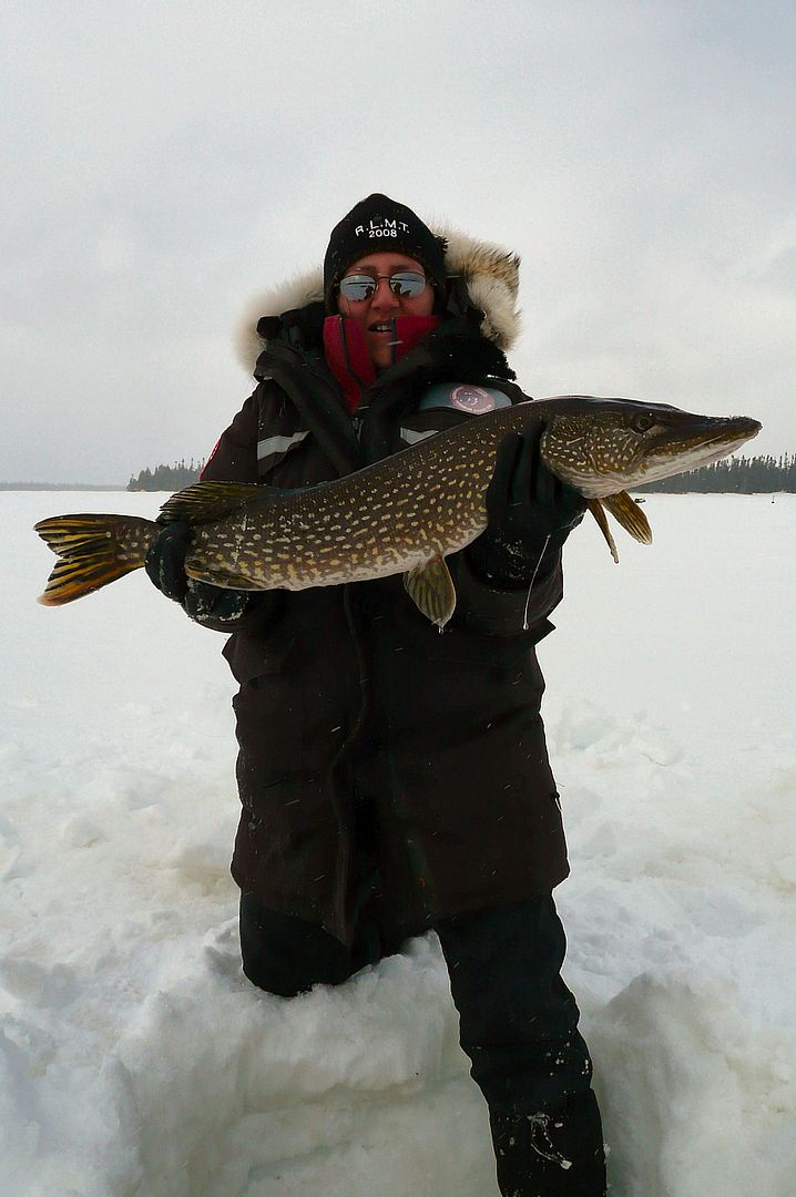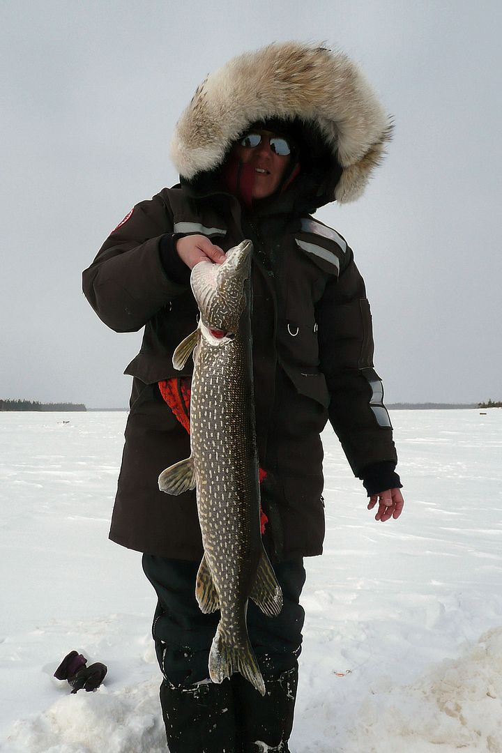 Choosing her jiggin’ rod equipped with a small spoon and ten enormous pounds of Power Pro she slapped the first pike in the mouth and said, “you likey pikey? Whan summore!”
