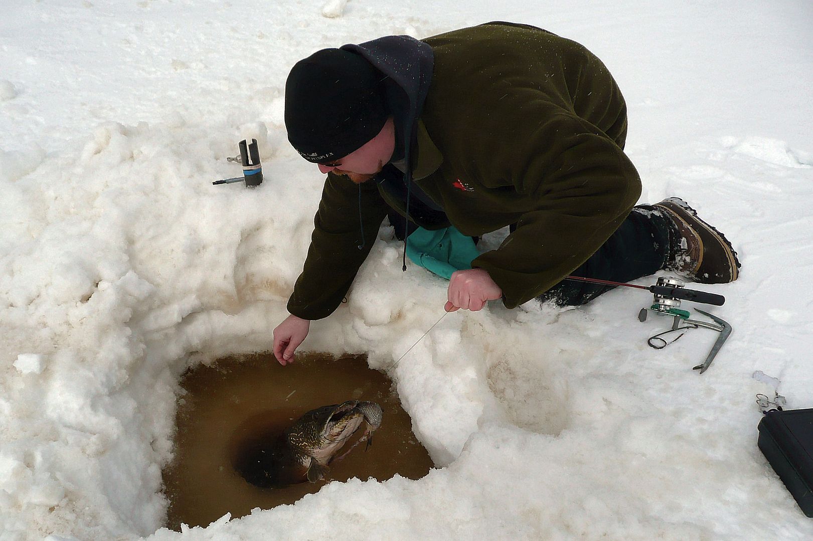 Big Brutha pike did in fact want a piece. He was all like Pike-Fu and Pikarate under the ice. A few times I felt his kicks and blows when the wussy wasn’t trying to run from me. May have lost an imaginary tooth but after a spirited battle my “Chuckness” was not to be “fawked-with,” and I did what any good fishing Ninja God would do… I pinned him in the hole then smacked him in the kisser.