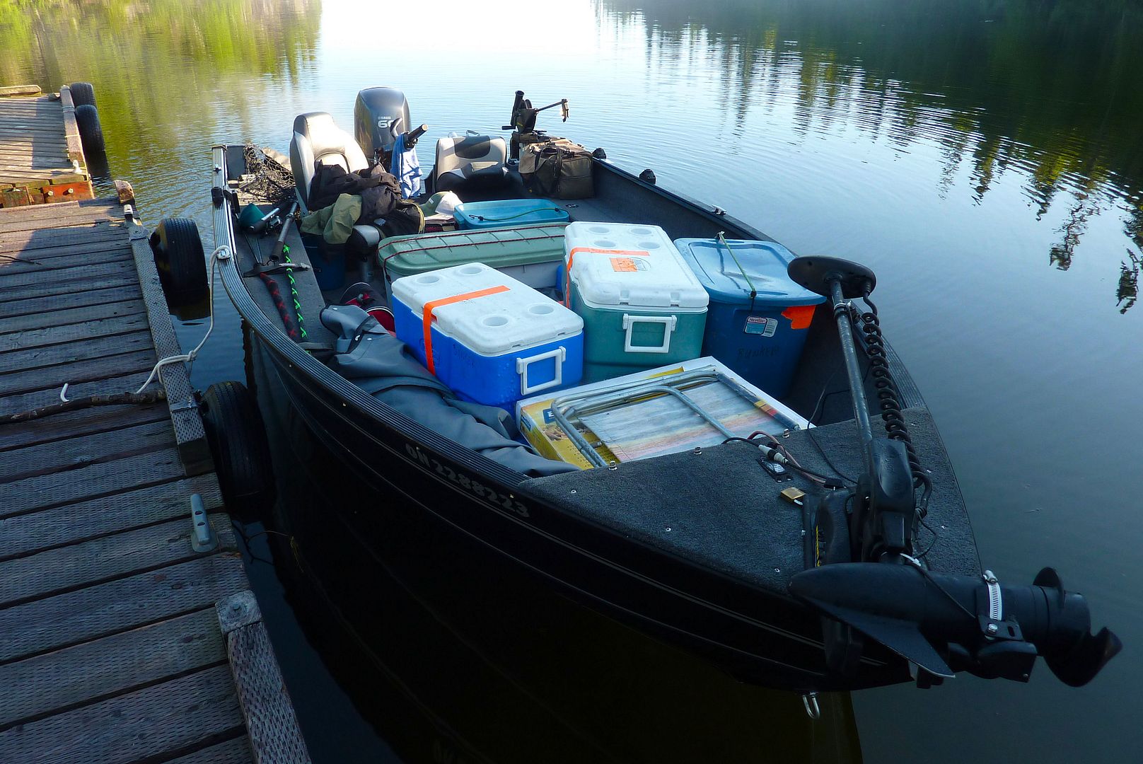I have often gone on long trips and used the tiller much like an electric trolling motor. Idling for hours and hours isn’t ideal for carbon build up but end of the day taking a fast run can burn things out. Without any way while camping to charge up an electric motor, their have been trips the MinnKota has long gone through its batteries and I am left with just the tiller for the week. No problem! The extended tiller handles nowadays, the room to stand at the rear of the boat, buddies can have the deck up front to cast from, I’ll take the back porch and control to myself. Over the years, I’ve learned to steer with my knees when need be, freeing up both hands for the rod and reel. I had also built for the Rebel XL and now the new and bigger ProGuide, a sturdier and wider flooring option, with some extra add ons too…