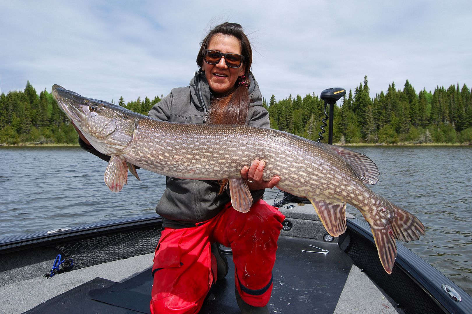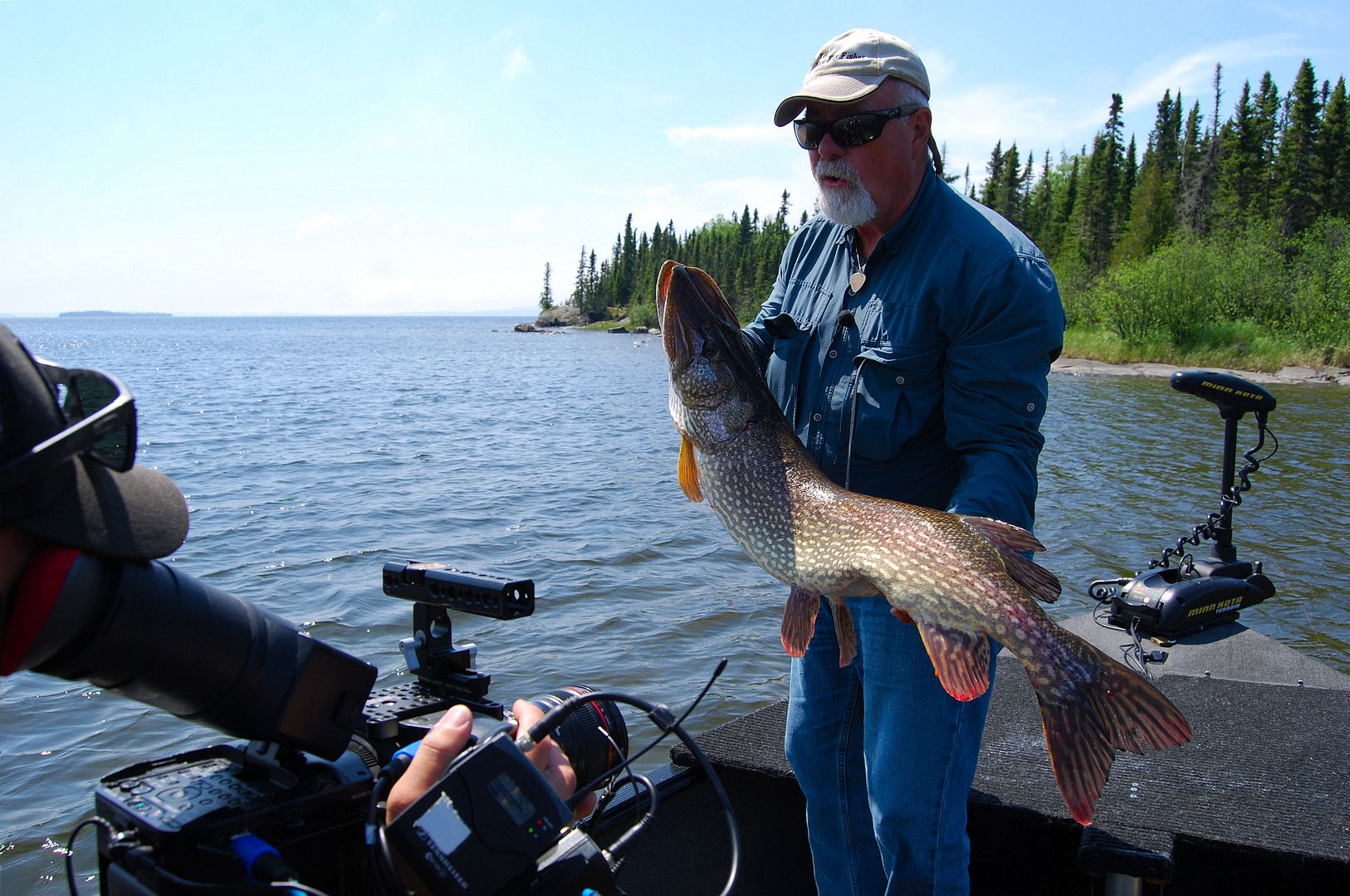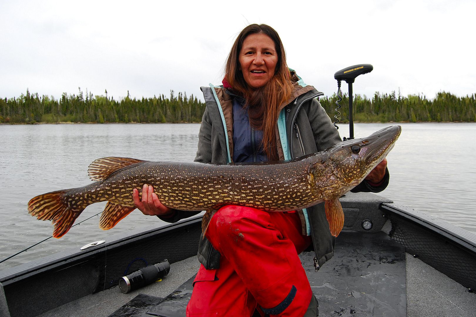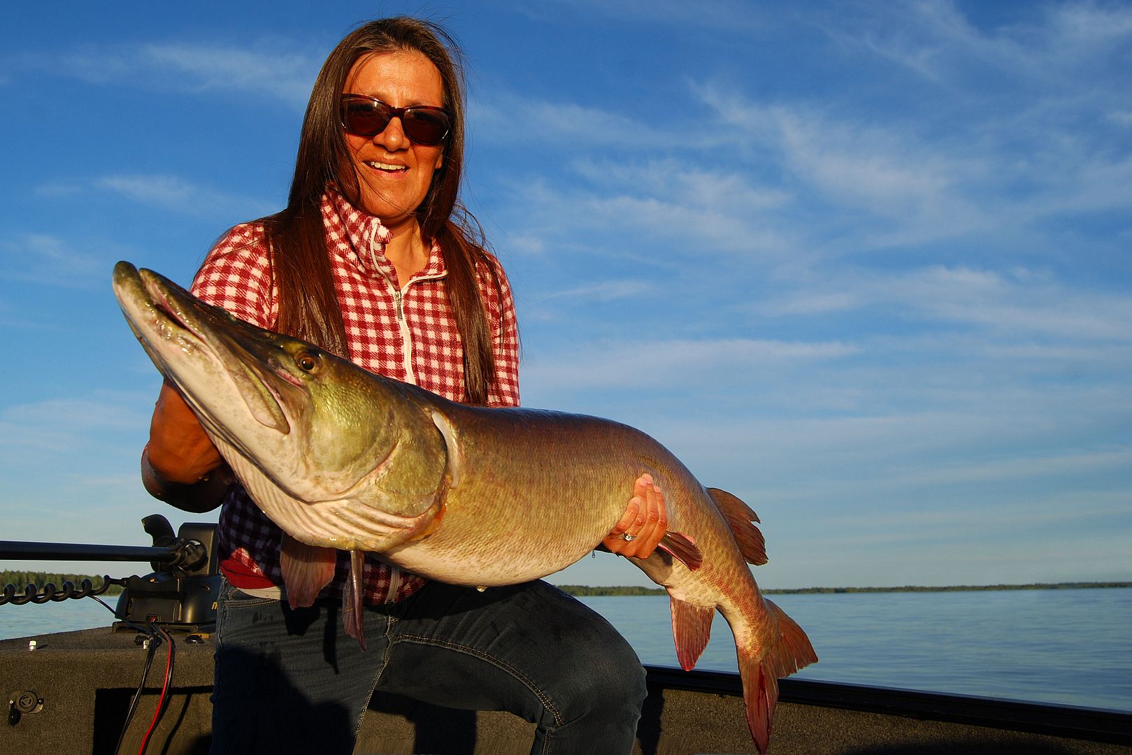 Four of us in the boat casting, dancing around, moving and shaking all over, unimpeded, it was a glorious evening while my wife and our friends doubled and even tripled up repeatedly on big northerns. Sometimes two and even three fish at a time were hooked up, then coming in the boat having their picture taken. Anglers were leaning over the gunnels to release, tools, nets and rods getting passed around… Had someone recorded this and played it back later it would have appeared to be chaos. The fish were biting so fast and often; bigger pike difficult to tame, that all in the Lund became lost in the excitement. Figuring ahead of time the bite was gonna rock, I had left all but my own seat out of the boat, allowing a completely clear platform for everyone to move freely. For the first hour of this fun I didn’t even take a cast. The Lund ProGuide newer to me, when not helping the girls with their fish, taking pictures and maintaining boat control, sitting in my chair away from flying hooks I watched on as the other’s enjoyed the tillers advantage. And it was then too, that I was reminded of a time when in the smaller Rebel we had a camera man, the film and fishing gear and a T.V. host who’s job it was to fly fish pike. I remember Bill commented then, how the room and set-up was just perfect for fly fishing. “You could have a barn dance in this boat,” another gas station passerby admiring the Lund once said.